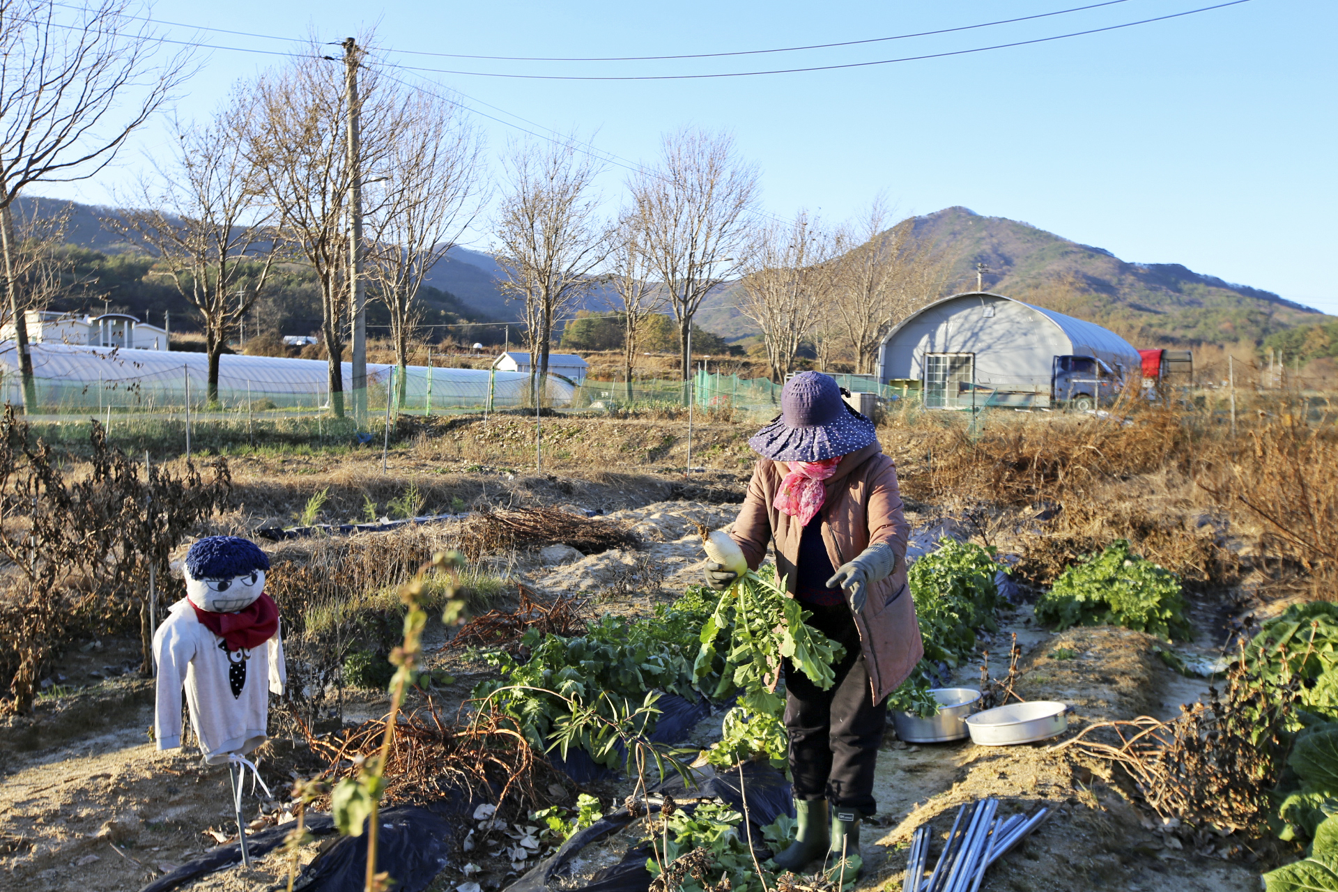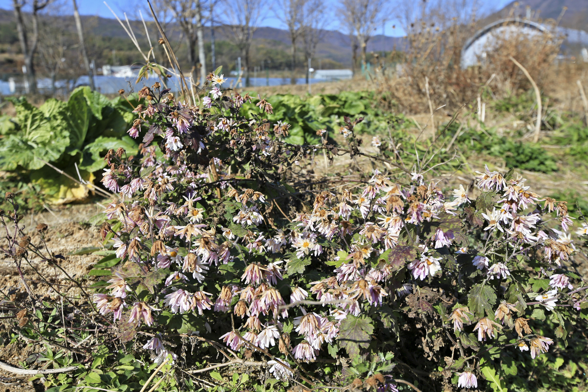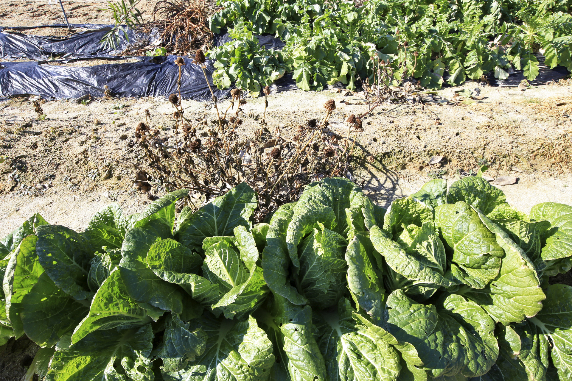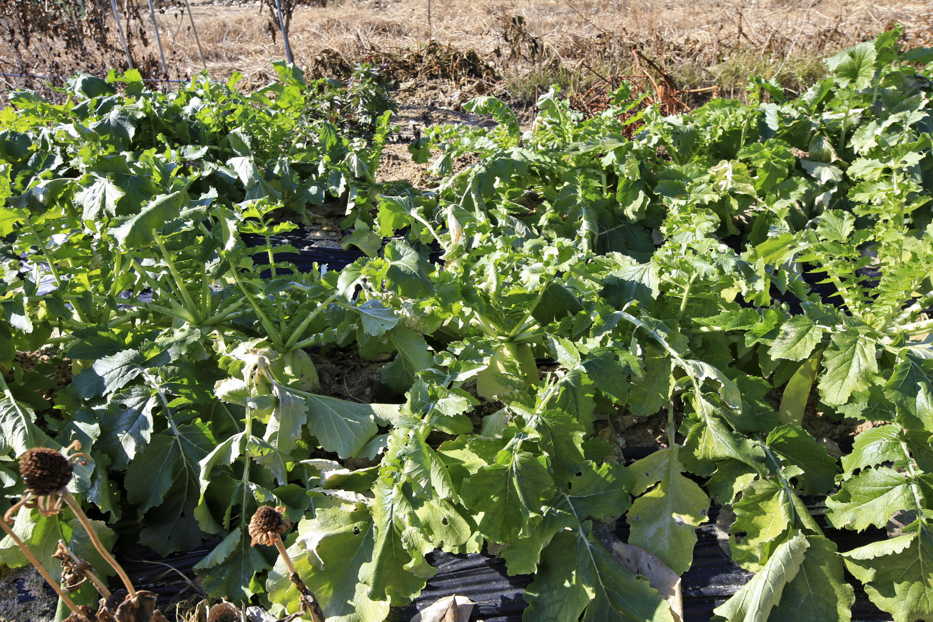 무는 잎사귀에 추위 피해를 입은 흔적이 남아있다. 주변 밭을 둘러보니 무는 수확을 하였던지 아니면 비닐이나 천막지를 덮어 놓았다.