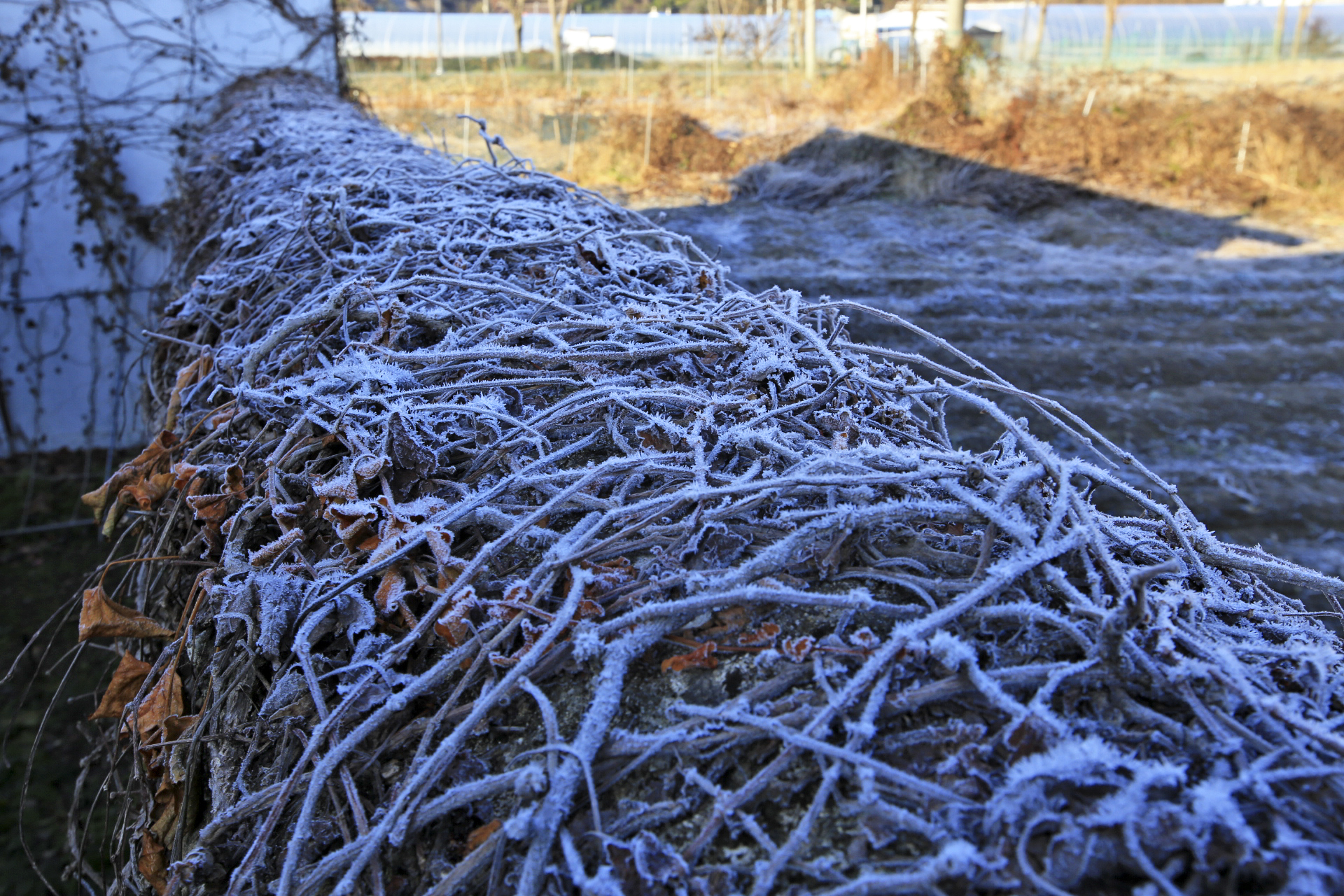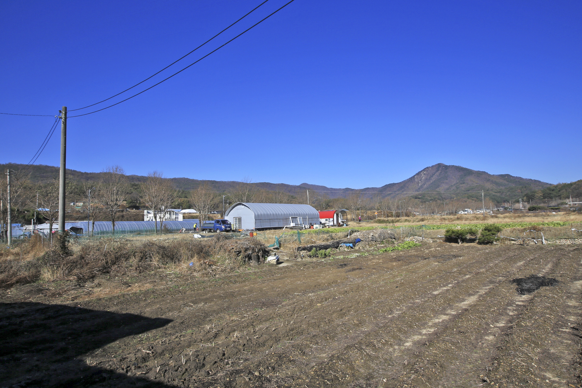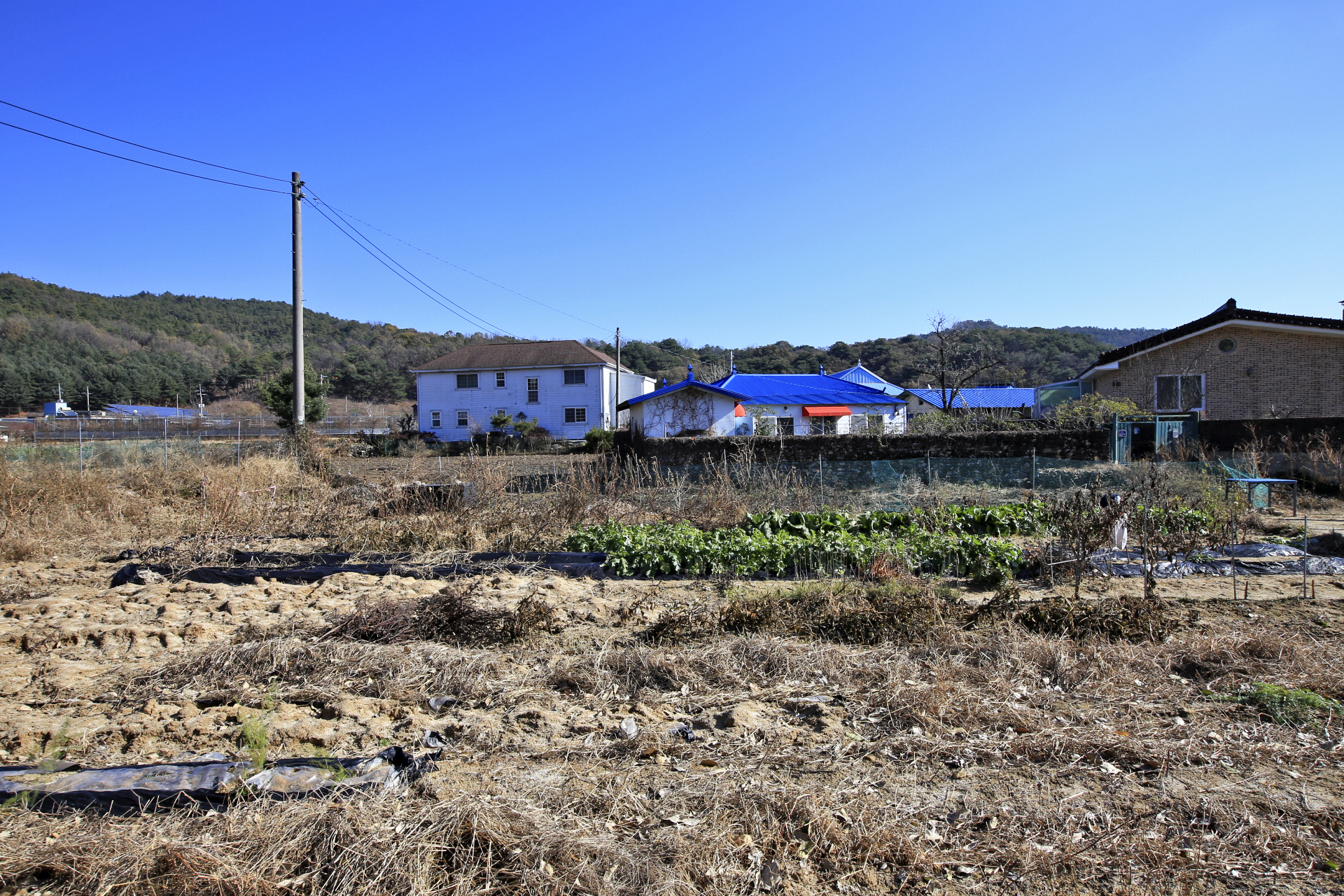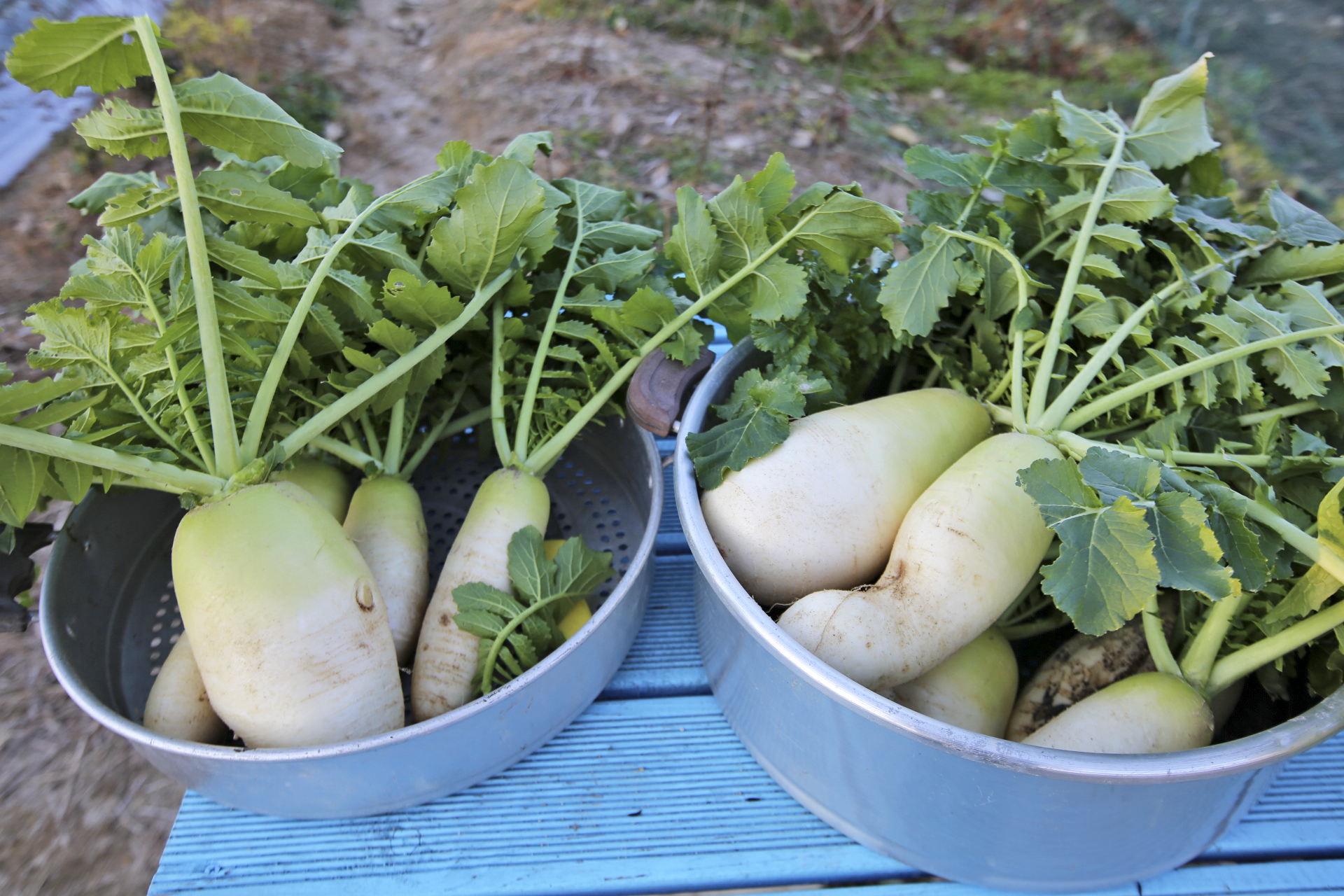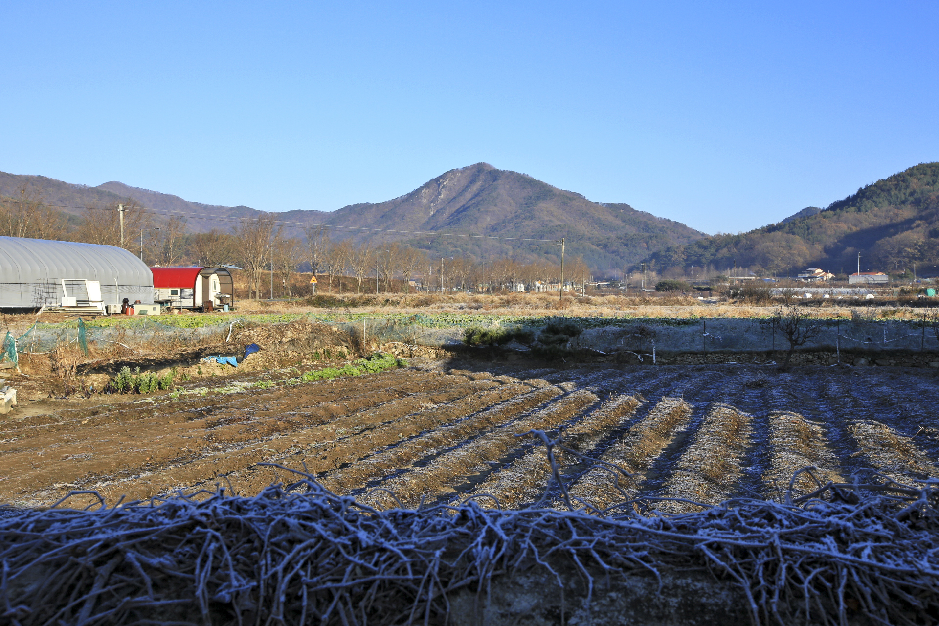 무는 잎사귀에 추위 피해를 입은 흔적이 남아있다. 주변 밭을 둘러보니 무는 수확을 하였던지 아니면 비닐이나 천막지를 덮어 놓았다.