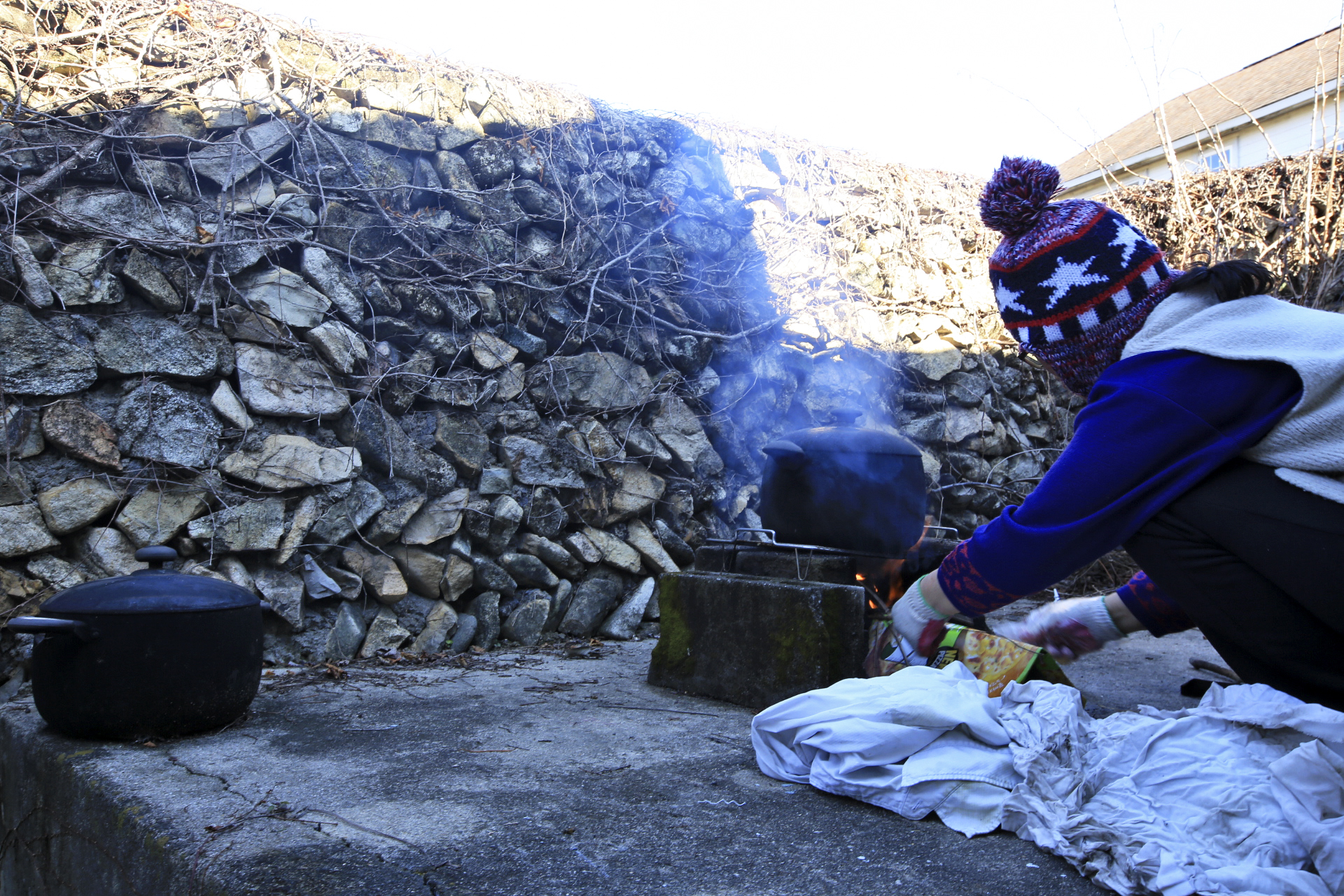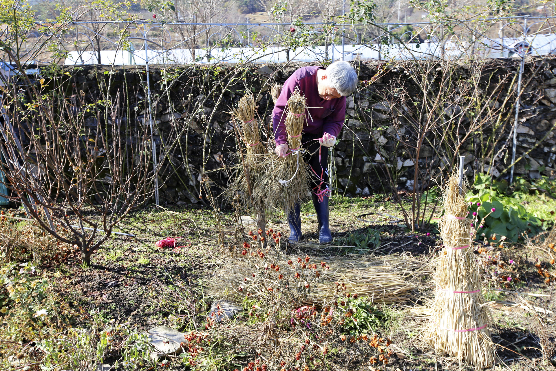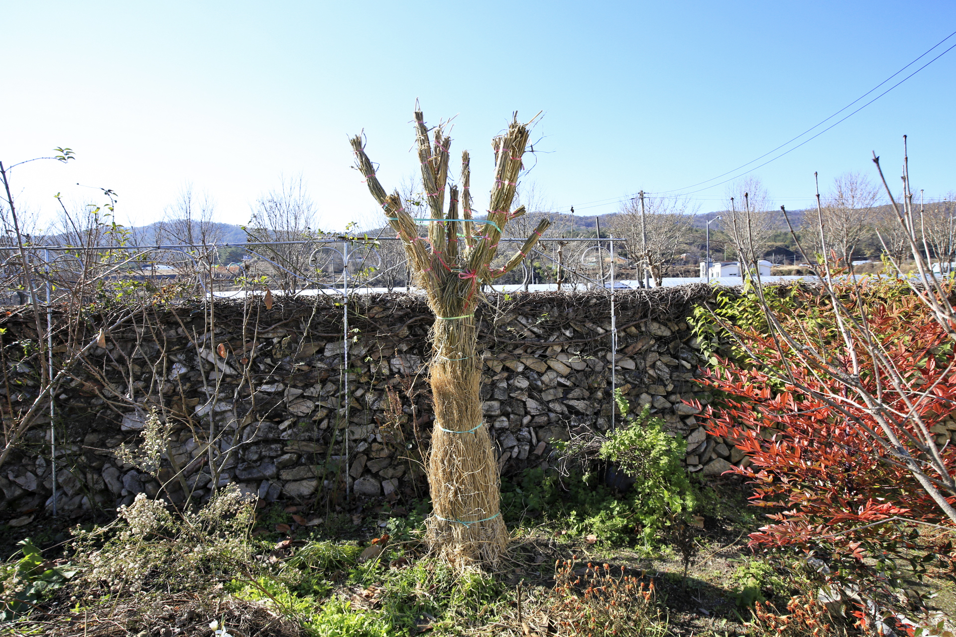 전지작업을 약식으로 한 후 전에 이ㅇ승에게서 얻어 온 볏짚으로 배롱나무의 보온작업을 하였다.