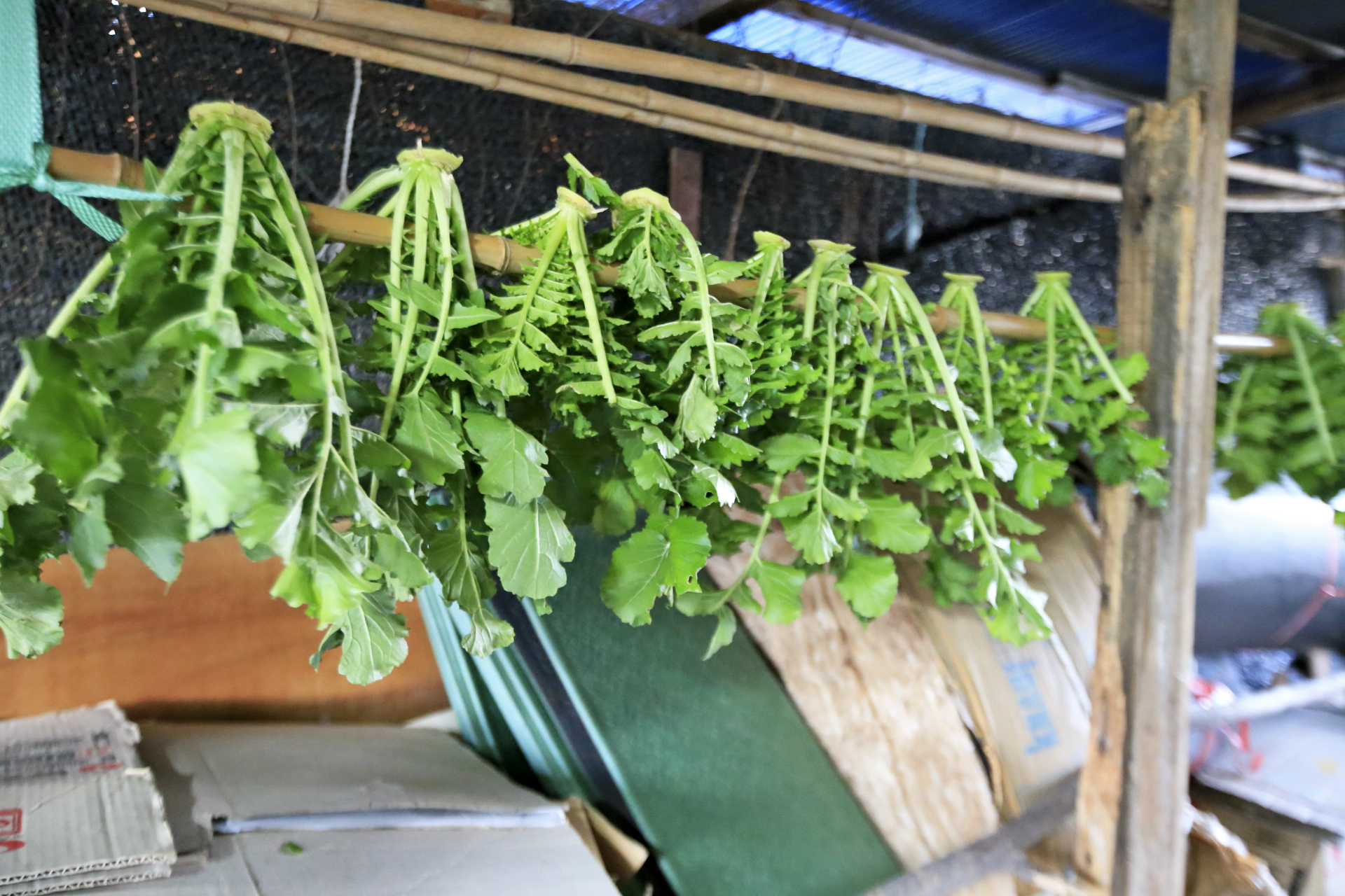 장아찌를 담기 위해서 뽑은 무에서 무청을 잘라내서 뒤꼍 장대에 걸어두었다.