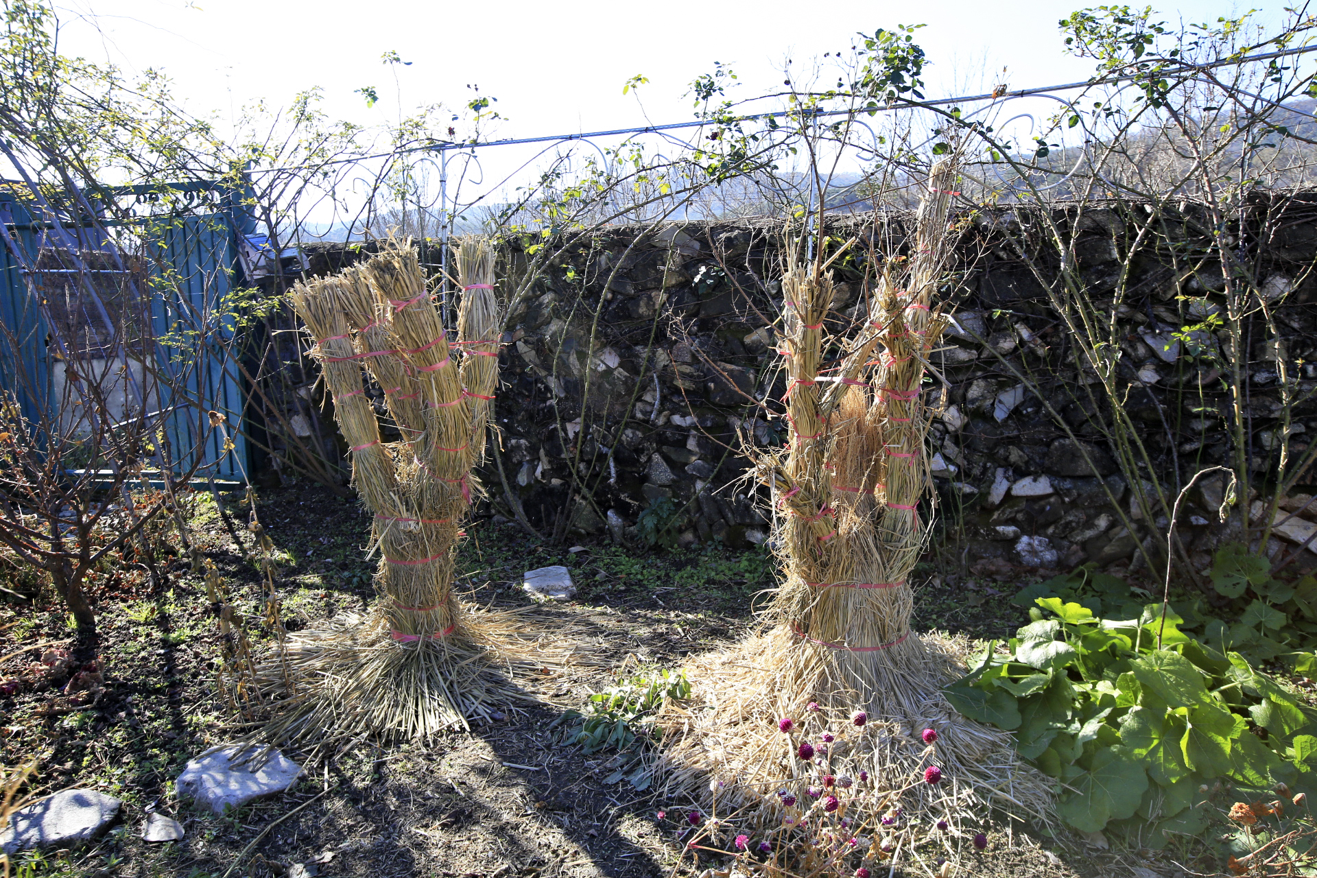 좌측 배롱나무(1)는 초봄에 본채 전실공사 중에 옮겨 심은 나무로 예전처럼 가지 전체를 볏짚으로 둘러쌌다. 우측 배롱나무(2)는 몇 년 전에 구입하여 심었는데 동해를 입어서 본줄기는 죽고 뿌리가 살아있어서 새로운 줄기가 자라서 간신해 명맥을 유지하고 있다. 이런 상태가 2년차 인데 올해는 가지의 끝부분은 노출시키고 하부만 볏짚으로 둘러쌌다. 며칠 전 서울식물원에 갔을 때 일부러 배롱나무는 보온작업을 어떻게 해 주었는지 보고 왔는데 가지의 끝 부분이 노출된 상태이기에 같은 방법으로 작업해 주었다. 하부는 작년에 마늘을 심고 이엉을 역어서 덮어주었던 것을 활용하였다. 올해 배롱나무는 꽃이 피기는 하였지만 제대로 돌보지 못하고 방치상태였기에 간신해 명맥을 유지하는 수준이었다.