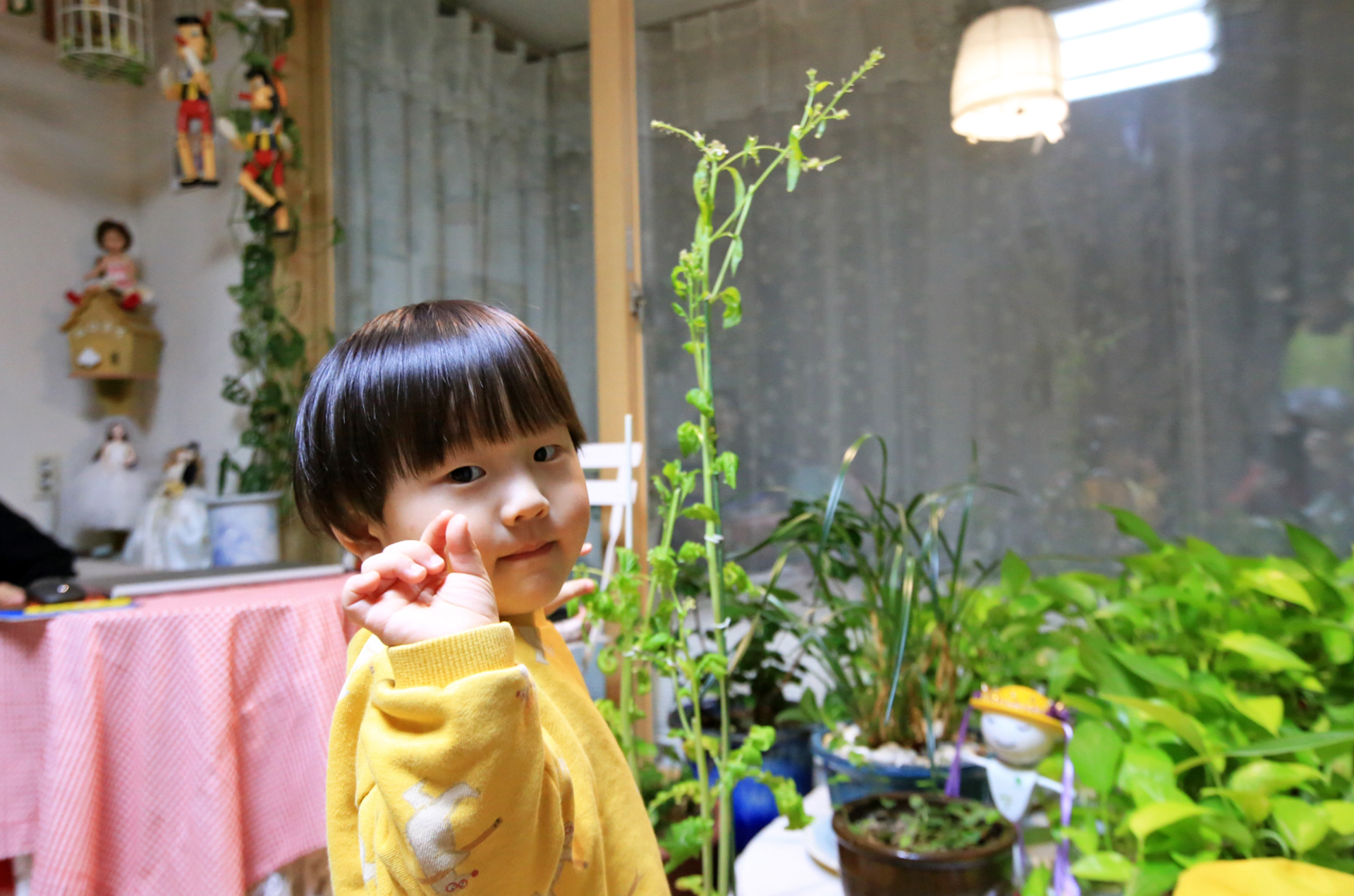무를 화분에 심은 것이 자라서 장다리가 나오고 빈약하지만 꽃이 피었다. 햇빛을 제대로 받지 못해서인지 꽃대가 연약한 상태로 키만 자라서 Seung 보다 더 크다.