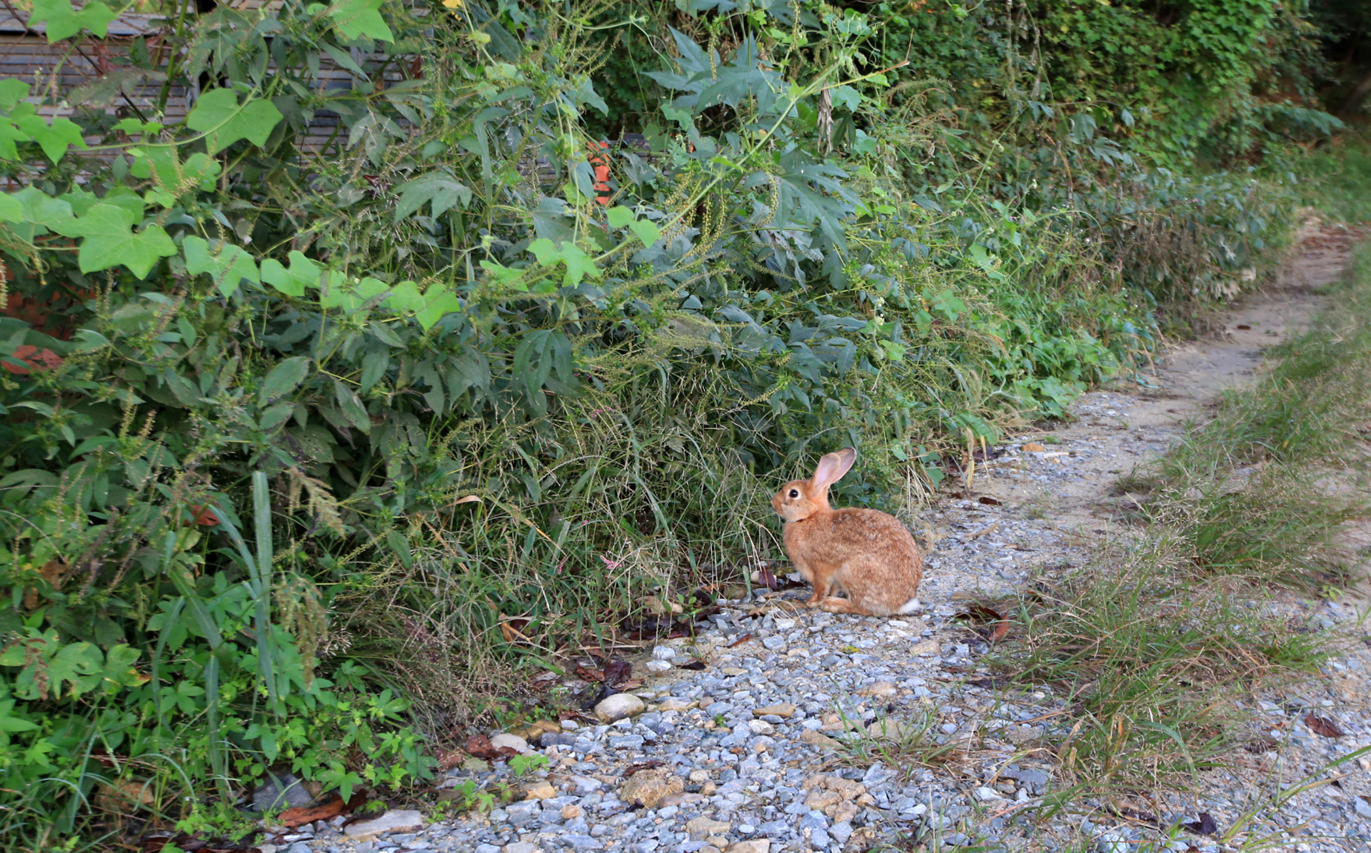 오랜만에 토끼를 본다. 가까이 접근해도 움찔거리기는 하지만 도망가지는 않는다. 몸에 문제가 있거나 아픈가? 지나가는 순간까지 가만히 있다가 풀숲으로 피한다. 집토끼인 듯한데 왜 여기에 있는지 모르겠다.
