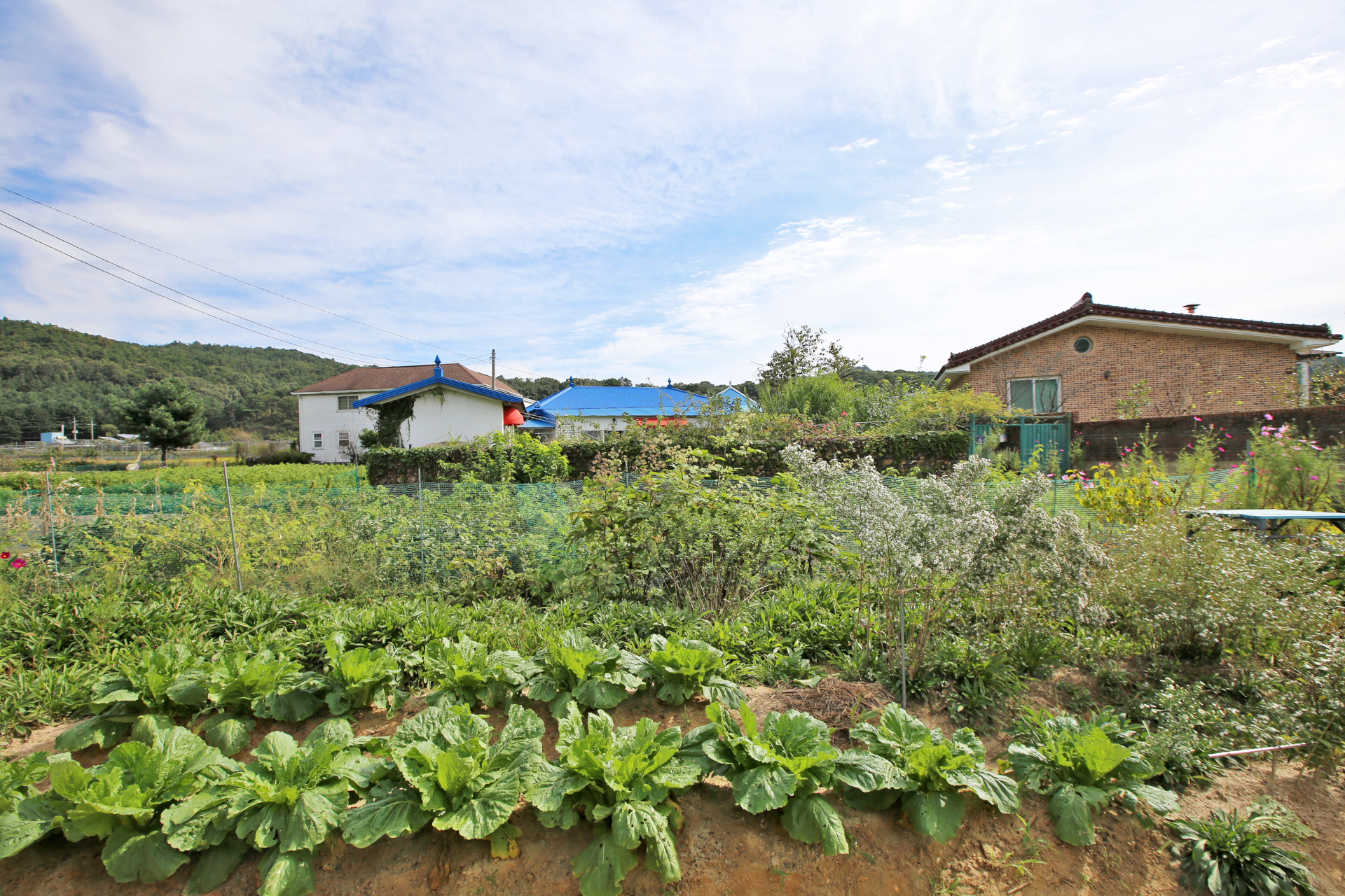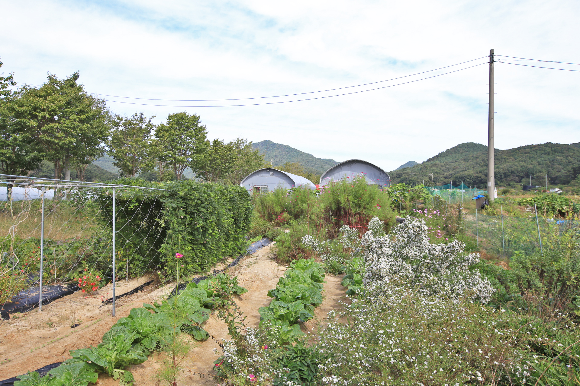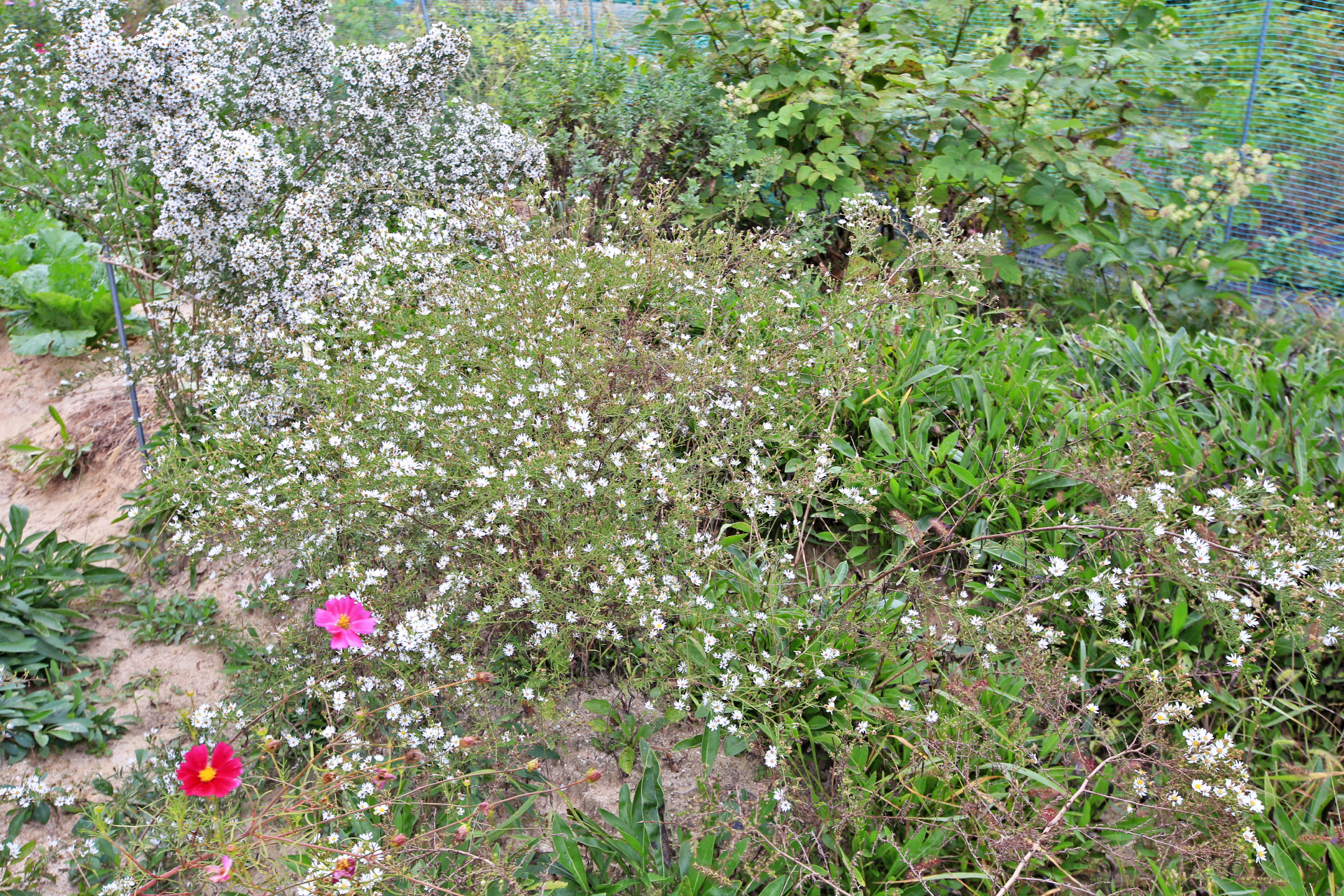 쑥부쟁이 지지대 손보기 전 : 앞밭 귀퉁이에 있는 쑥부쟁이가 쓰러져서 김장배추에 거치적거리기에 얼마 전에 지지대를 설치하였었다. 그런데 꽃대를 꼿꼿하게 세웠더니 한 묶음처럼 되어서 부자연스럽다.