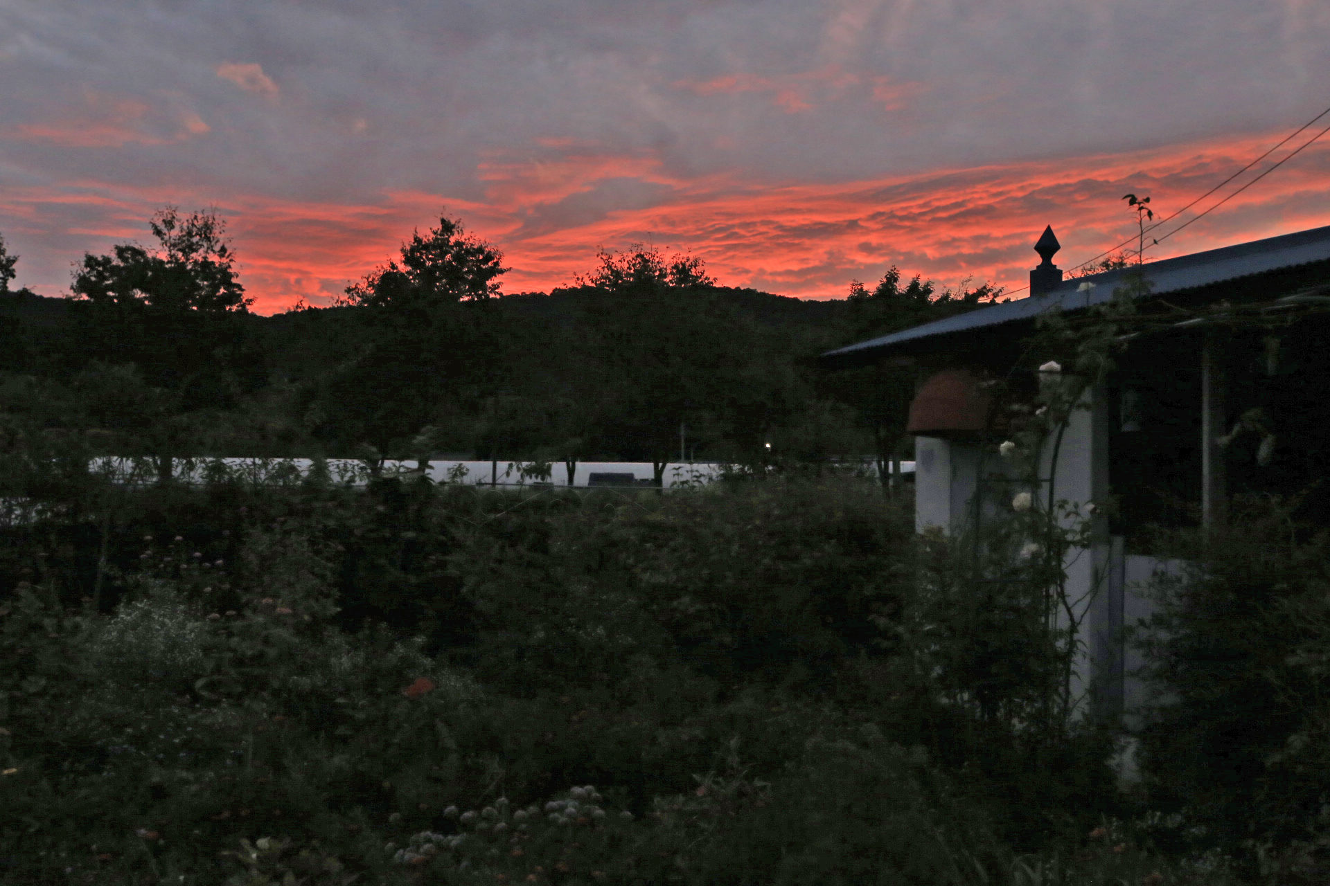 낮에 비가 조금 내렸다. 아침노을이 진하였는데 저녁노을도 진하다.
