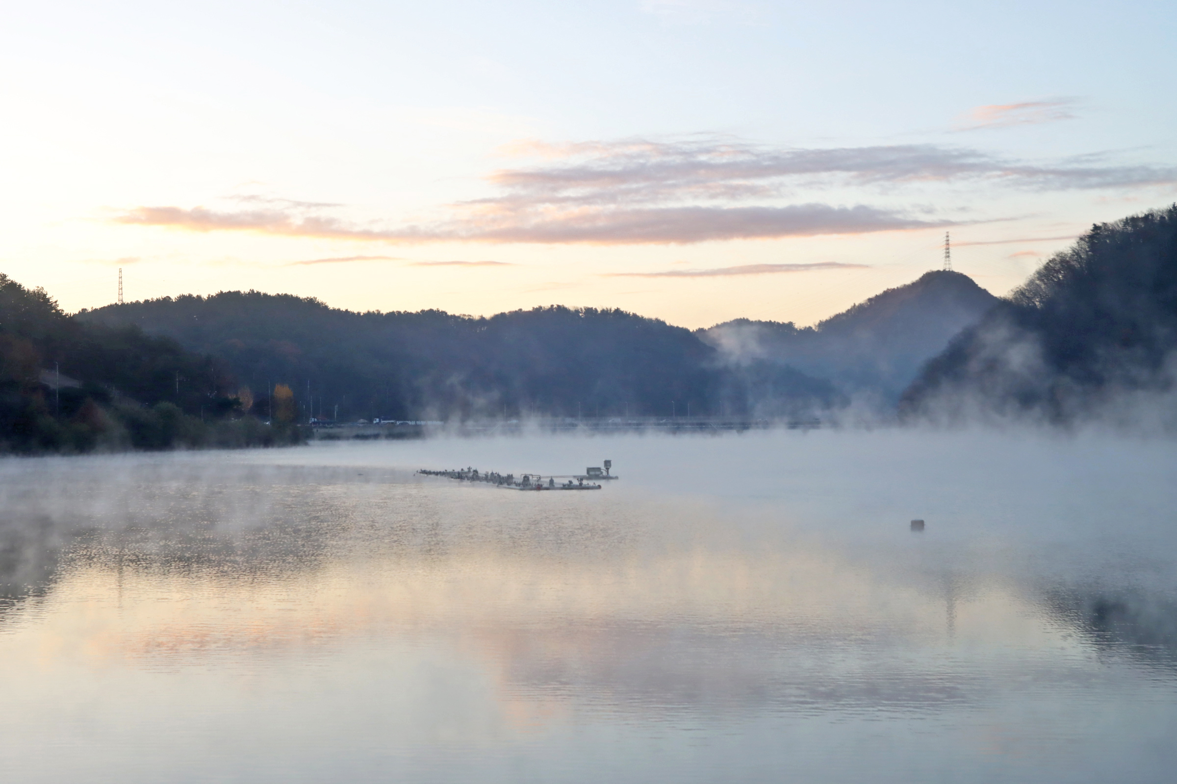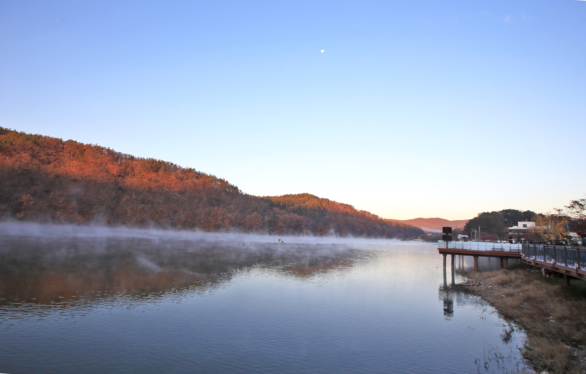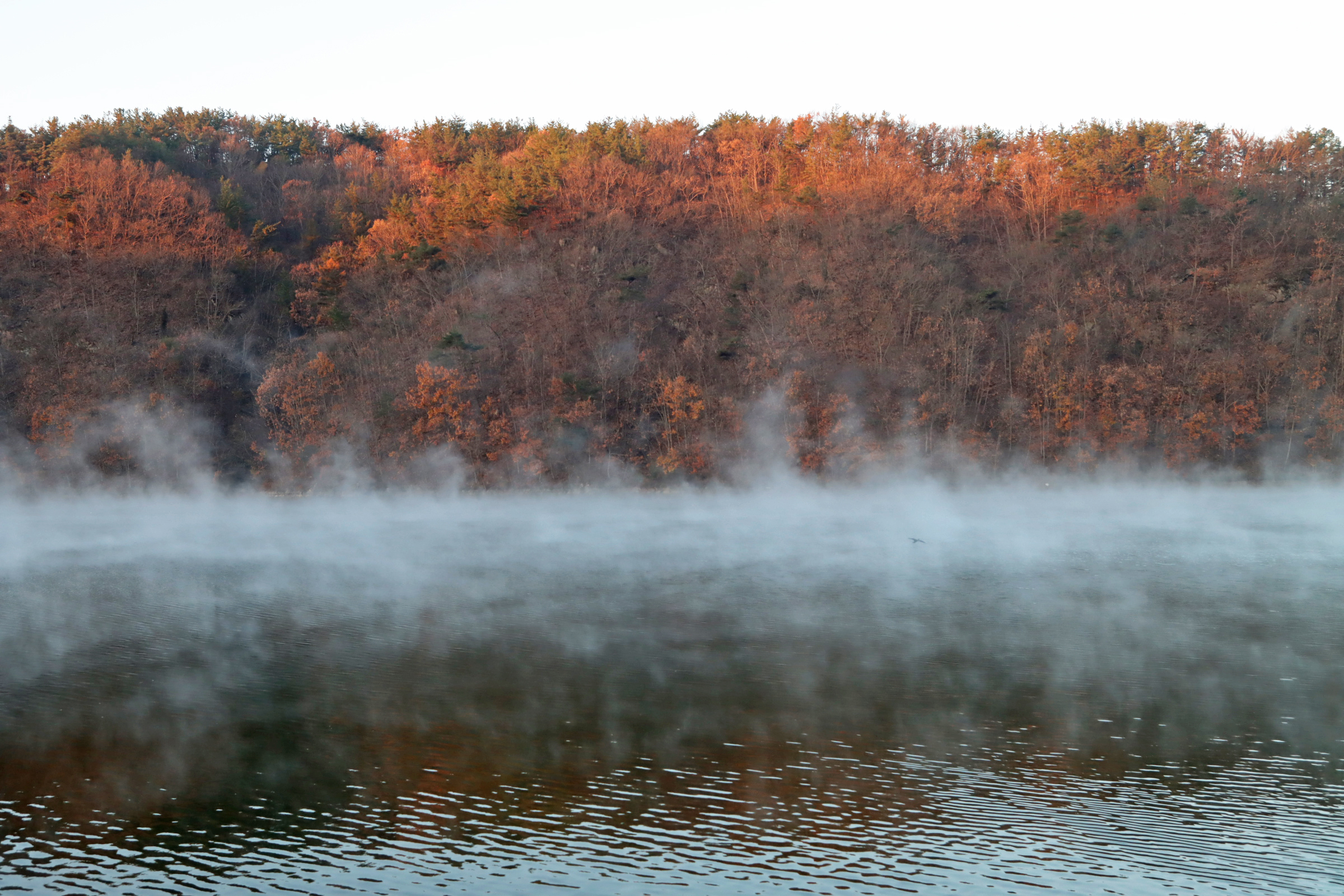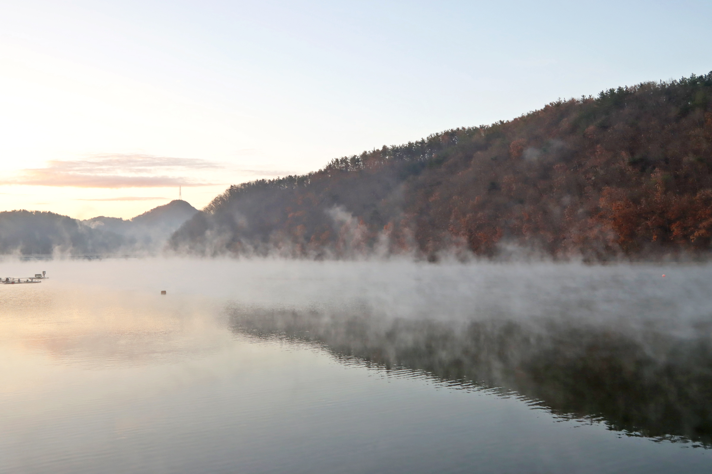 담양 메타세쿼이아 가로수길로 단풍 구경하러 가는 길에 지나가는 방동저수지에서 잠시 머물렀다. 성북동은 올가을 들어서 가장 추운 -5.6℃이었다. 은행나무 단풍은 많이 떨어졌고 심하지는 않지만 물안개가 피었다. 해가 뜨기 시작한다.