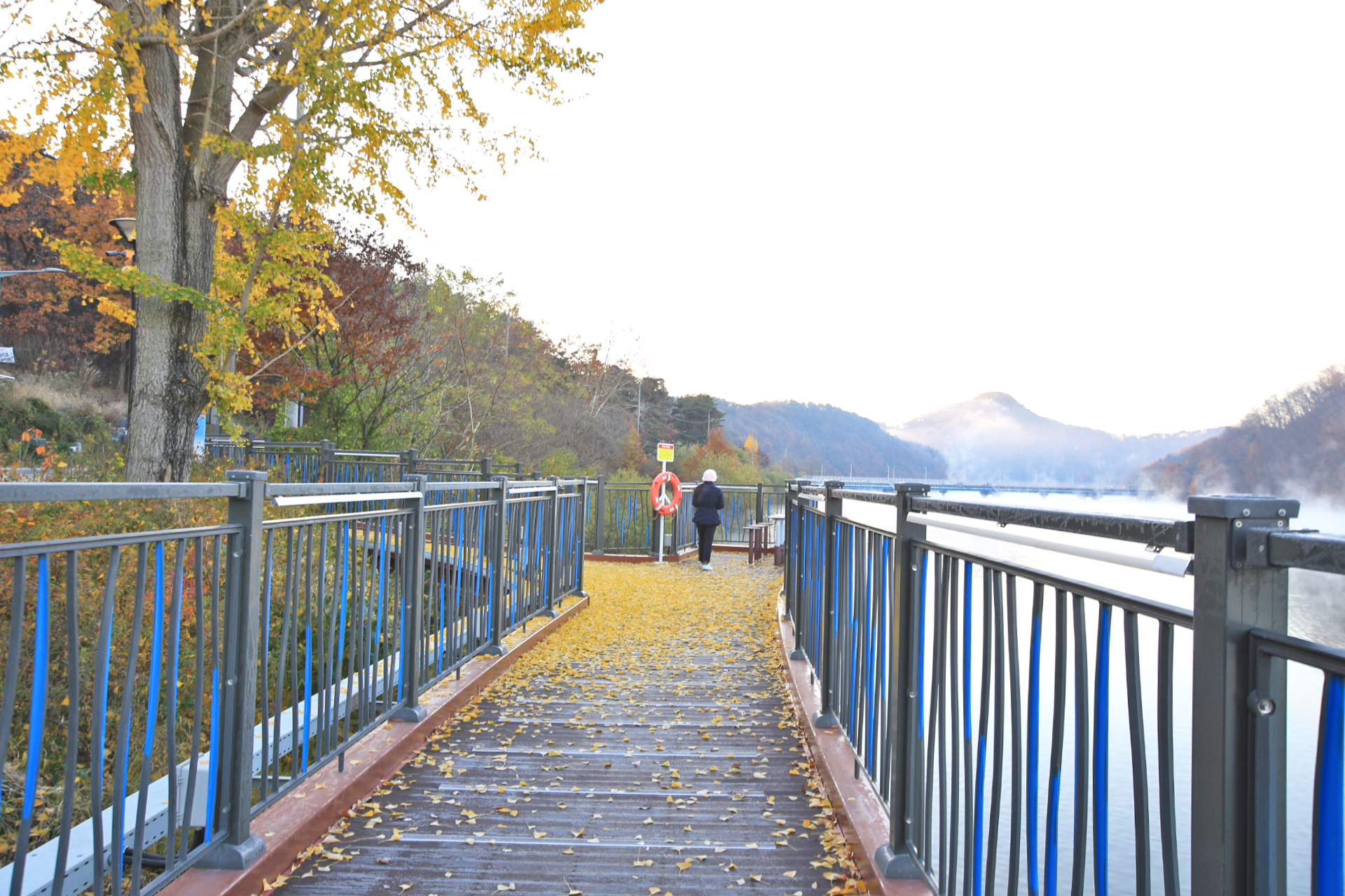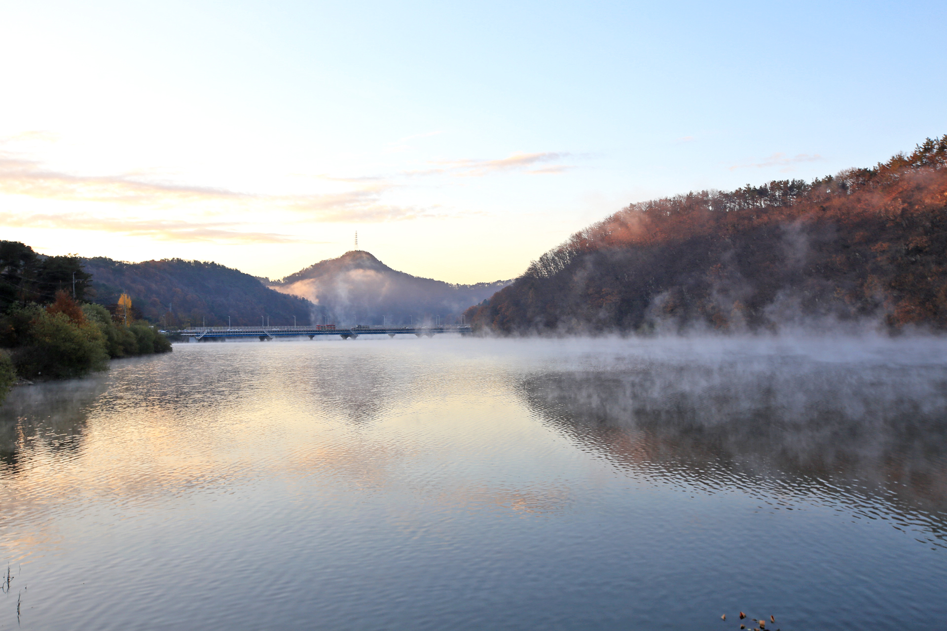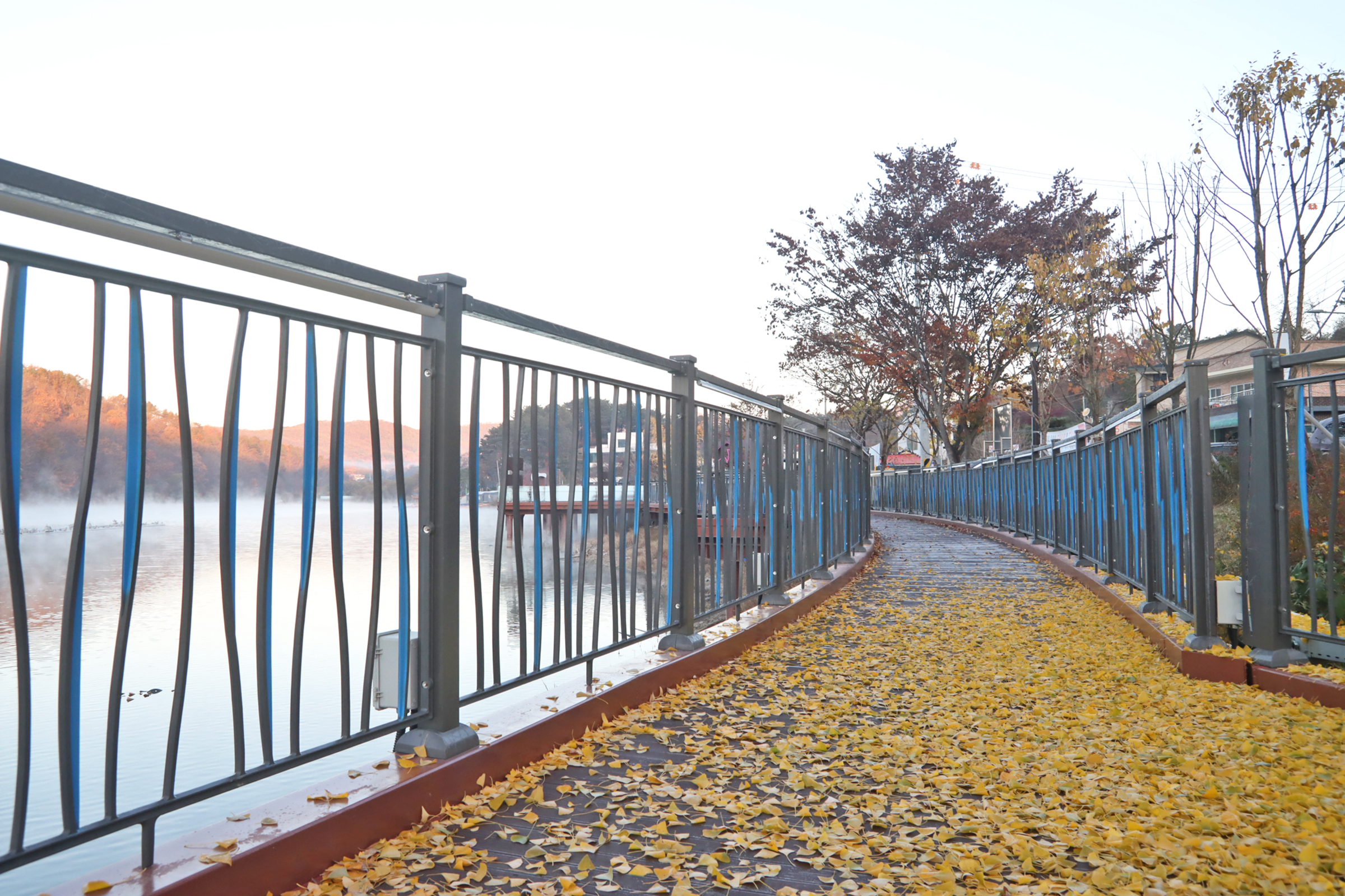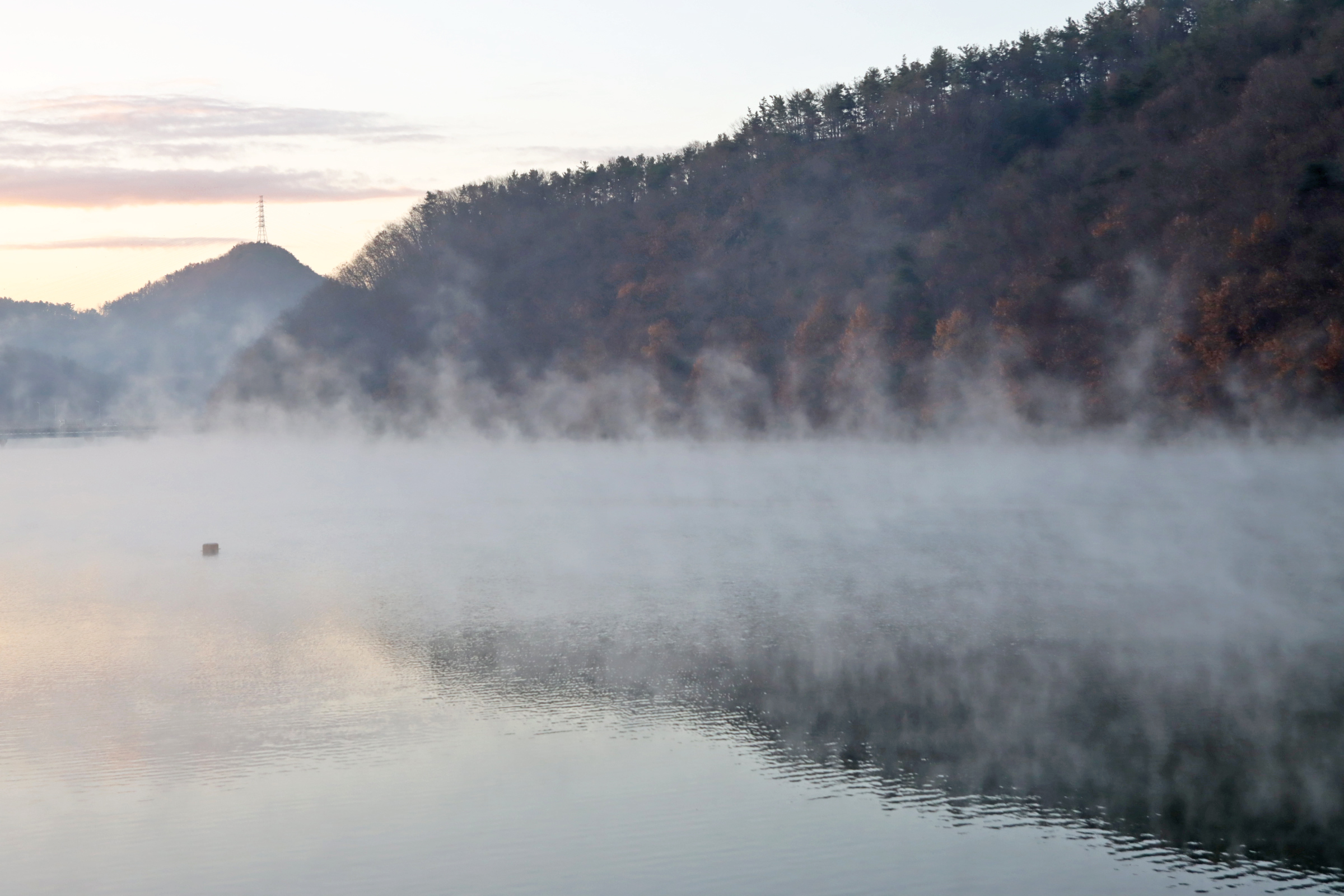 담양 메타세쿼이아 가로수길로 단풍 구경하러 가는 길에 지나가는 방동저수지에서 잠시 머물렀다. 성북동은 올가을 들어서 가장 추운 -5.6℃이었다. 은행나무 단풍은 많이 떨어졌고 심하지는 않지만 물안개가 피었다. 해가 뜨기 시작한다.