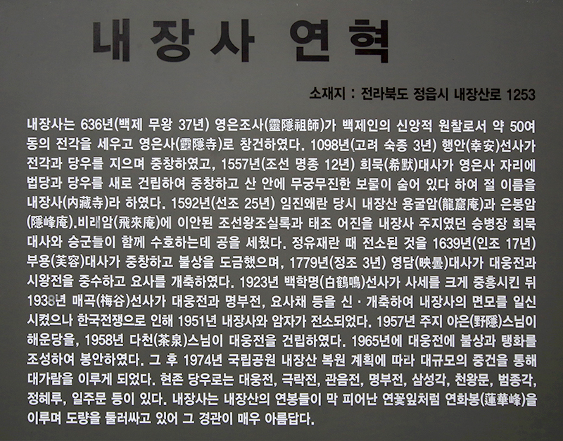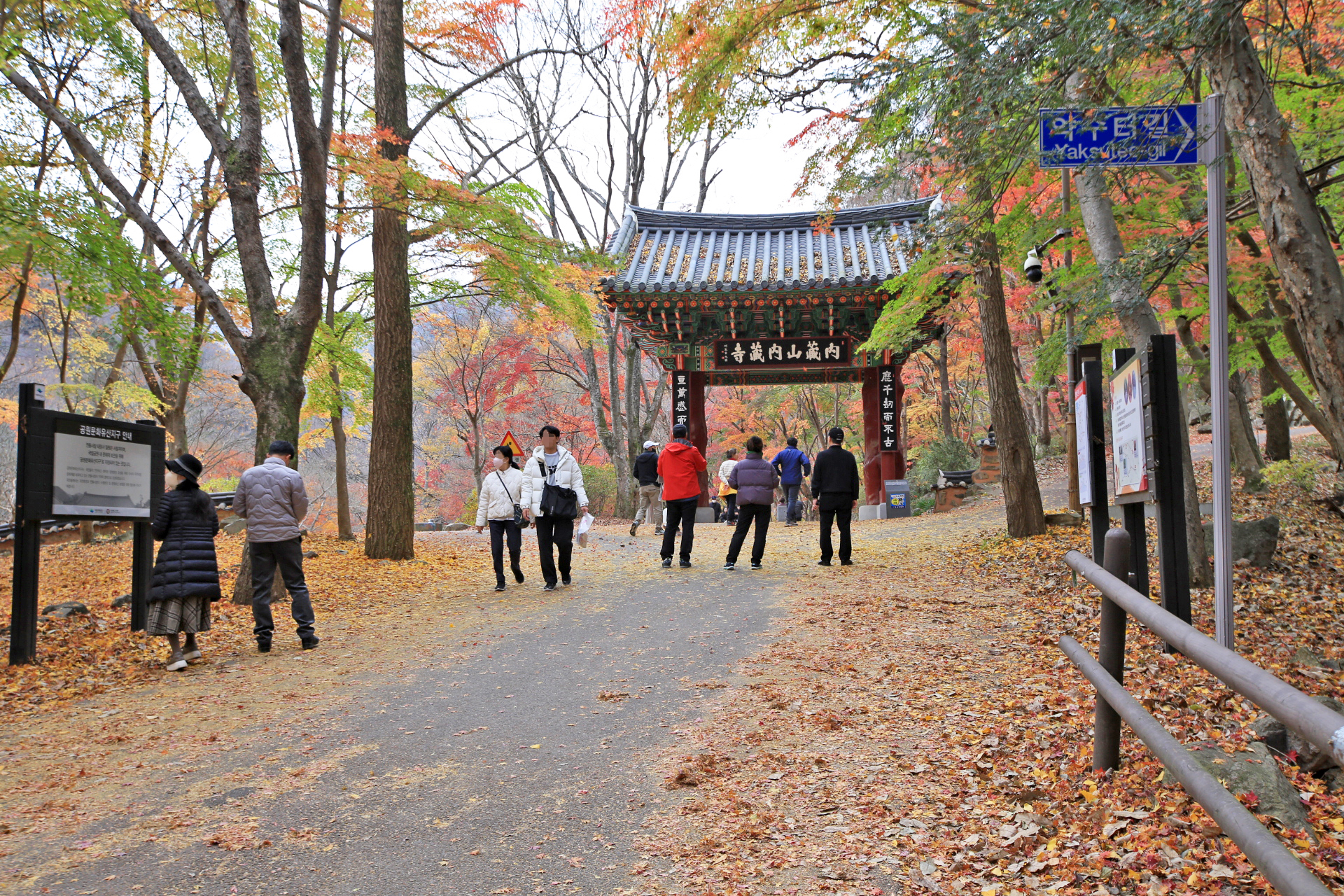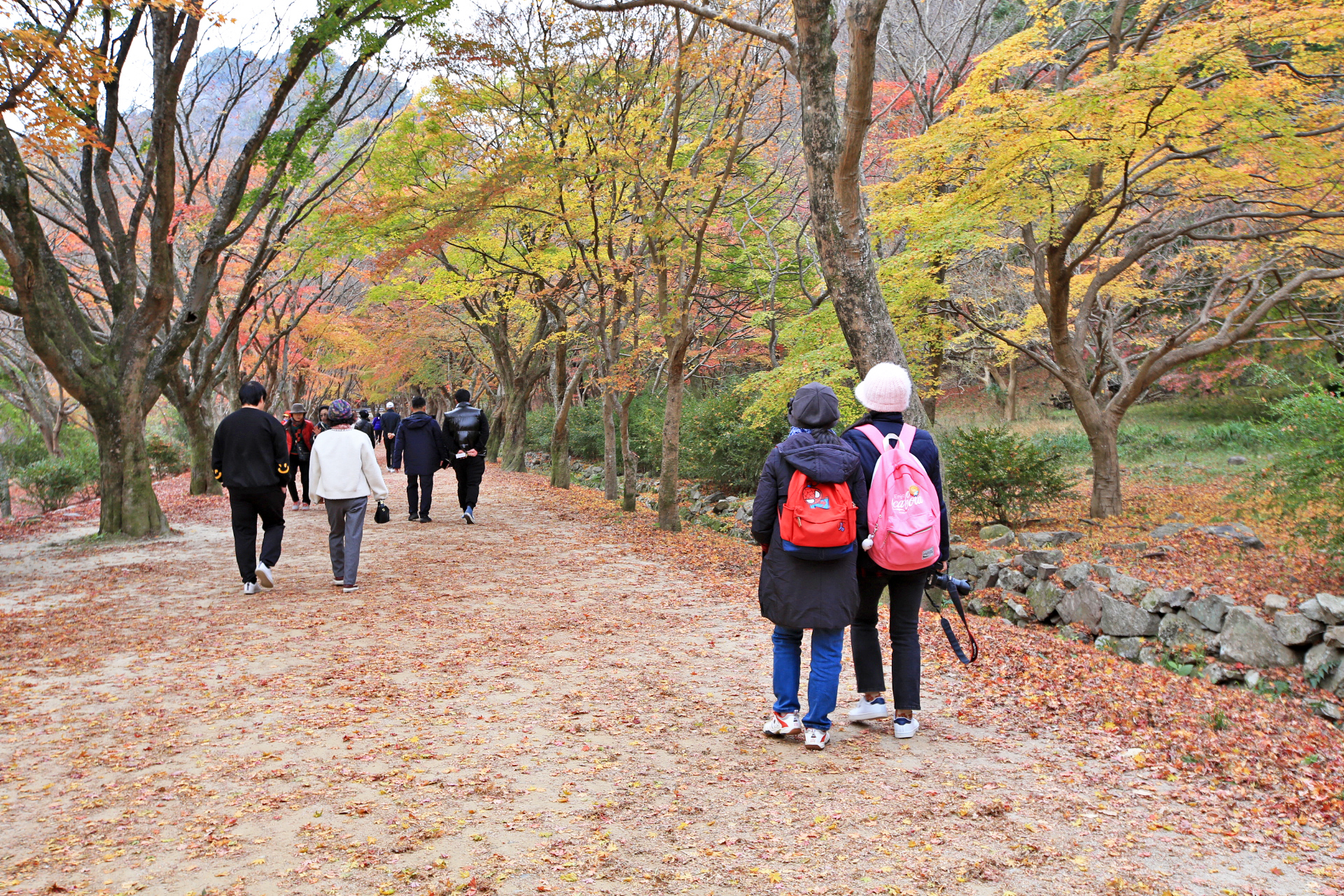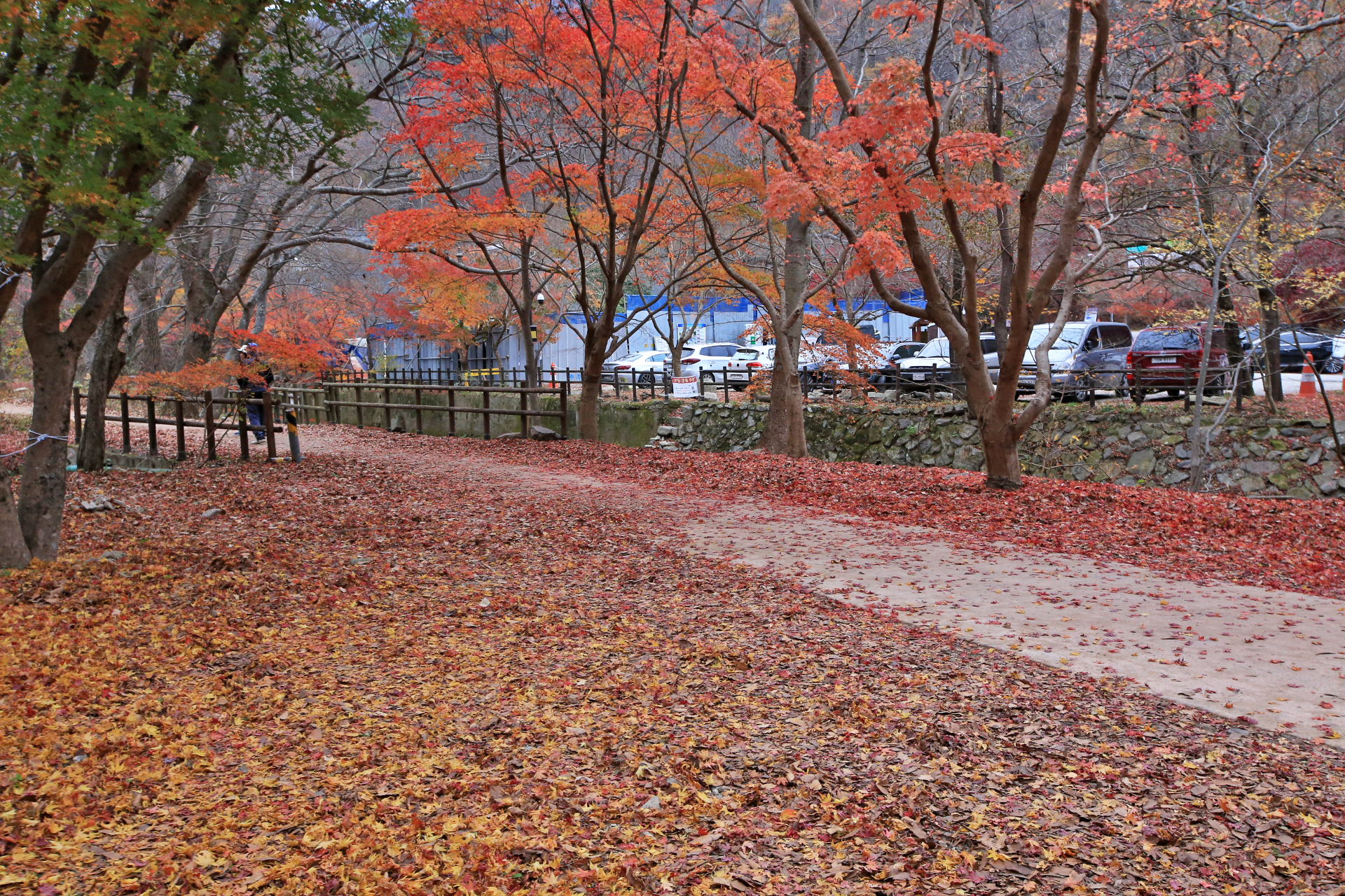 담양 메타세쿼이아 가로수길을 둘러보고 돌아오는 길에 구례로 가서 빨갛게 익은 산수유 열매를 보고 오기로 했었다. 엊저녁에 다녀올 목적지를 내비게이션에 저장하고 이용할 도로와 소요시간을 확인하는 과정에서 딸이 인터넷을 확인해 보더니 단풍으로 유명한 내장사 단풍이 나흘 전인 지난 주말에 절정을 이루었다고 한다. 그렇다면 아직은 단풍이 괜찮겠다는 생각에 구례 산수유 대신 정읍 내장사를 다녀오기로 한 것이었다. 담양에서 점심을 먹고 출발하였는데 오전에는 구름 사이로 햇빛이 자주 비추었는데 내장사로 가는 내내 구름이 끼어서 해 보이지 않는다. 내장사에 가까워질수록 차가 많아지더니 내장사 초입인 공용터미널 부근부터는 혼잡한 편이다. 평일인데도 관람객이 많다. 초입에 주차한 분들이 걸어 나오고 있다. 일찍 왔더라면 가까이 주차하지 못하여 먼 거리를 걸었을 텐데 일주문에 가까운 주차장에 주차할 수 있었다.