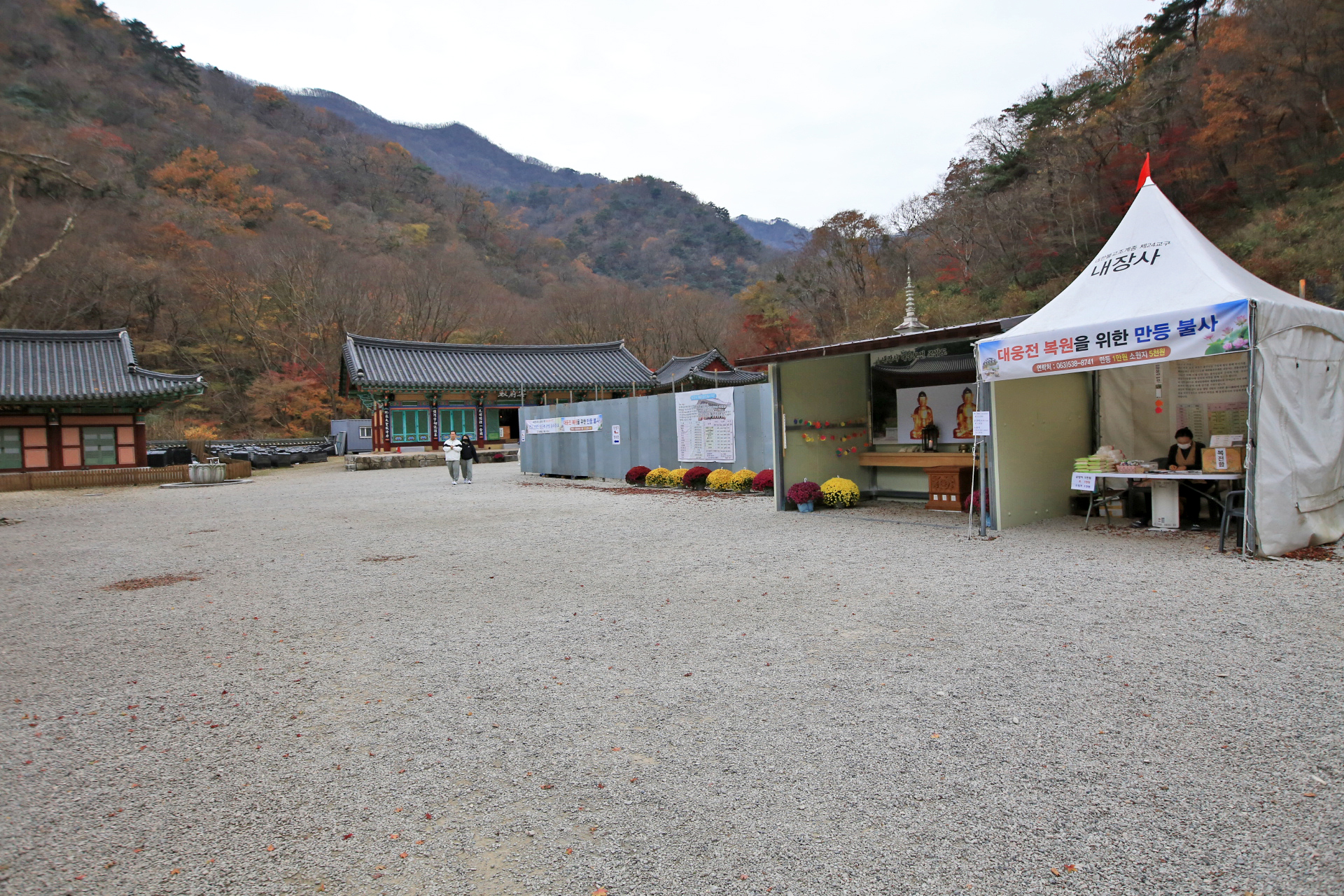 2021년 3월 5일 방화사건으로 전소된 대웅전은 복원공사 중이다.