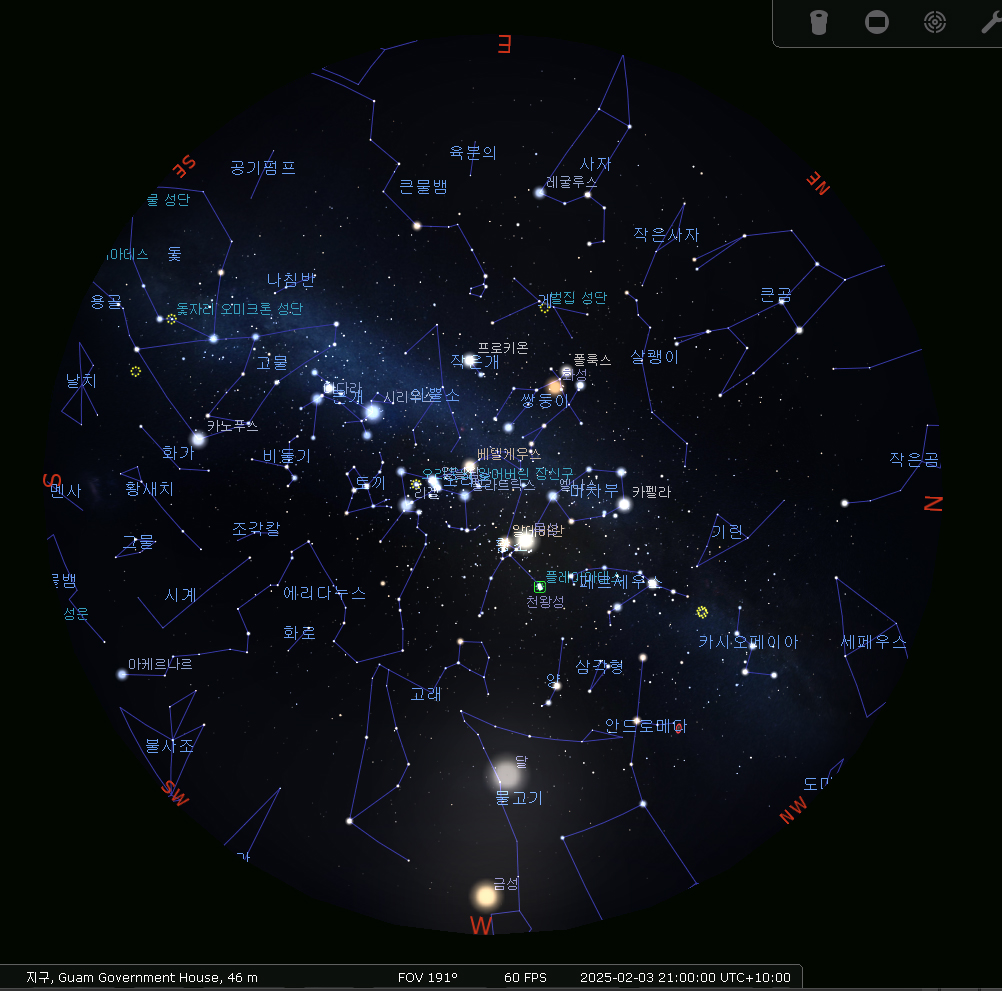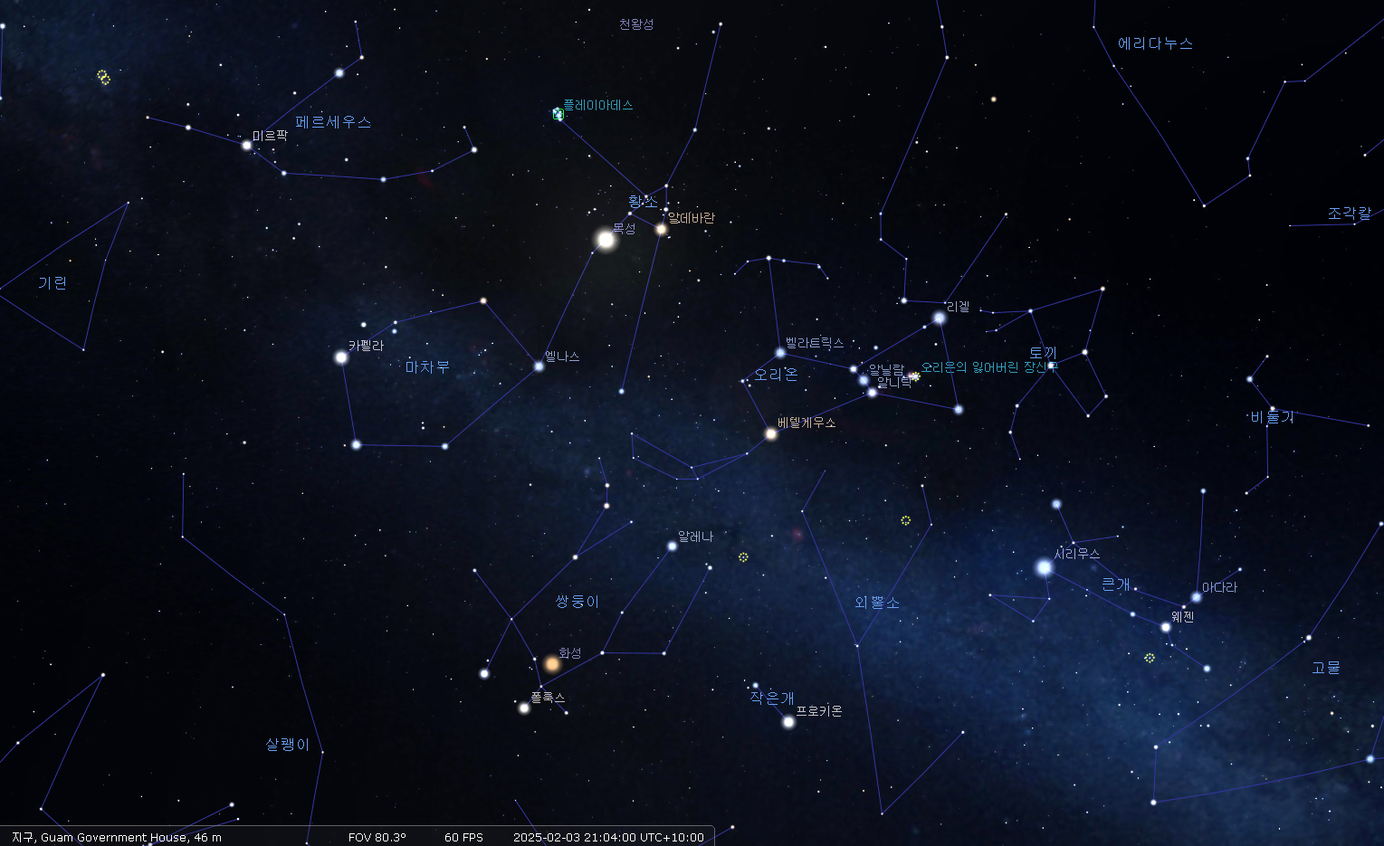 겨울철삼각형은 오리온자리의 베텔게우스-큰개자리의 시리우스-작은개자리의 프로키온으로 이루어진 정삼각형이다. 북반구에서 겨울철에 보이기에 겨울철삼각형이라고 하는데 한여름인 괌에서 보니 새롭다.