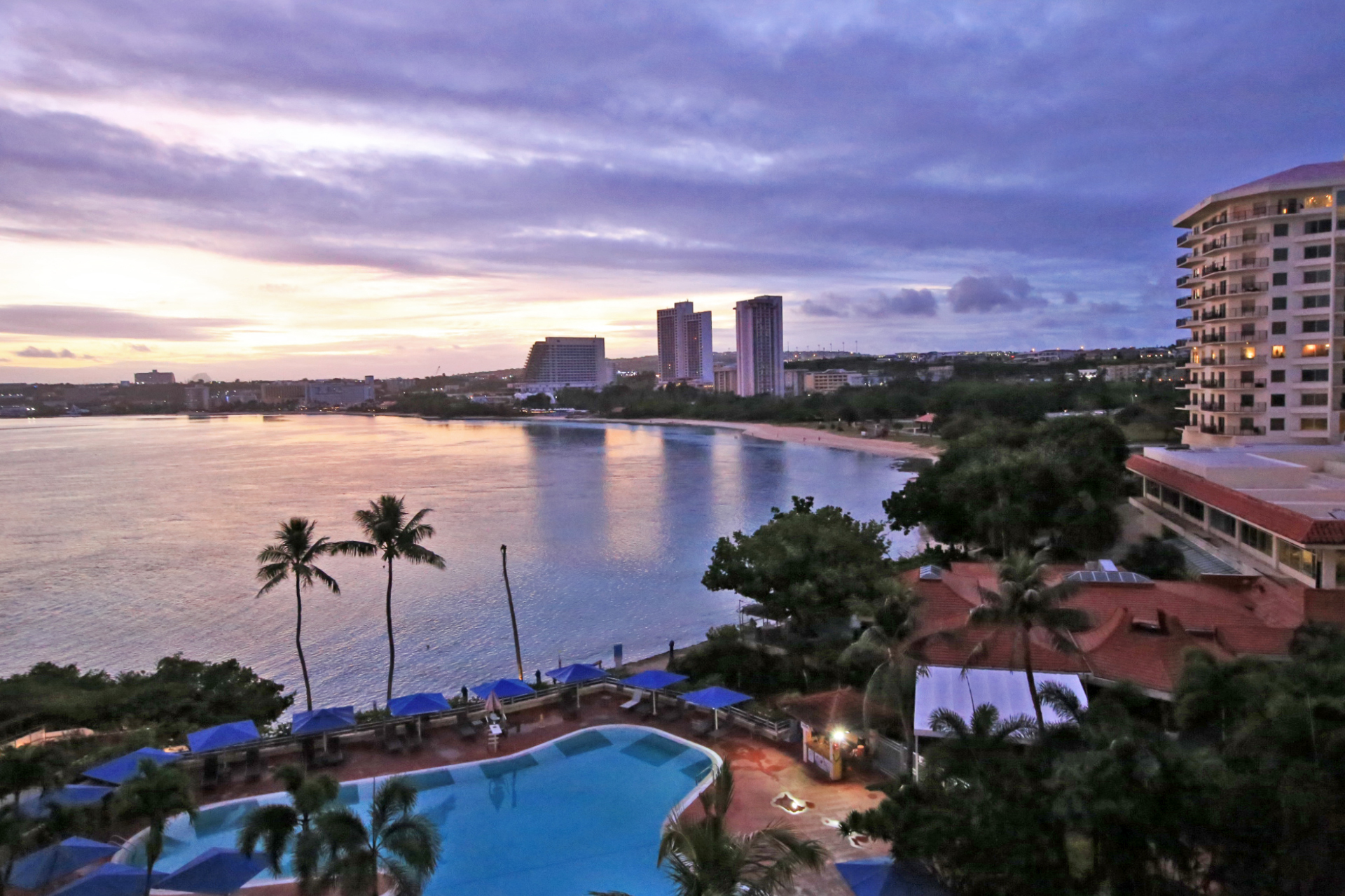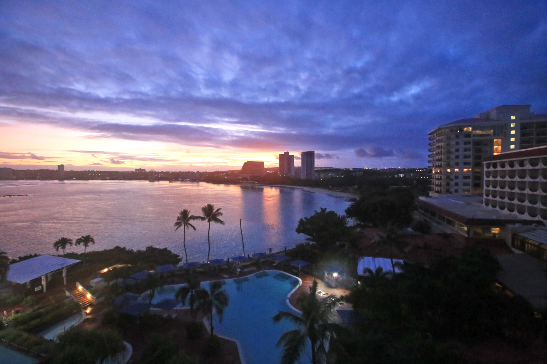 그동안 추위를 견디며 살았기에 괌의 한여름 더위에 땀을 흘리면서도 실감이 나지 않았다. 어젯밤에는 늦도록 잠을 이루지 못하였지만 일찍 눈을 떴다. 누워서 화려한 아침노을이 시시각각 변하는 것을 멍하니 바라보다가 사진을 찍어야겠다는 생각이 들었을 때에는 화려한 순간이 지나간 후였다.