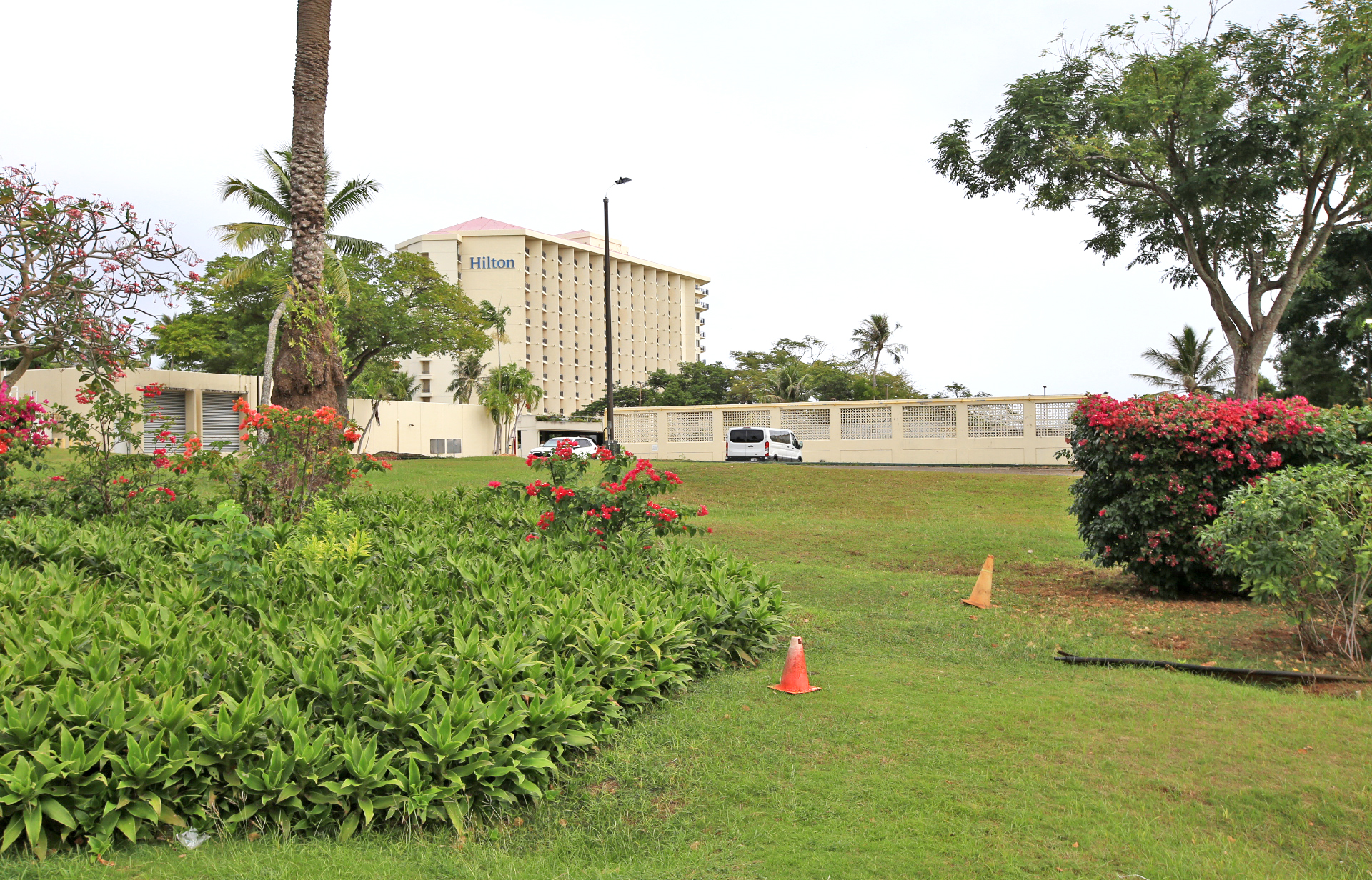 숙소인 Hilton Guam Resort & Spa 주현관 및 가로등 전주에 SQ Group 30th Anniversary Workshop 현수막이 여러 개 걸려있다.