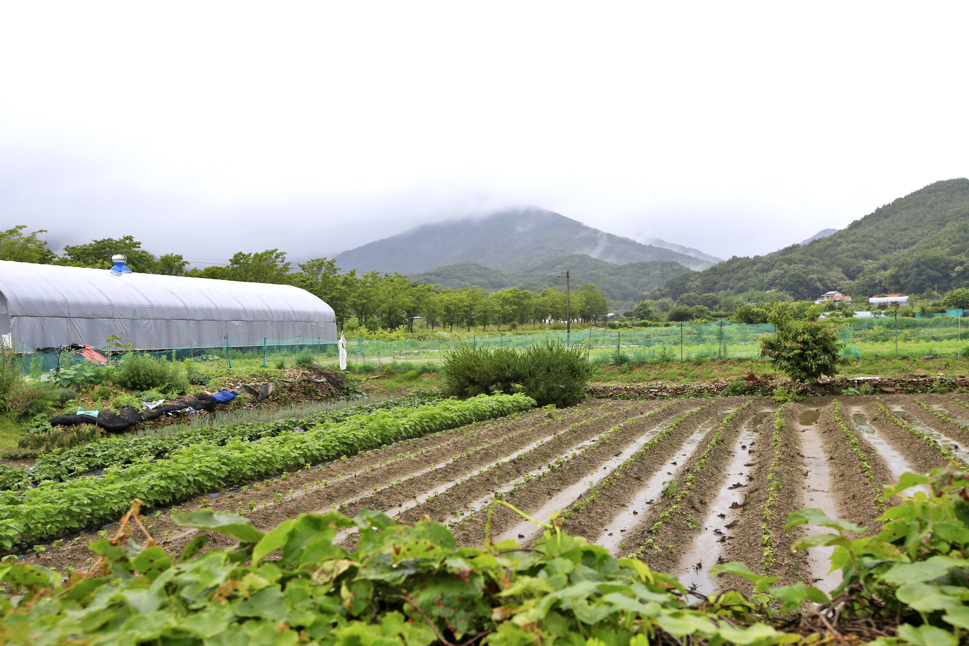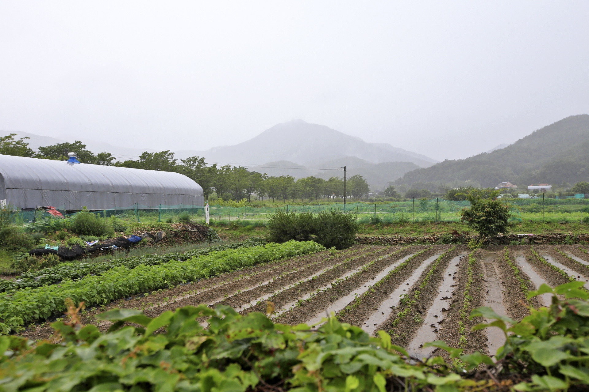 어제 진입로 수해복구를 마친 부분이 경사로이기에 물이 흐르면 흙이 유실될 우려가 있어서 그늘막을 깔았다.
