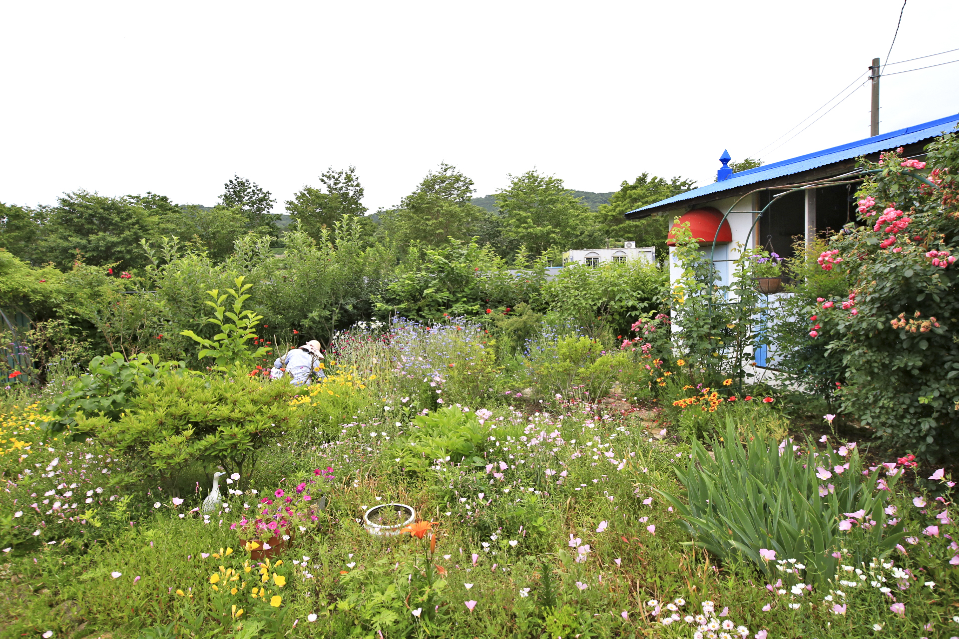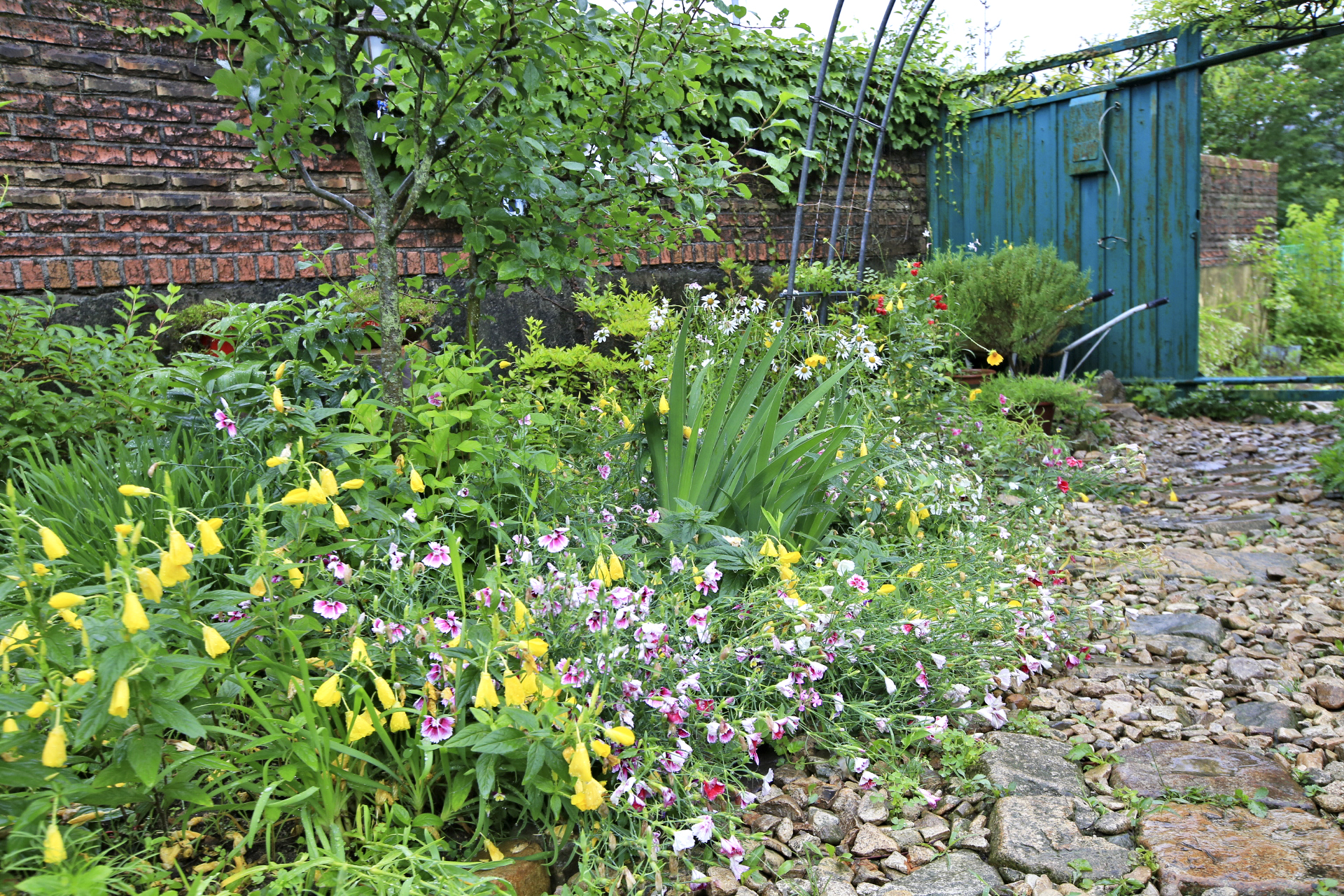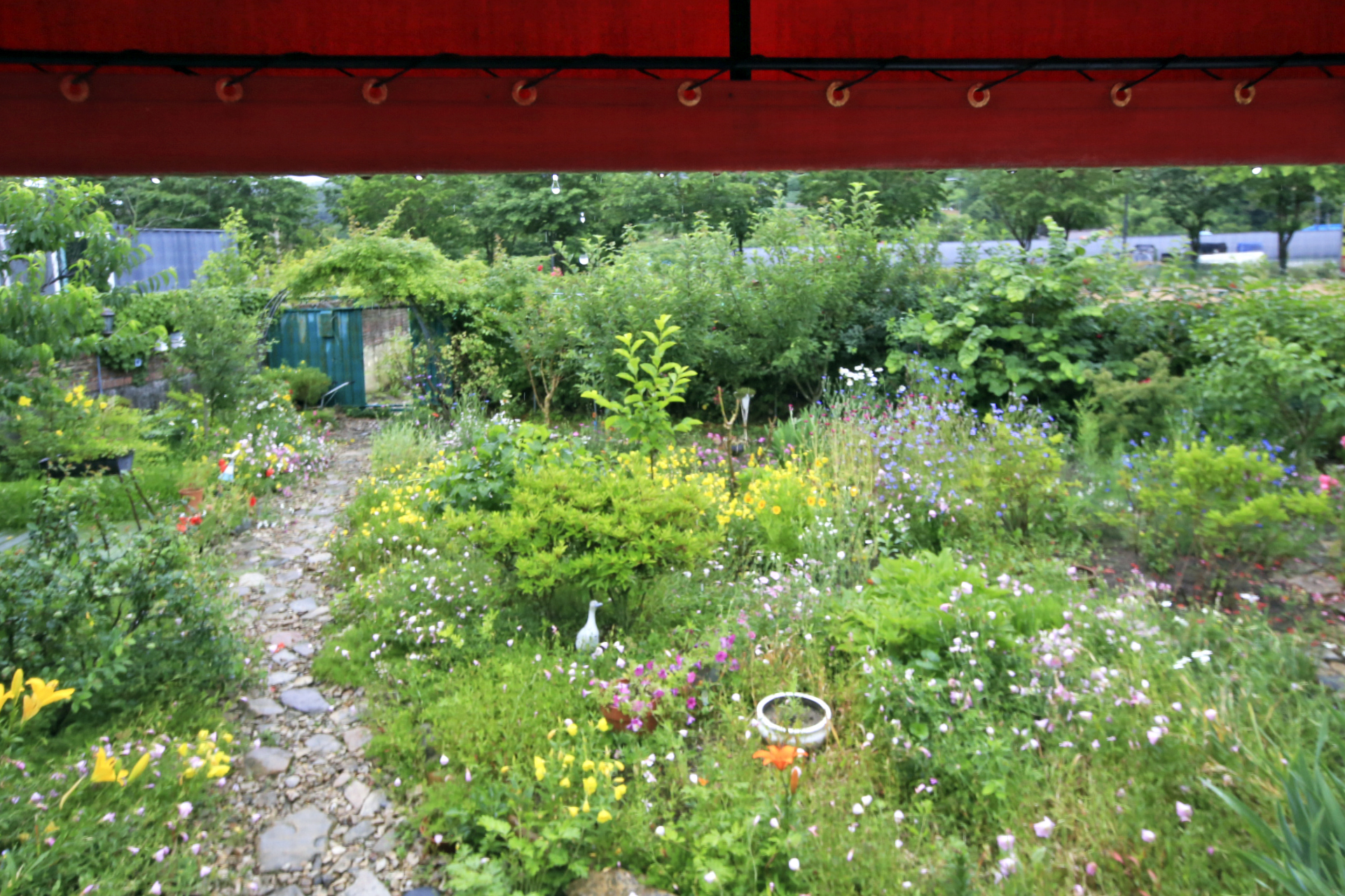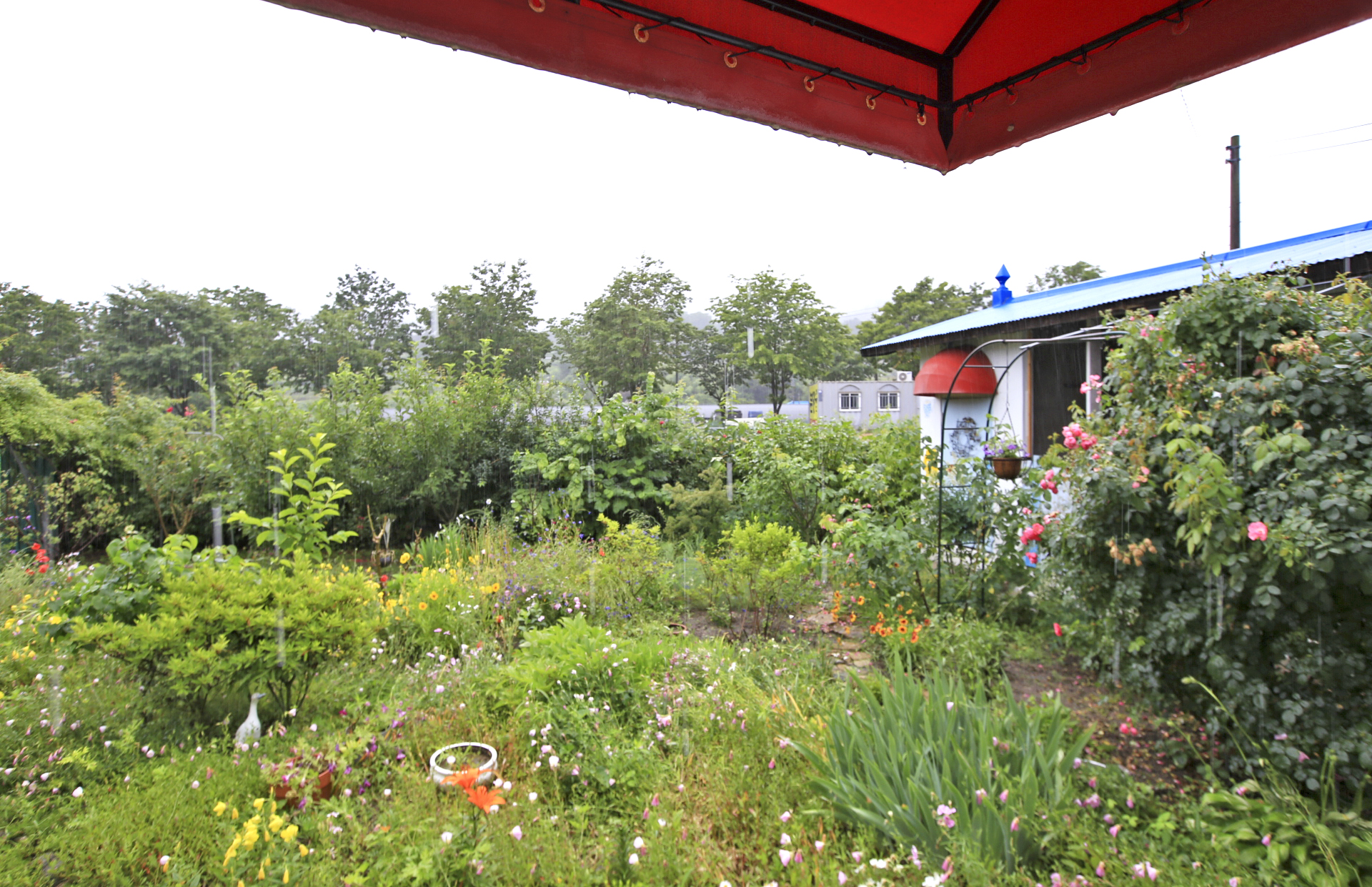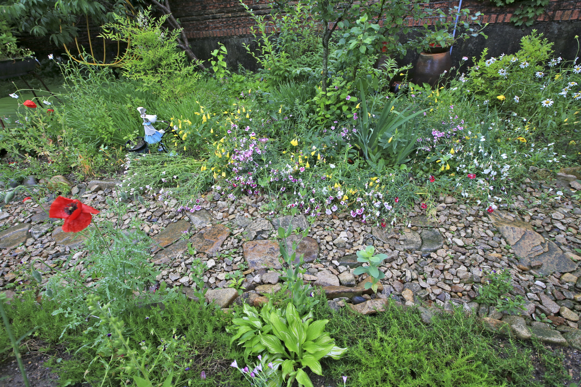 아내는 비가 내리기 시작하였지만 많이 내리지 않는다며 꽃밭 가꾸기를 계속하였다. 꽃양귀비와 샤스타데이지와 수례국화의 뒤를 이어 꽃이 필 메리골드와 백일홍과 천일홍 등의 화초가 자랄 수 있도록 꽃이 대부분 진 꽃양귀비를 뽑아낸다. 아내가 앉아있는 부근부터 우측으로 어제 촬영한 작업 전 사진에 보이던 꽃양귀비와 수례국화가 사라졌다.