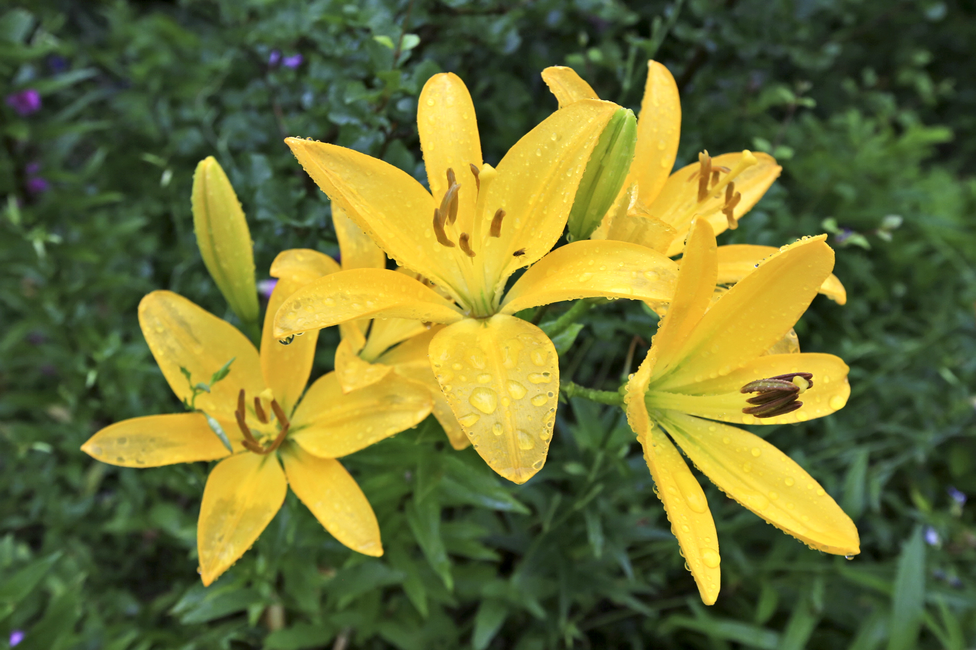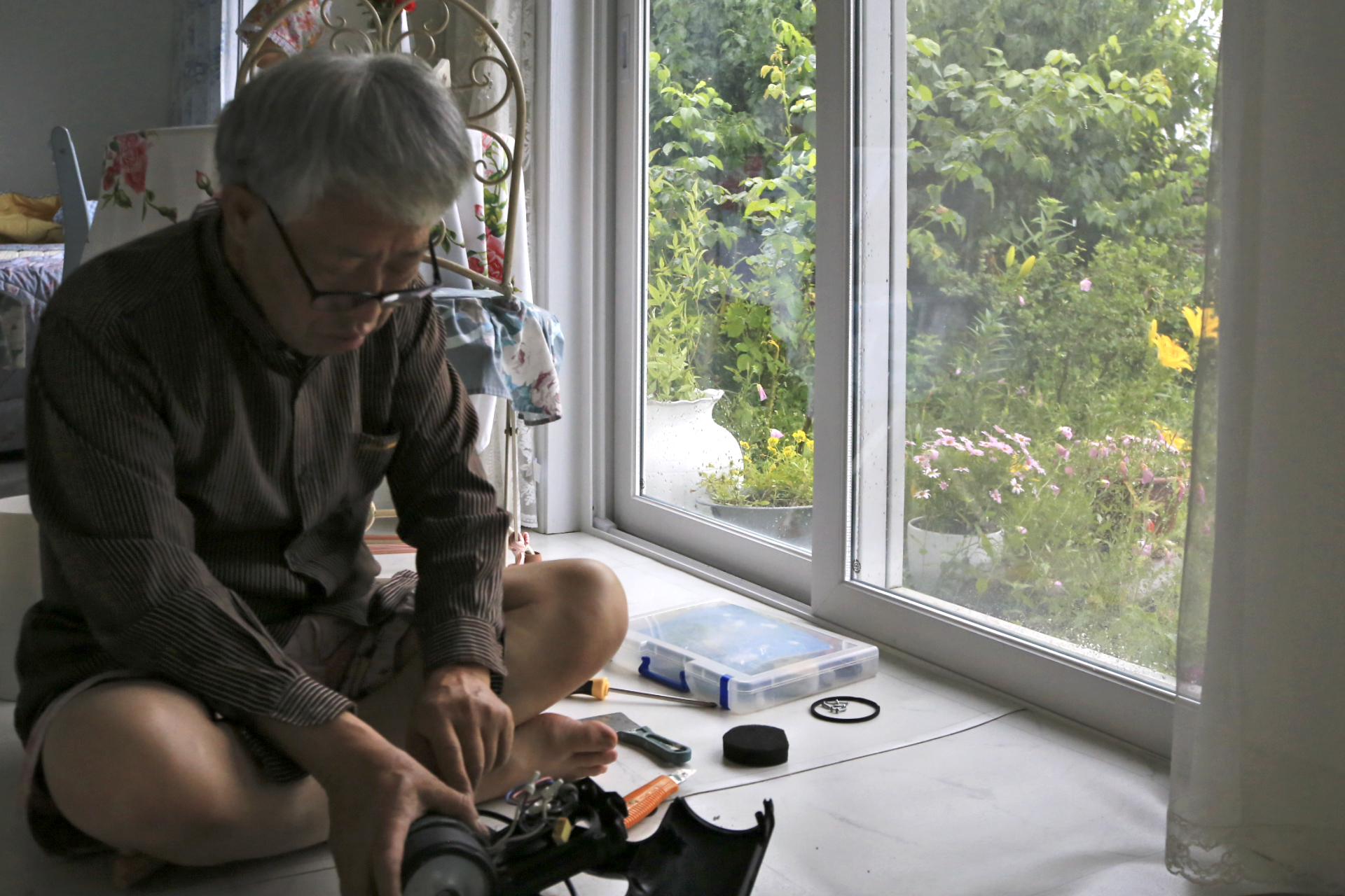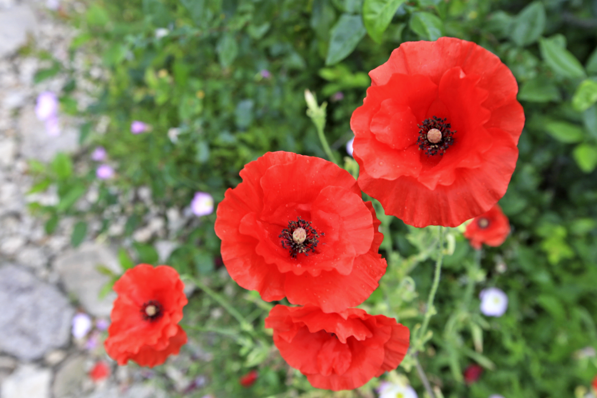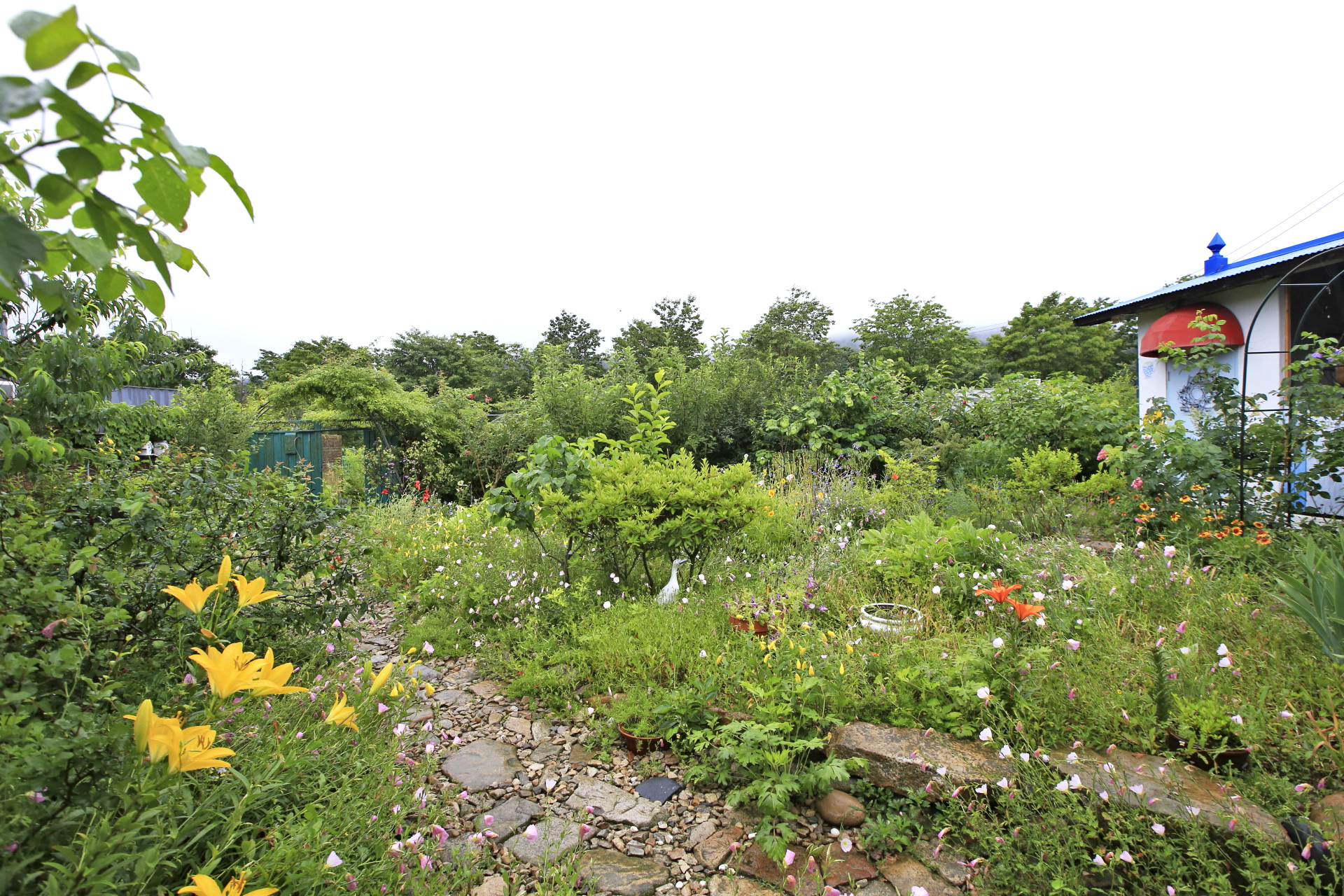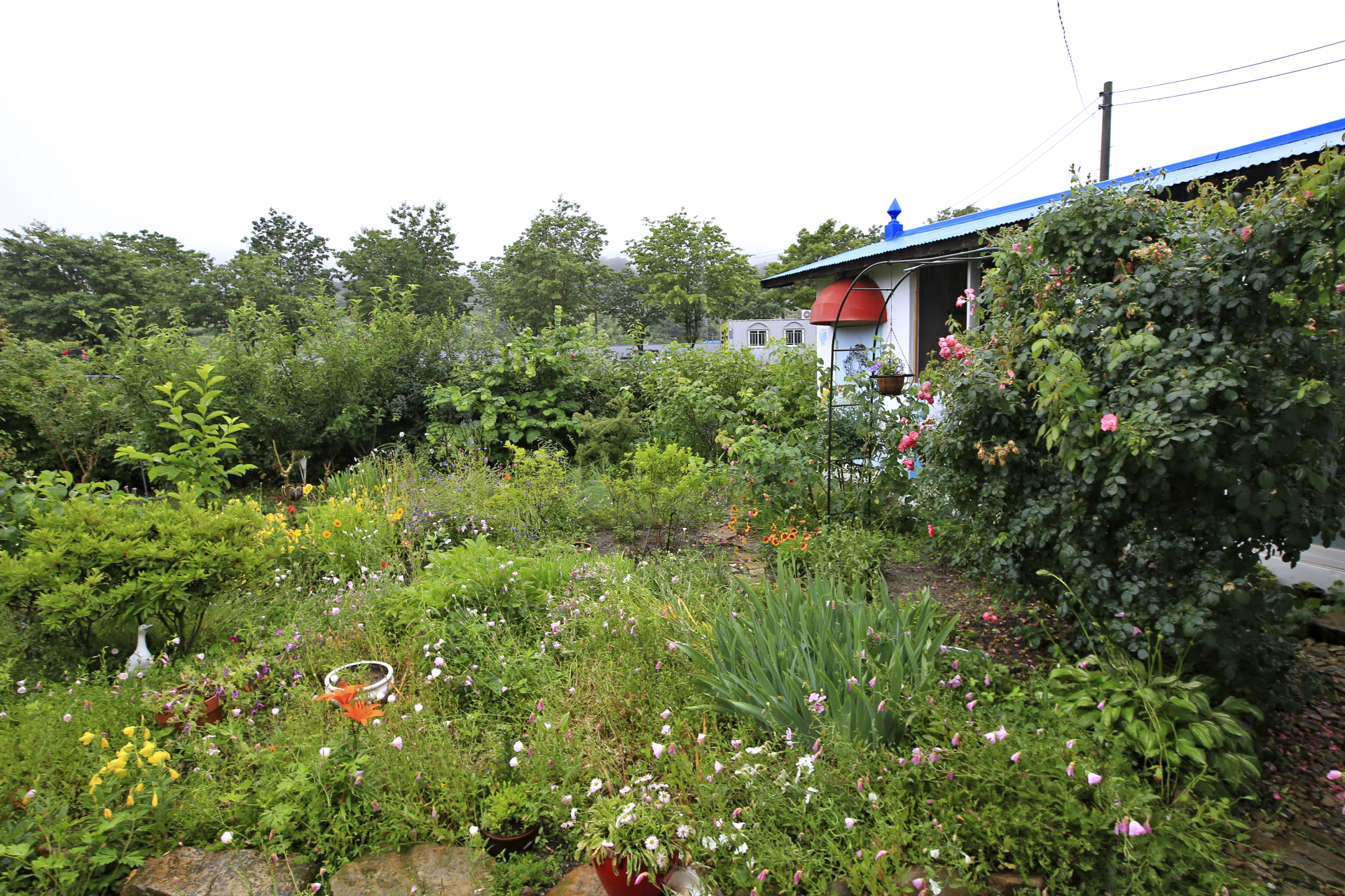 아내는 비가 내리기 시작하였지만 많이 내리지 않는다며 꽃밭 가꾸기를 계속하였다. 꽃양귀비와 샤스타데이지와 수례국화의 뒤를 이어 꽃이 필 메리골드와 백일홍과 천일홍 등의 화초가 자랄 수 있도록 꽃이 대부분 진 꽃양귀비를 뽑아낸다. 아내가 앉아있는 부근부터 우측으로 어제 촬영한 작업 전 사진에 보이던 꽃양귀비와 수례국화가 사라졌다.