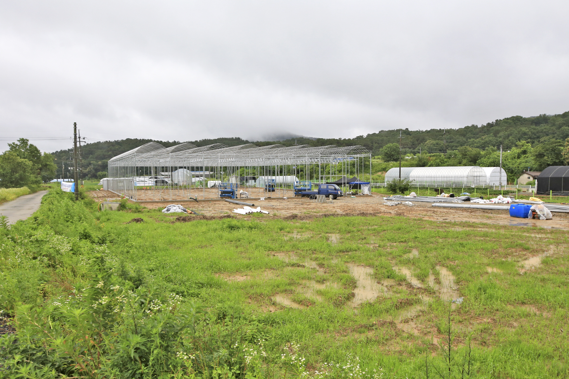 유리온실을 짓는다고 하던데 벽체와 지붕의 구조체가 비닐하우스용이다.