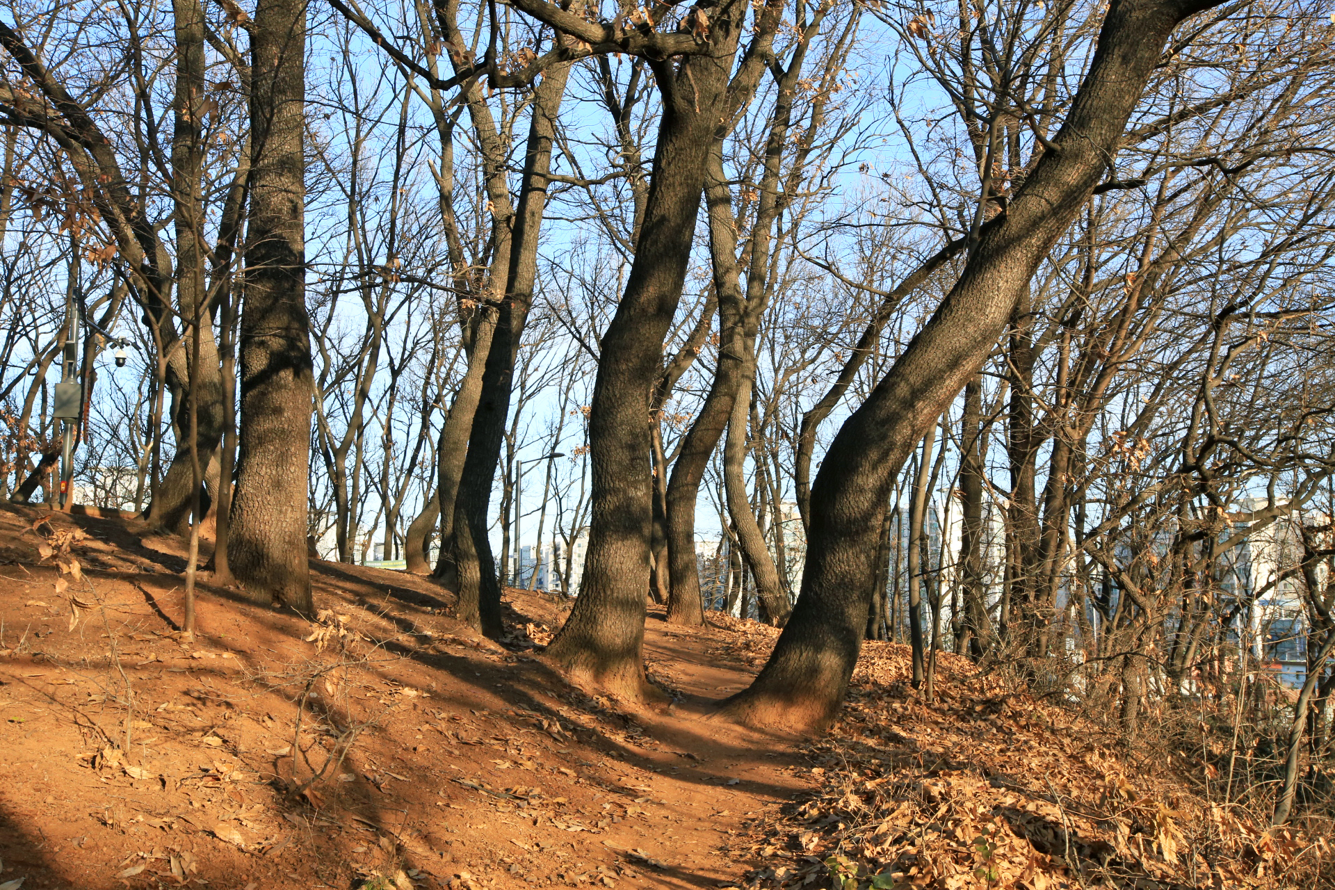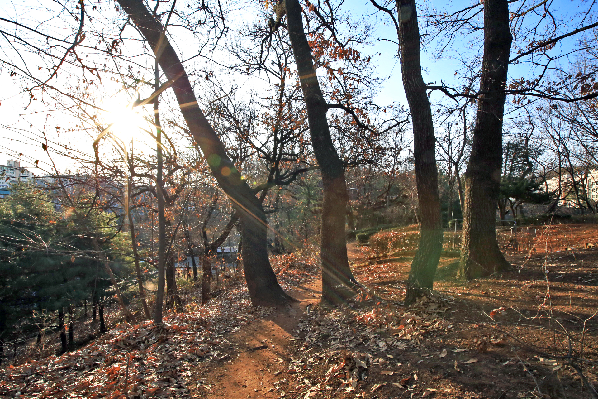 낙엽 진 숲 사이로 우리 아파트가 보인다.