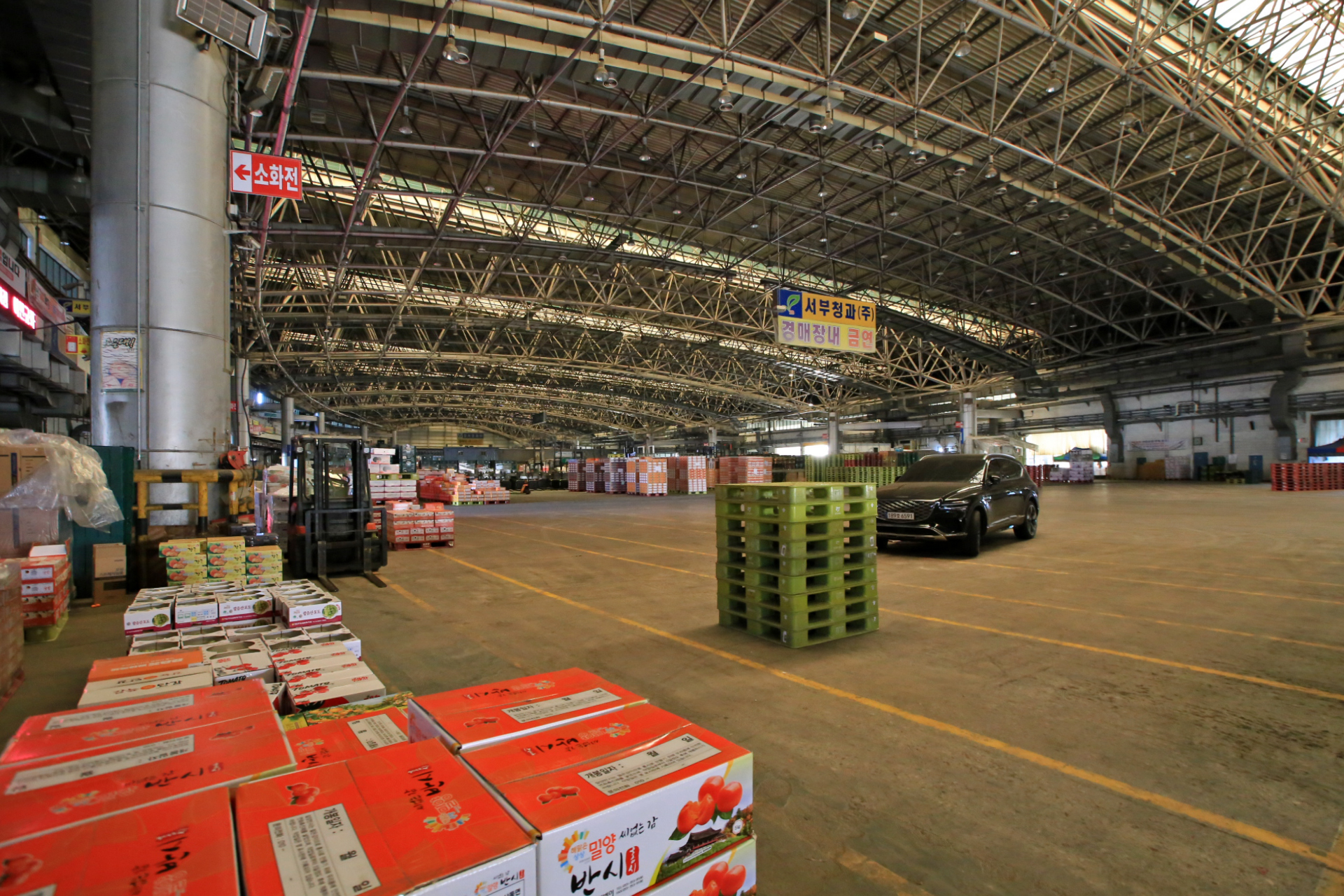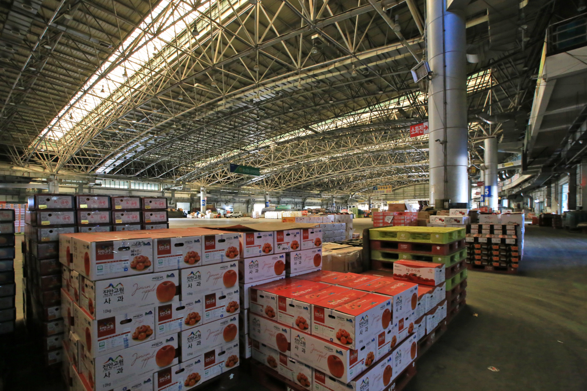 도매시장 본 건물의 규모가 방대하여 전경을 촬영할 만한 곳은 없다. 주변 높은 건물에 올라가면 좋겠는데 마땅치 않아서 출입이 가능한 더농마트 2층에 올라갔다.