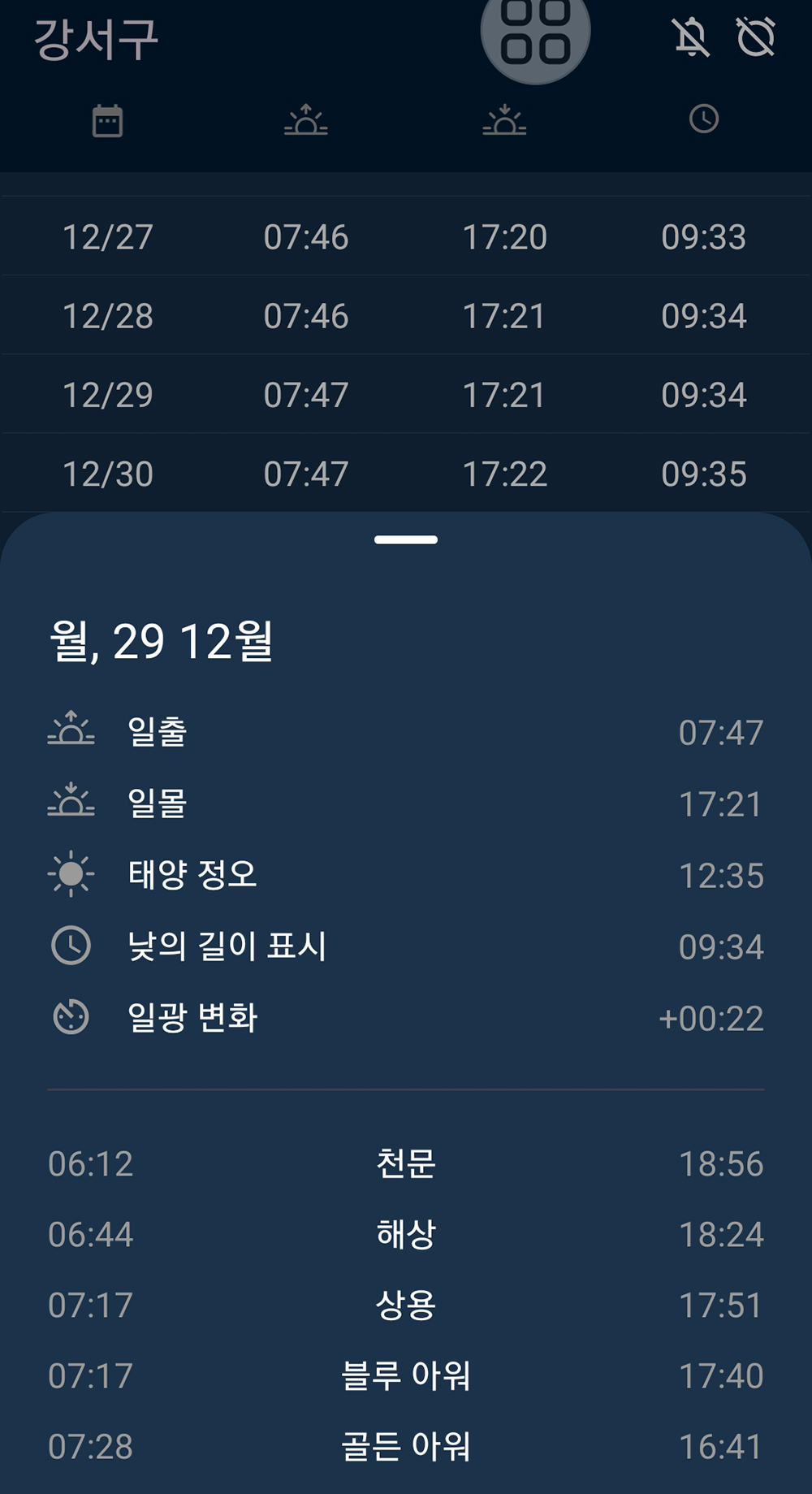 집에서 출발할 때 Ju가 날이 저물어서 개인지 늑대인지 구분할 수 없다는 '개와 늑대의 시간'까지 카페에서 머물자고 하였다. 스마트폰에 깔려있는 '일출'이라는 앱을 가끔 이용하는데 일출시각과 일몰시각이 있어서 최저기온을 보거나 박명시각을 알아내는데 활용하고 있었다. 이제까지는 이런 정도로만 이용하였는데 날짜를 눌러보니 시민/항해/천문박명시각과 골든아워 및 블루아워 시각과 해의 정남시각과 낮의 길이까지 표시해 준다.