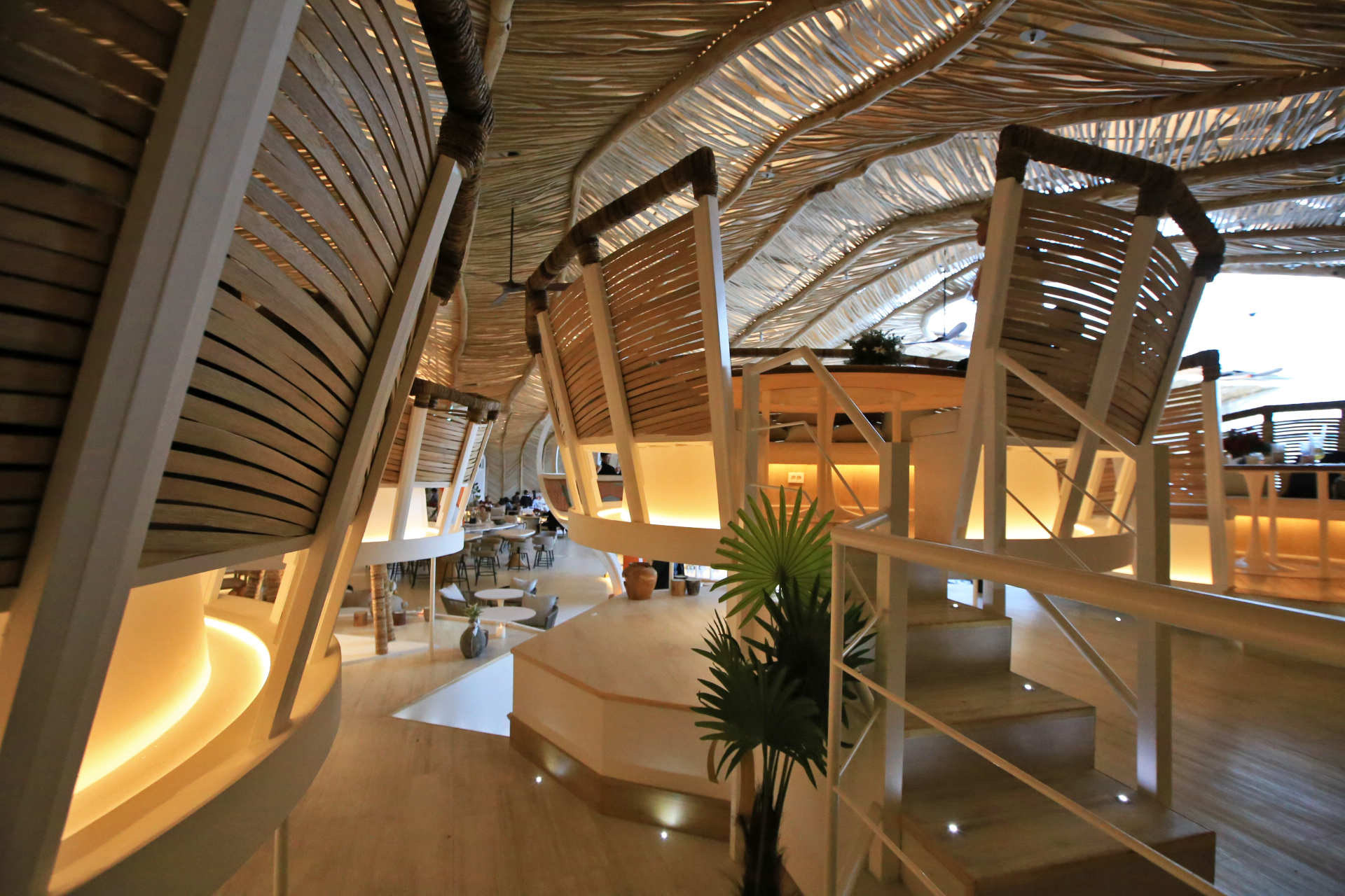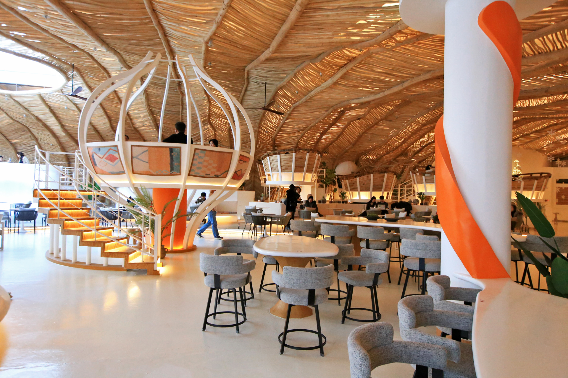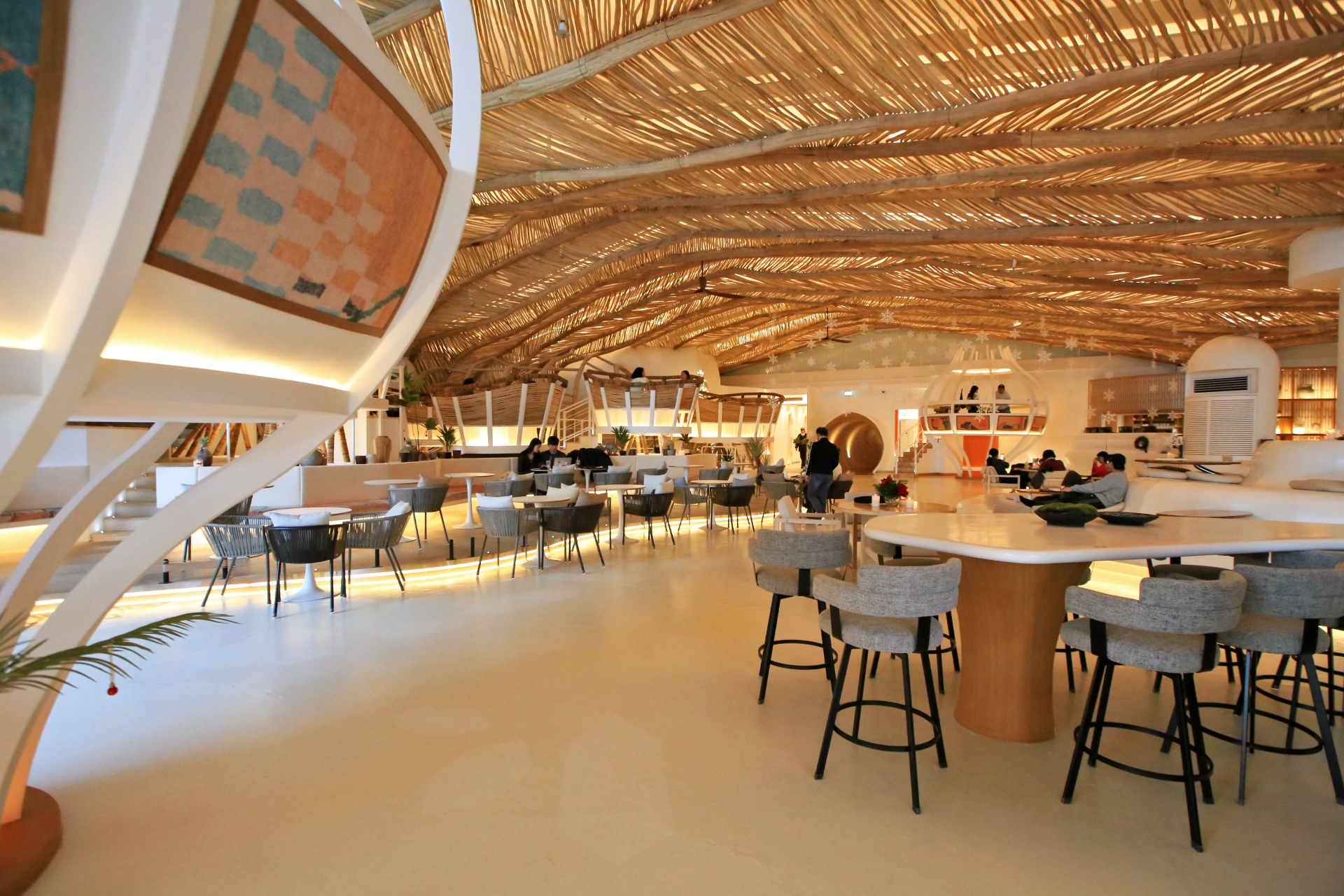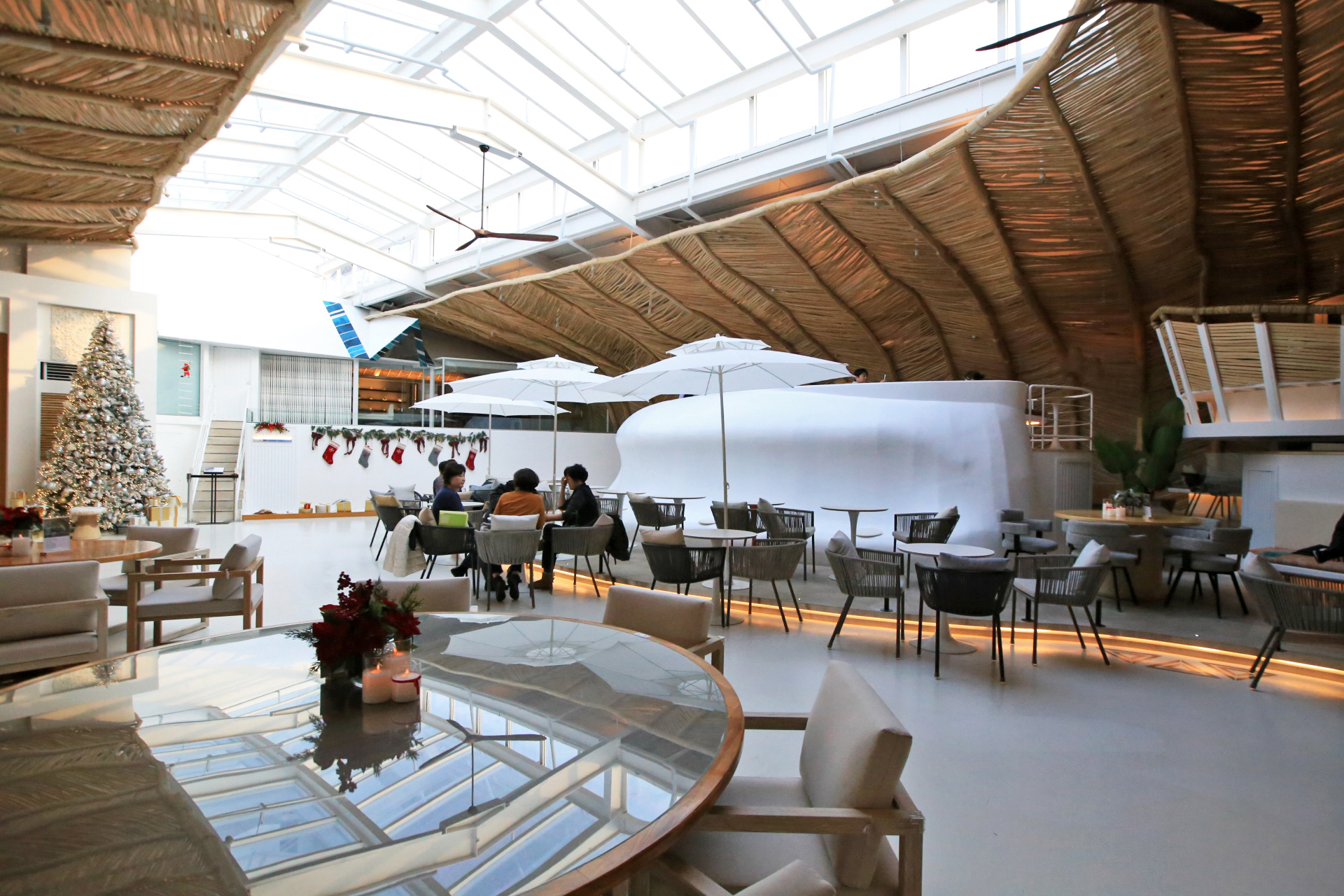 마감 재료 자체는 나뭇가지의 껍질을 벋긴 것인데 어떻게 이렇게 꾸밀 생각을 했을까? Ju가 친구들에게 인스타그램으로 카페 사진을 보냈더니 '발리에 갔냐?'고 야단이란다. 이런 인테리어가 발리스타일이라고 한단다. 스프링클러 헤드가 촘촘하게 보인다.