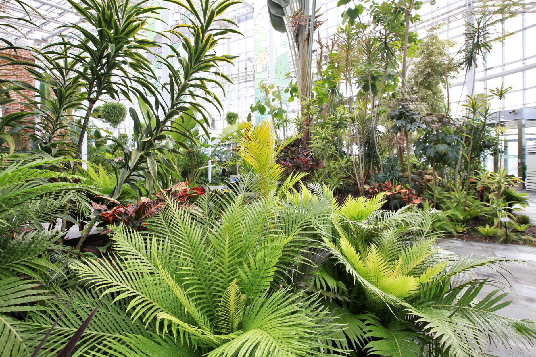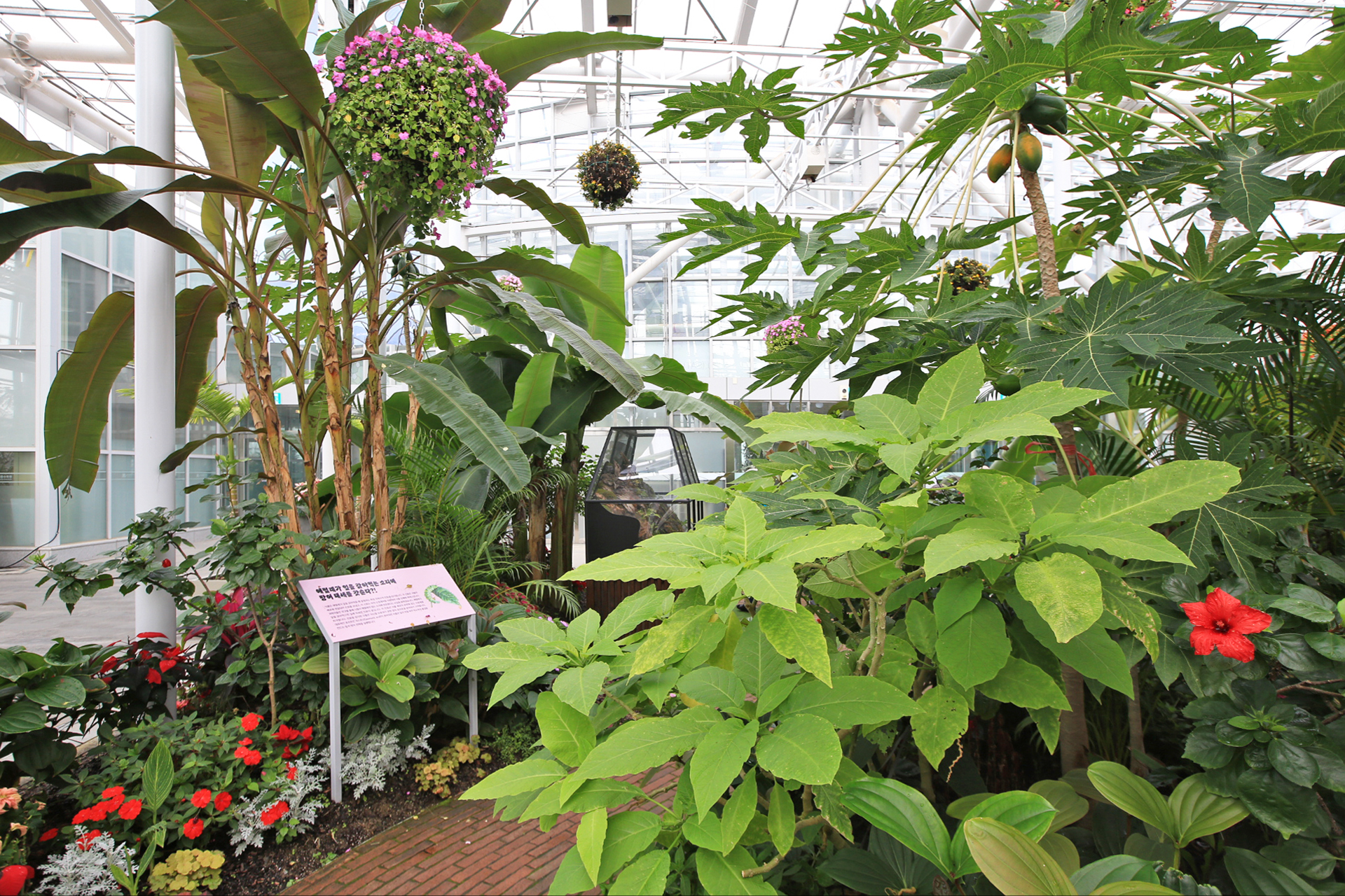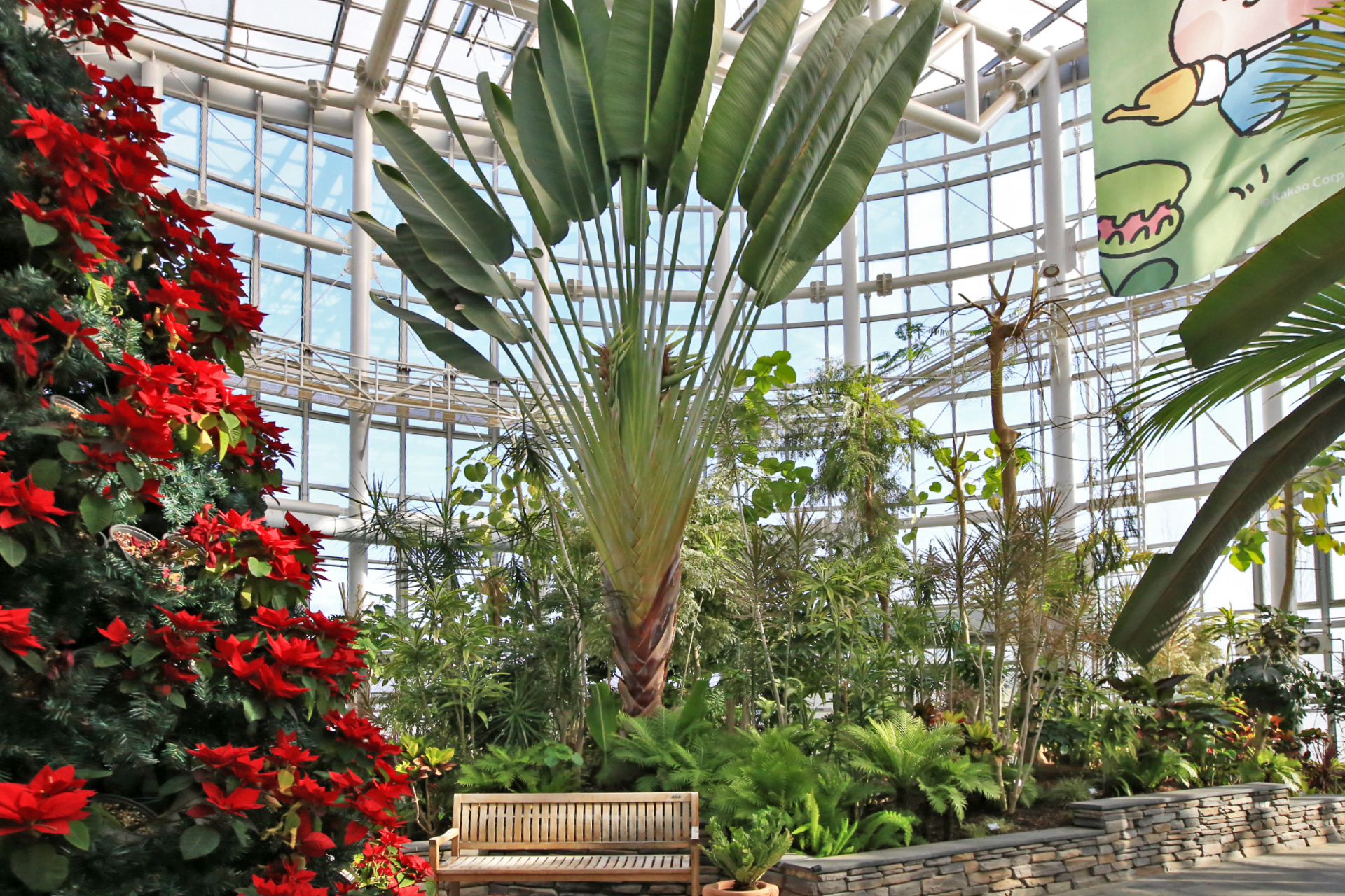 며칠 전(20260125)에 서울식물원의 온실에 다녀온바 있다. 서울집에서 가깝기에 운동 삼아서 가기도 하는 등 자주 가는 편이다. 천장의 구조상 결로수 처리가 미흡하여 바닥에 떨어진 자국도 많고, 주의하라는 표지도 여러 군데 설치되어 있다. 국립세종수목원 특별전시온실에도 같은 현상이 일어날까 살펴보았다. 바닥 전체를 확인한 것은 아니지만 천장에서 물이 떨어진 흔적은 보이지 않는다.