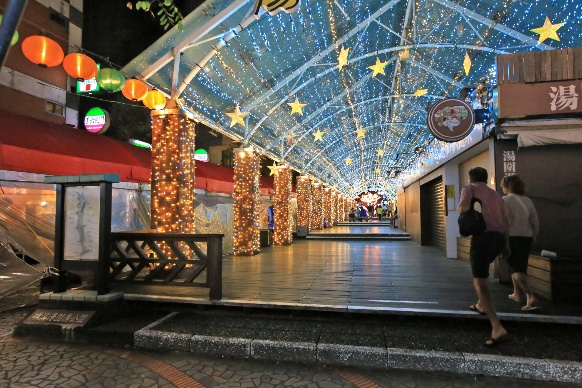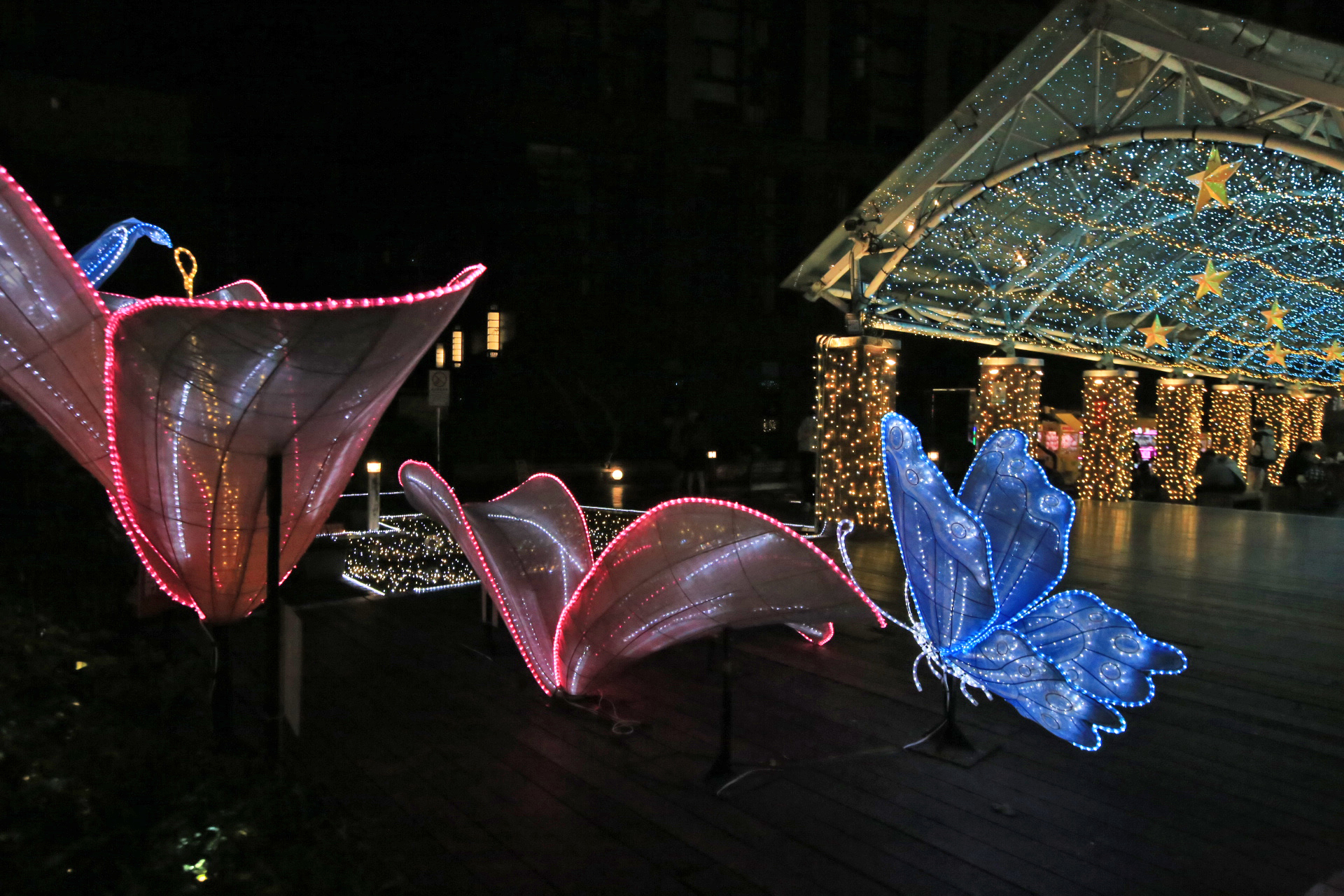 야시장을 좀 들어가니 야시장 옆의 개울에 장식등이 화려하다.