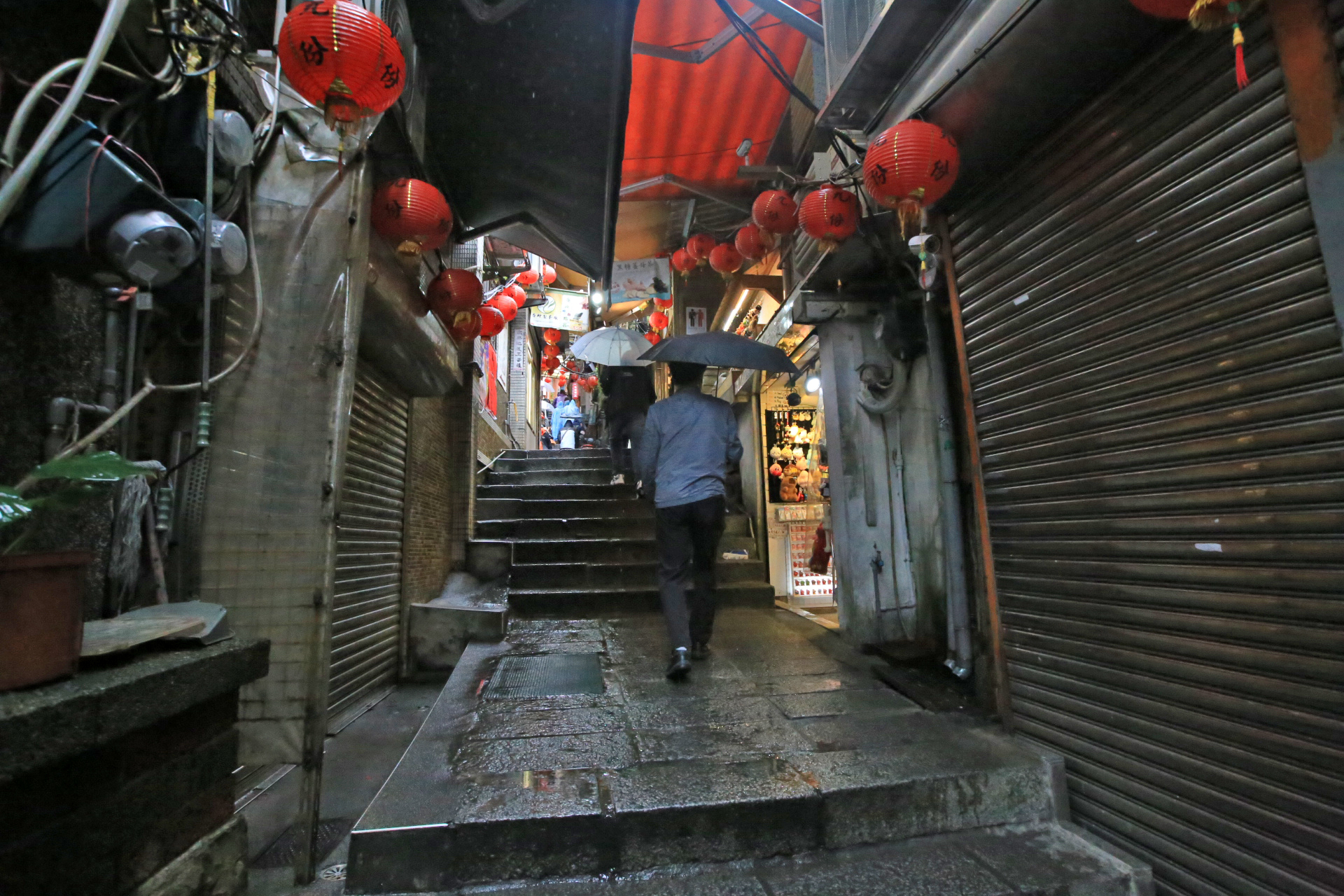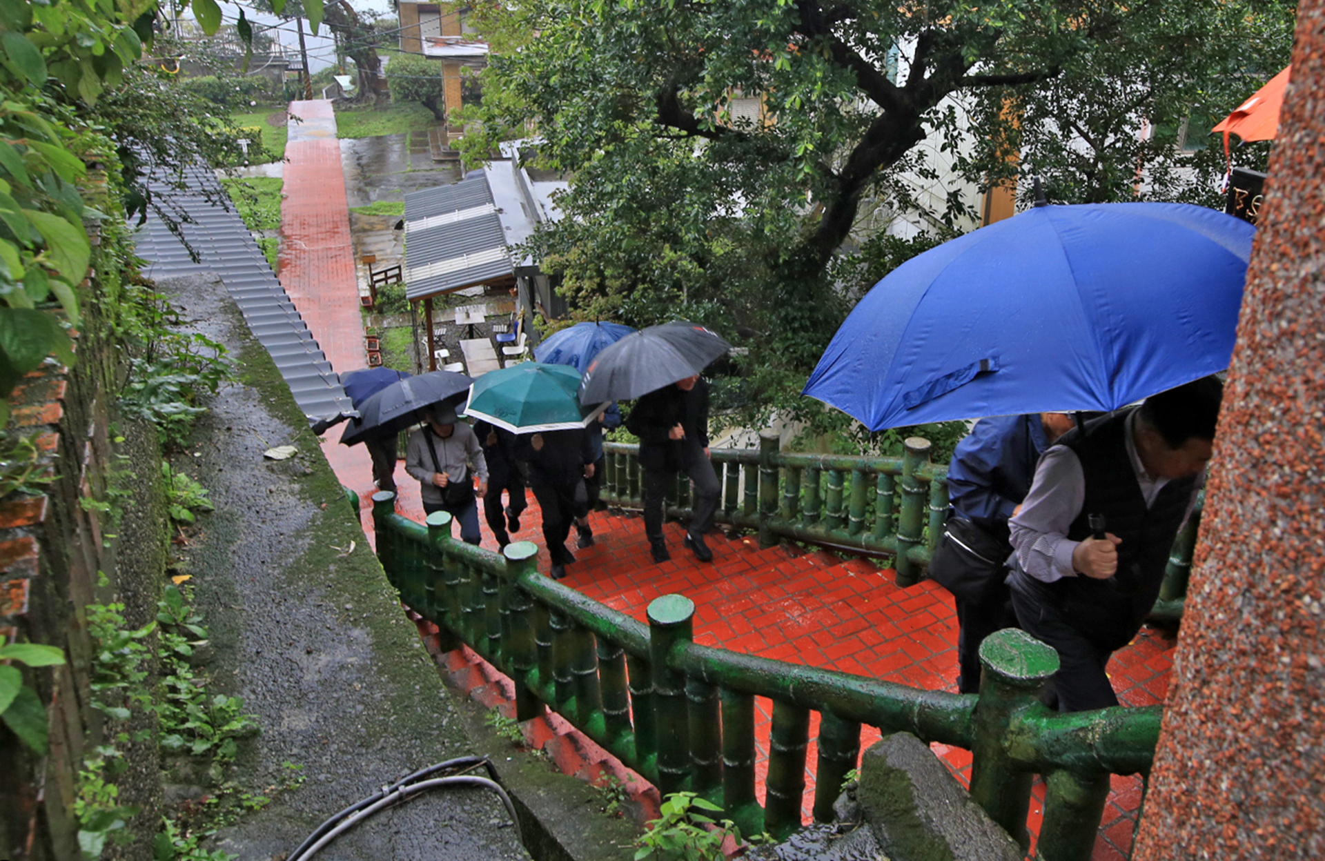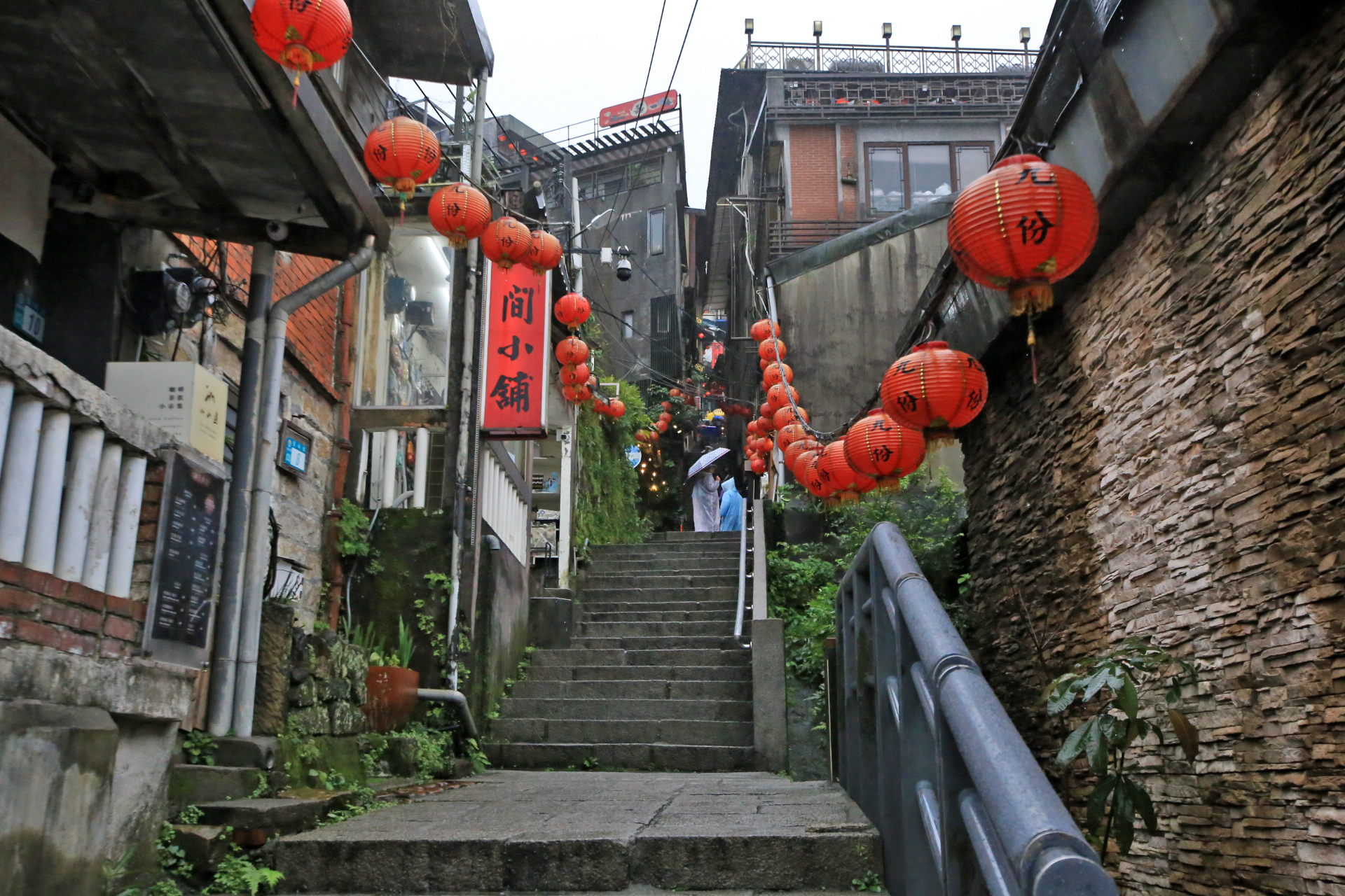좁은 골목의 계단길에 비가 내리니 관광객들이 우산이 뒤엉켜서 가기도 쉽지 않다.