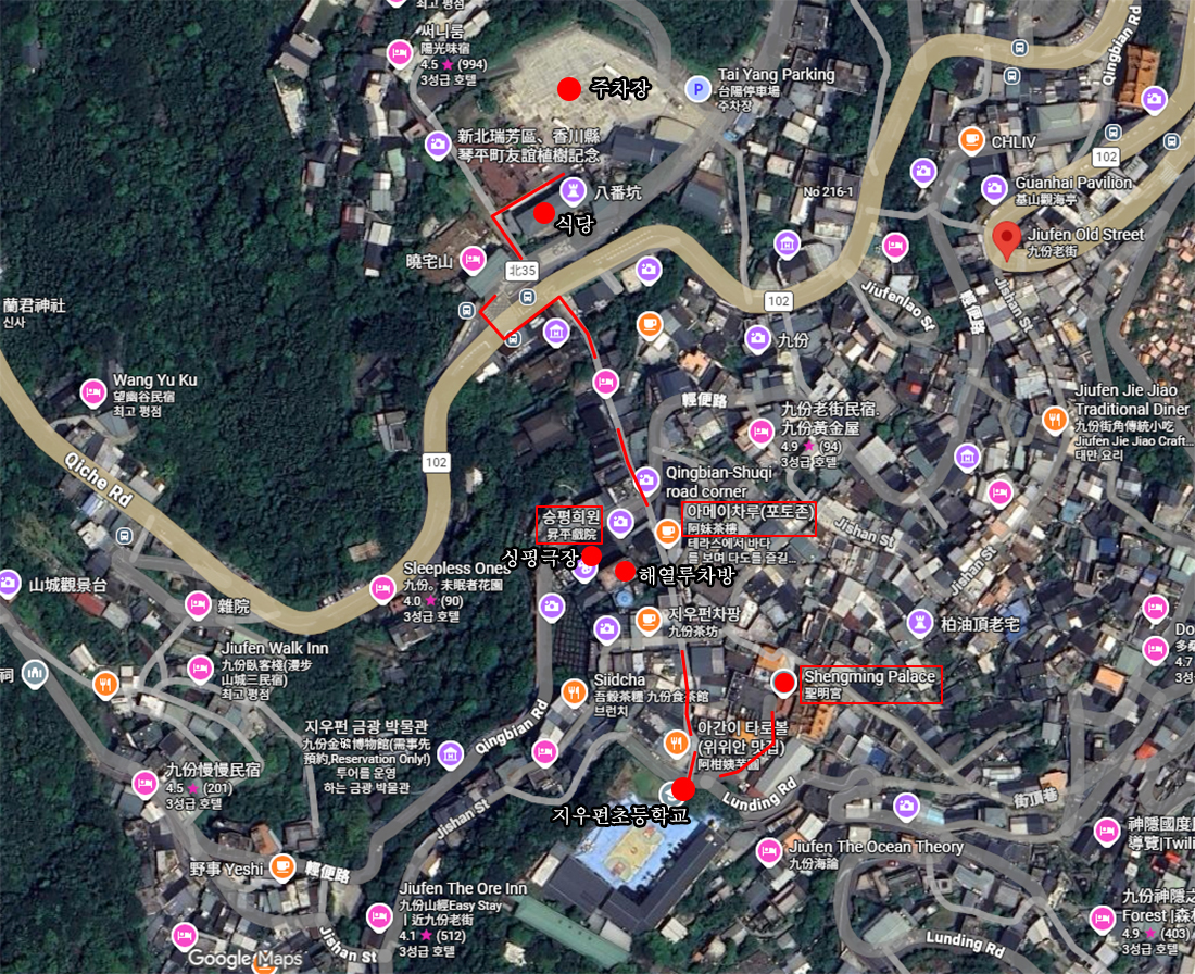 지우펀의 역사적 배경과 함께 발전해 온 4층 목조건물로 대표적인 찻집이자 전망 좋은 레스토랑이란다. 아메이차로 맞은편에 위치하여 지우펀의 야경을 감상하기 좋은 장소라고 한다. 그러나 지우펀의 상점가 운영시간이 10:00~20:00이므로 야경을 본다 해도 21:00이전까지만 가능하지 않을까 한다는 인터넷에 올라온 글이 있다.