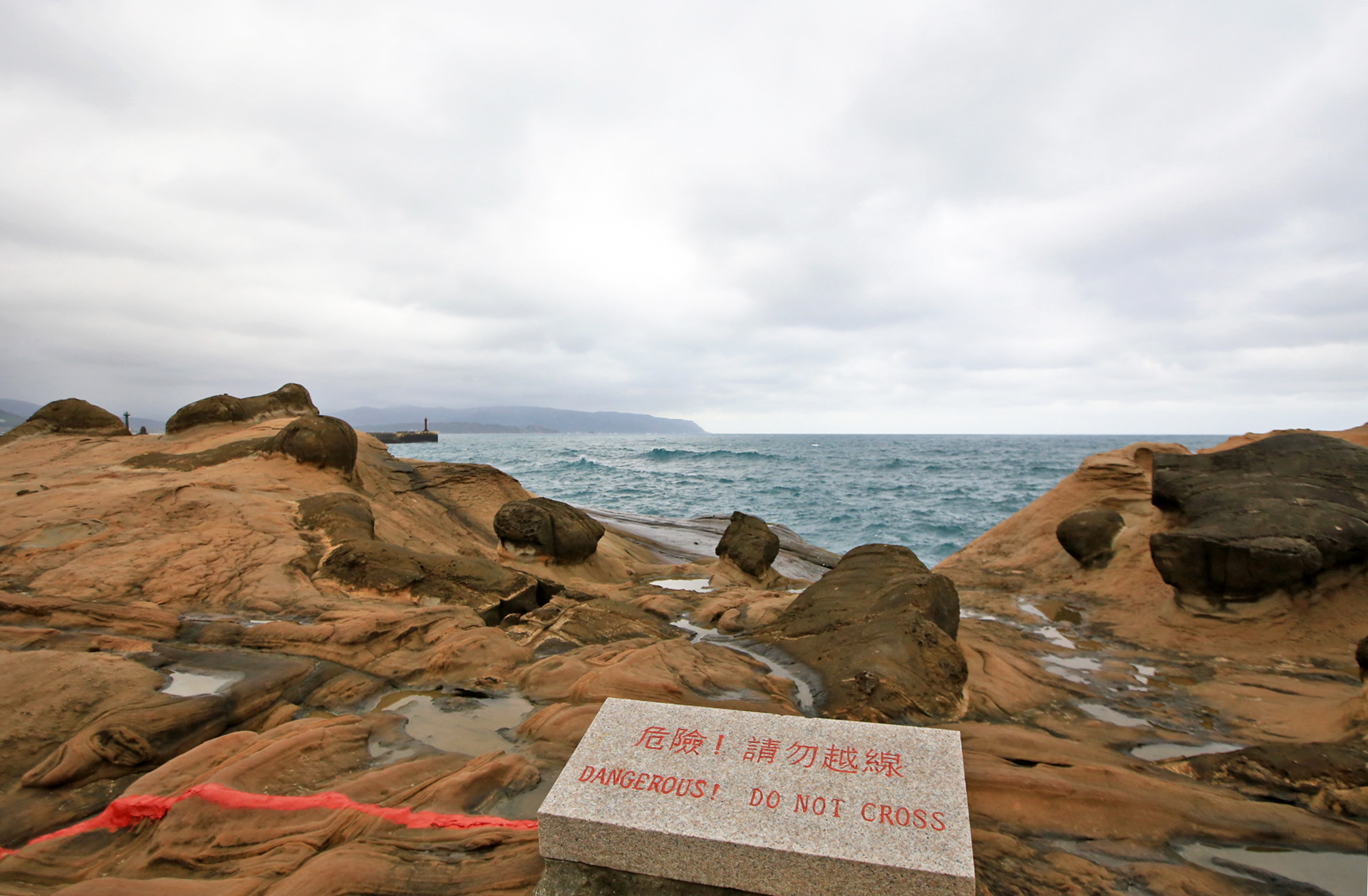 바다 쪽으로 적색선이 그어져 있고 위험하니 넘지 말라는 표지석이 있다. 곳곳에 초록색 조끼를 입은 감시인이 있어서 일부러 선을 넘는 것은 아니지만 무지 또는 무의식적으로 넘어가면 즉석에서 제지한다.