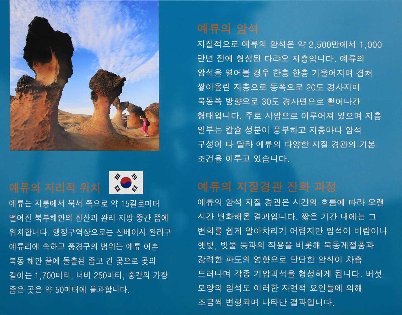 예류지질공원 입구에 있는 커다란 안내판에는 한글이 병기되어 있고 아래와 같은 글귀도 있다,
