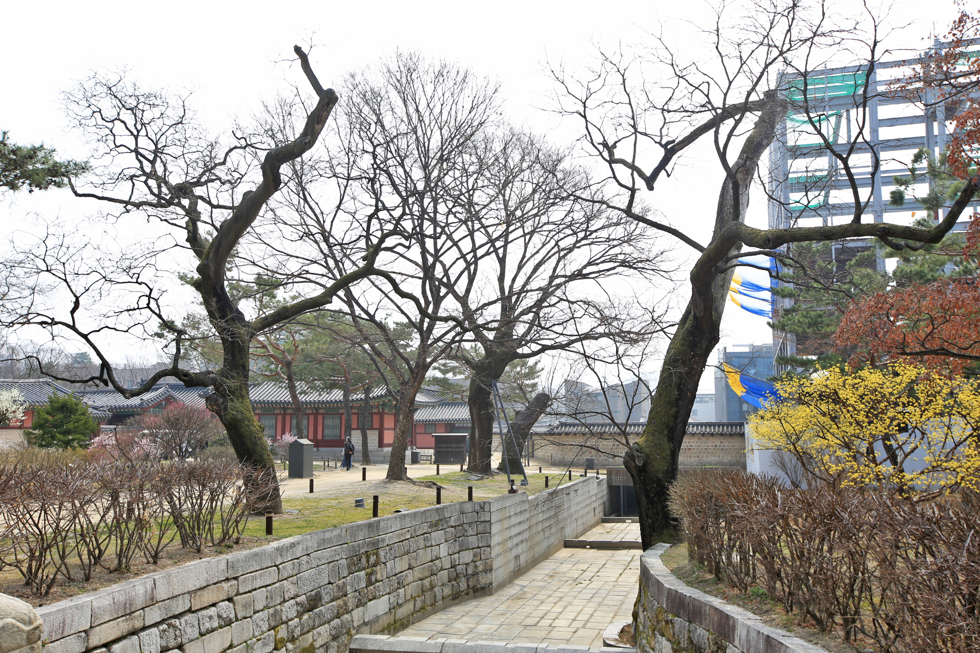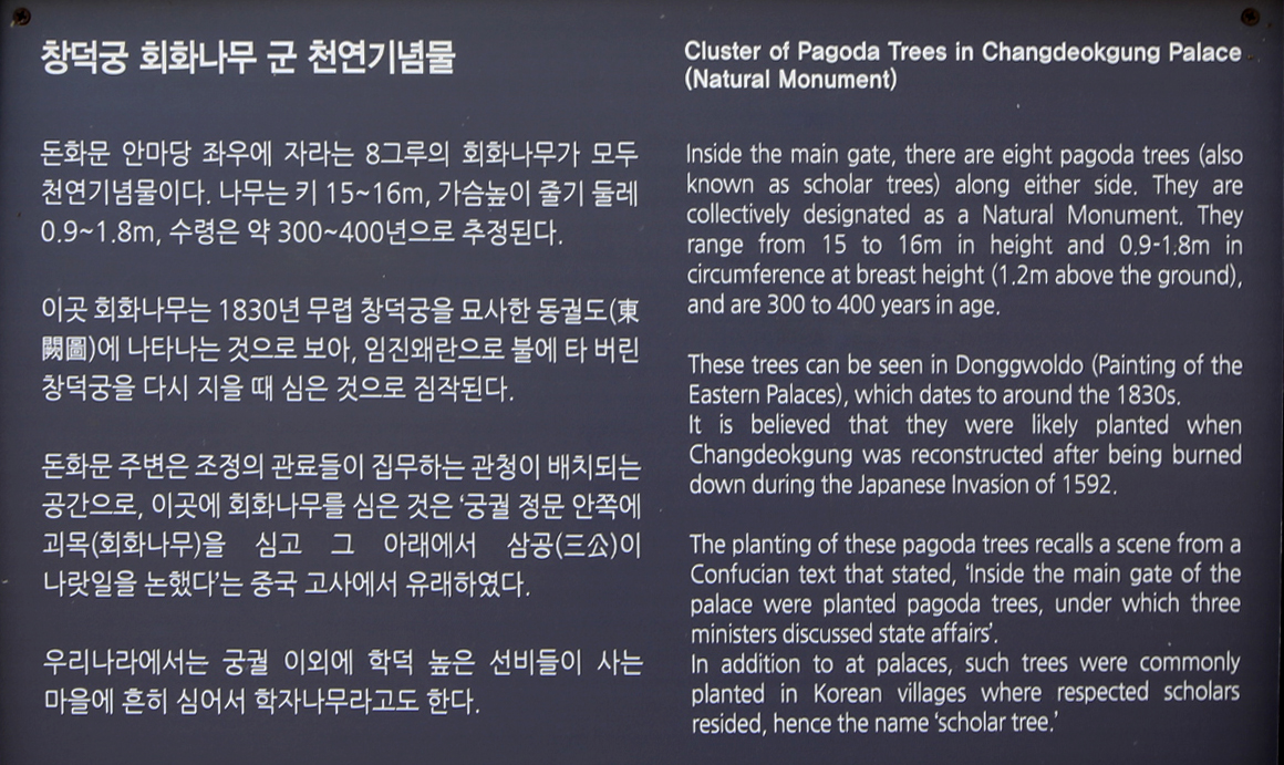 돈화문은 보수공사 중이라 철골구조물로 둘러 쌓여있어서 금호문으로 입장하였다. 돈화문 주변에 회화나무(훼나무)가 8그루 있다고 한다. 어린 시절 대전 성북동 고향집 인근에 있던 훼나무에서 그네도 타고 소꿉친구와 셋이서 빠꼼살이(소꿉놀이)도 했던 추억이 있어서 지금도 훼나무를 보면 그냥 지나치지 못한다. 가장 어린 시절의 기억 중 하나인데 빠꼼살이 친구 중 하나(이ㅇ순)는 고등학교 다닐 때 마지막으로 보았고 하나(김ㅇ수)는 저세상으로 갔다.