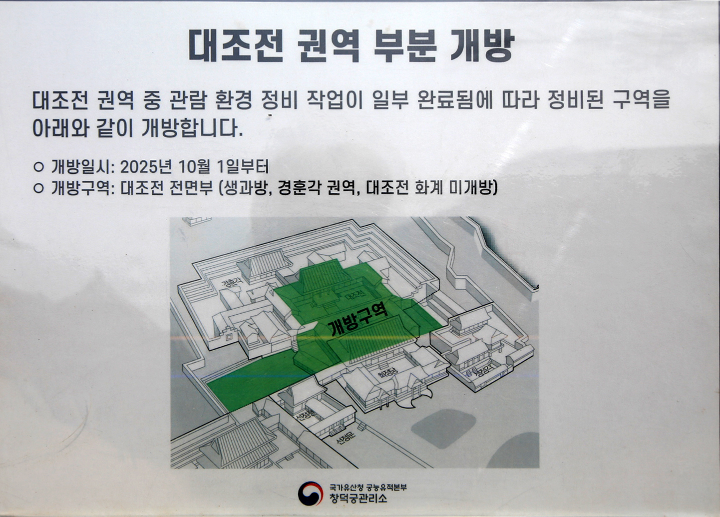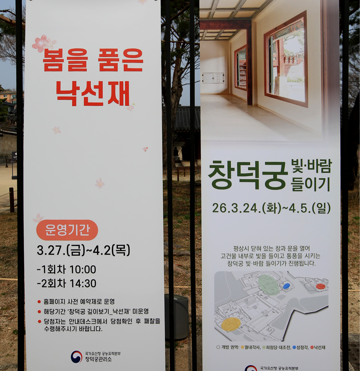 평소에는 대부분의 문이나 창문이 닫혀있는 상태(아래사진)인데 '창덕궁 빛·바람 들이기 행사(20260324-20260405)'기간이라서 열려있다. 평상시 닫혀있는 창과 문을 열어 고건물 내부로 빛을 들이고 통풍을 시키는 중이라고 한다. 덕분에 평소에 볼 수 없던 곳까지 들여다 볼 수 있는 기회였다.