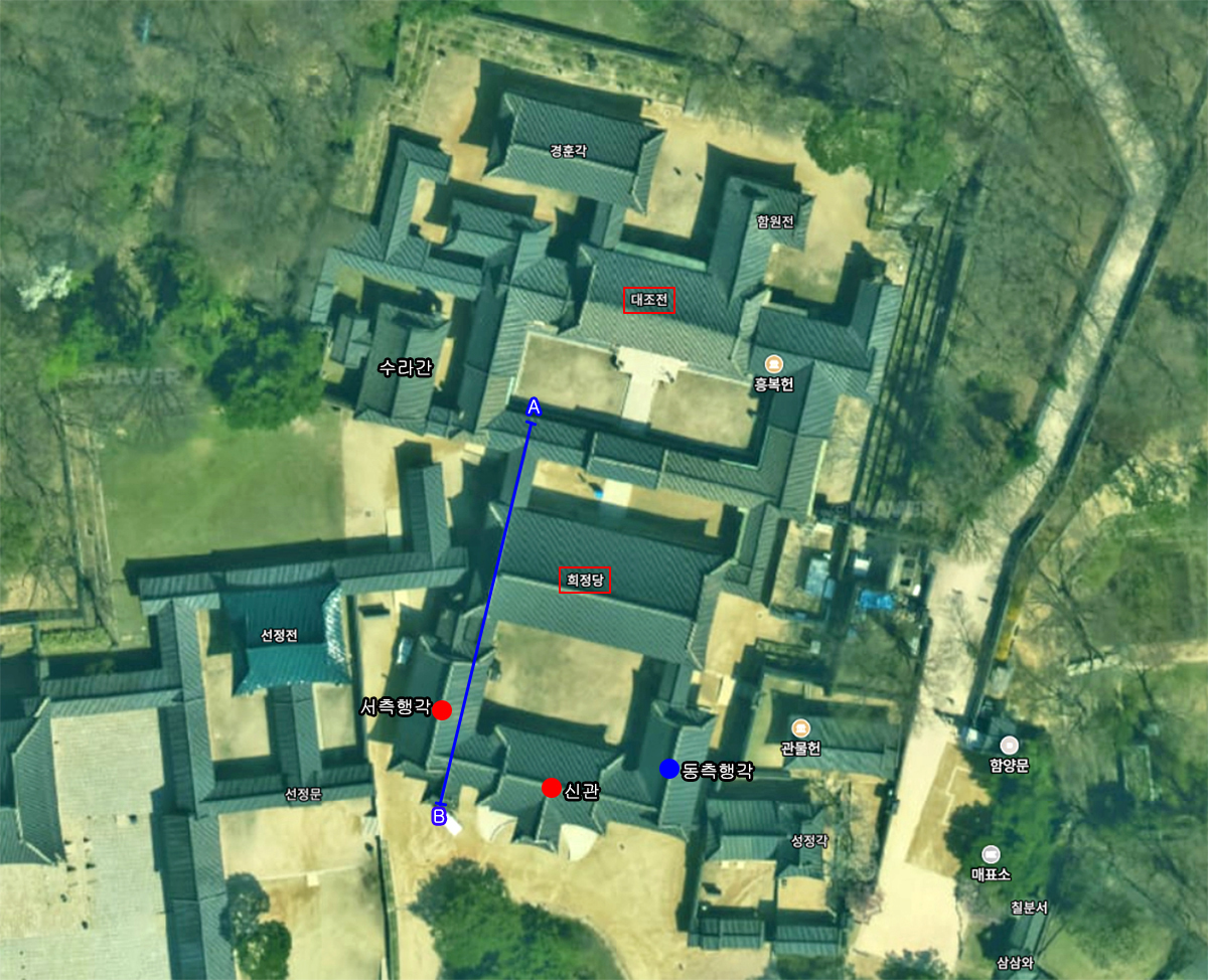 희정당 연결 복도행각-희정당-희정당 서측행각의 끝(B)까지 보인다. 거리가 60m이다.