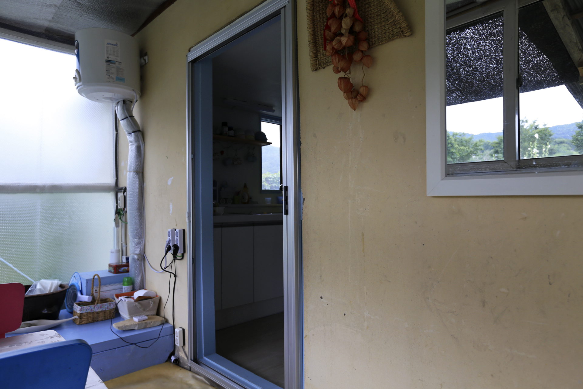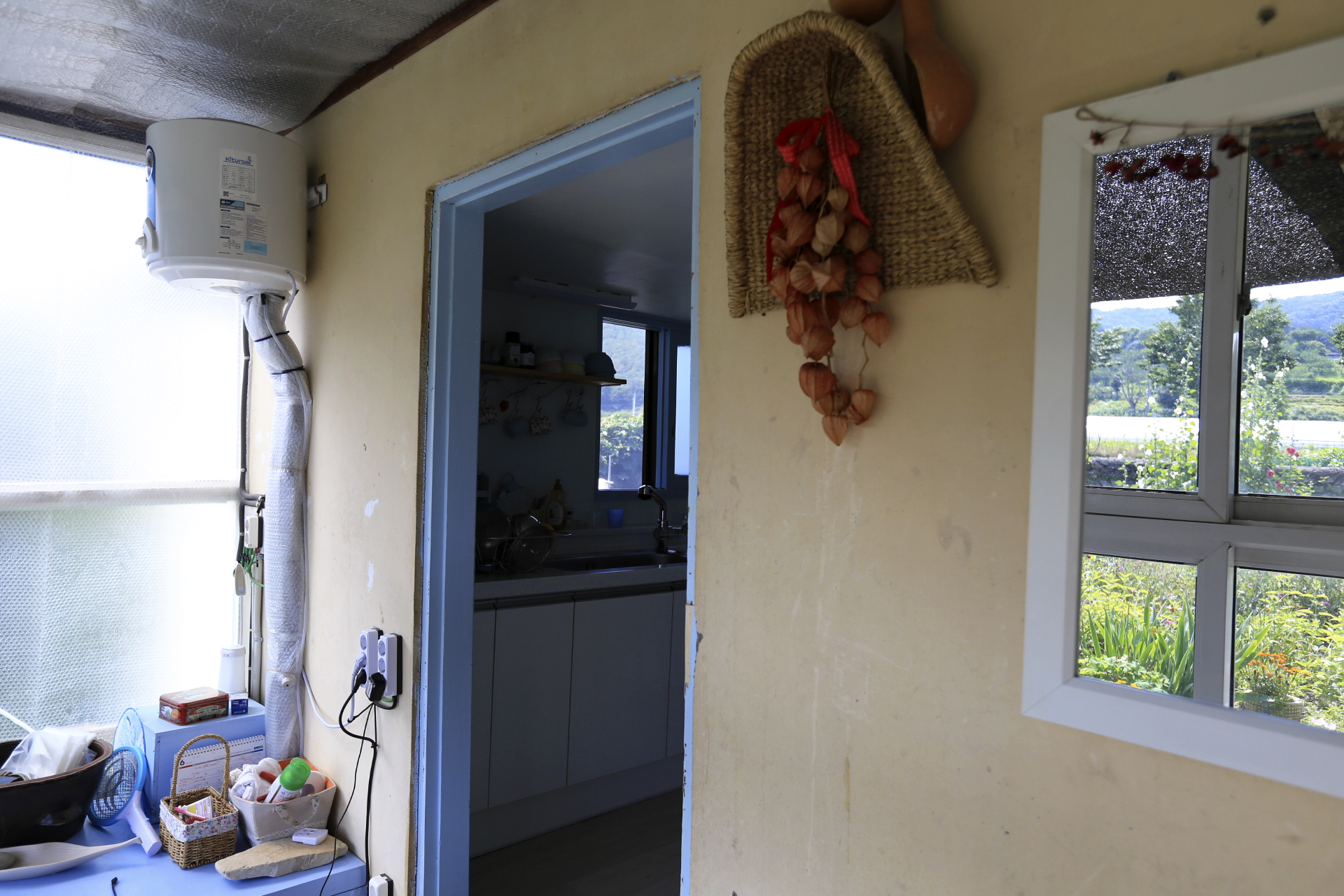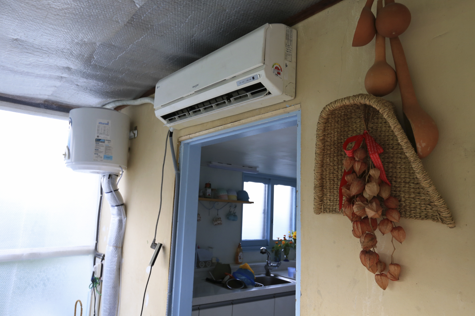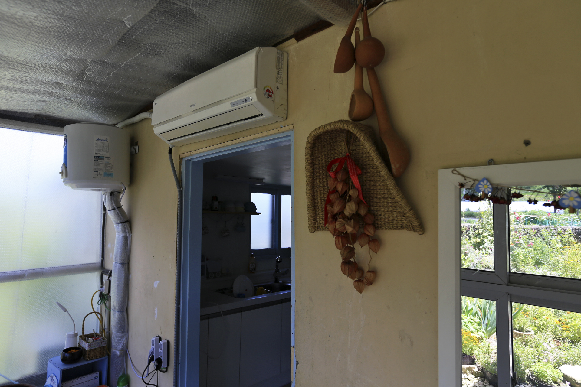 에어컨을 설치하며 구 온실문 부분의 중간 칸막이 커튼으로 사용하기 위하여 주방문 커튼을 떼어다 사용했던 것을 원래의 위치인 주방문에 다시 설치하였다. 커튼이 에어컨을 가동할 때 불필요한 공간까지 냉방을 해야 하는 낭비를 막아주는 효과가 있다.