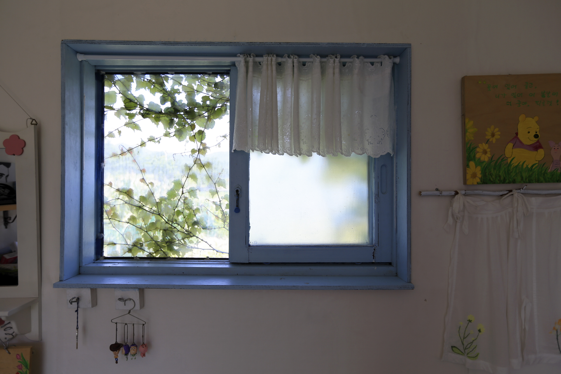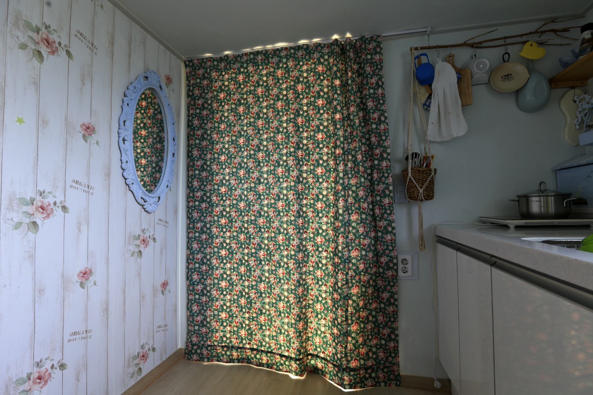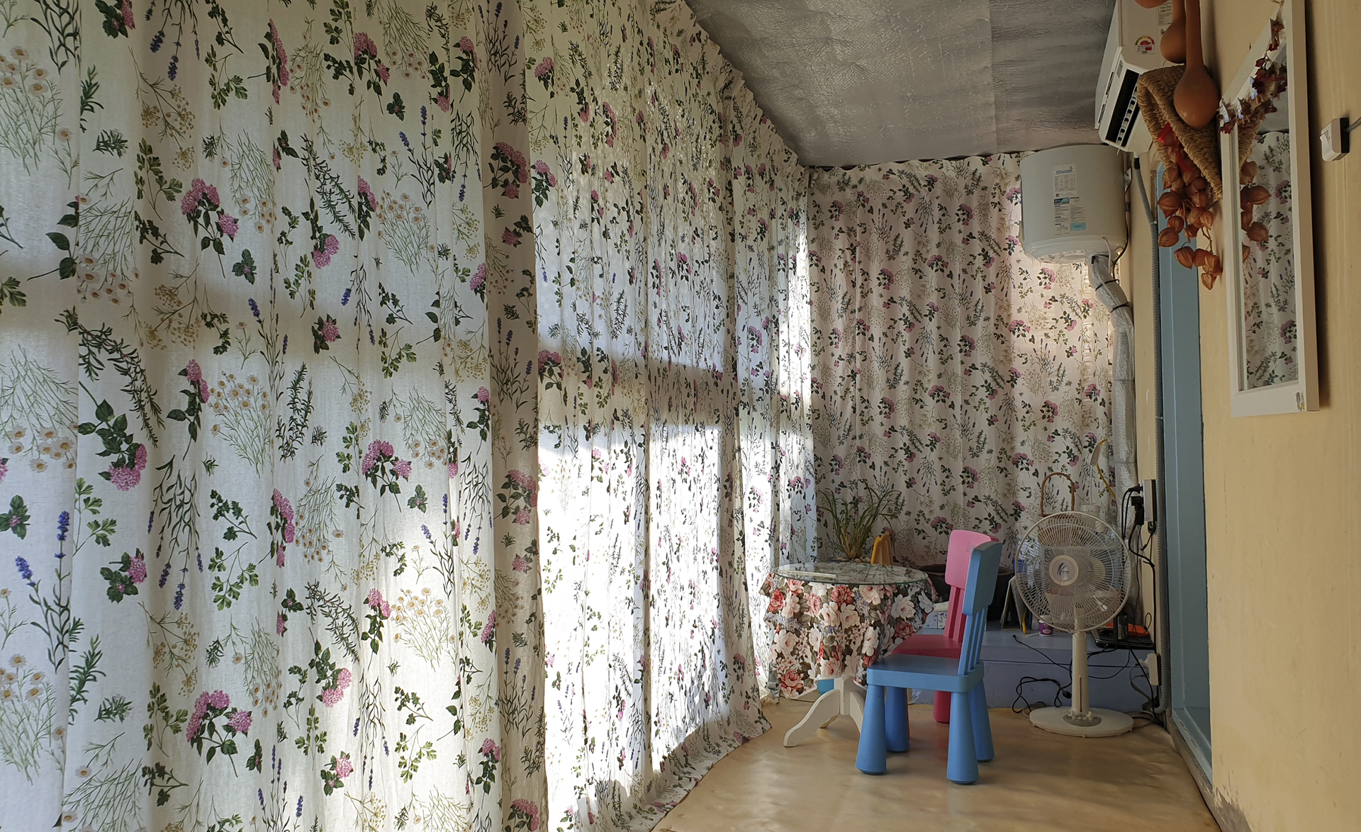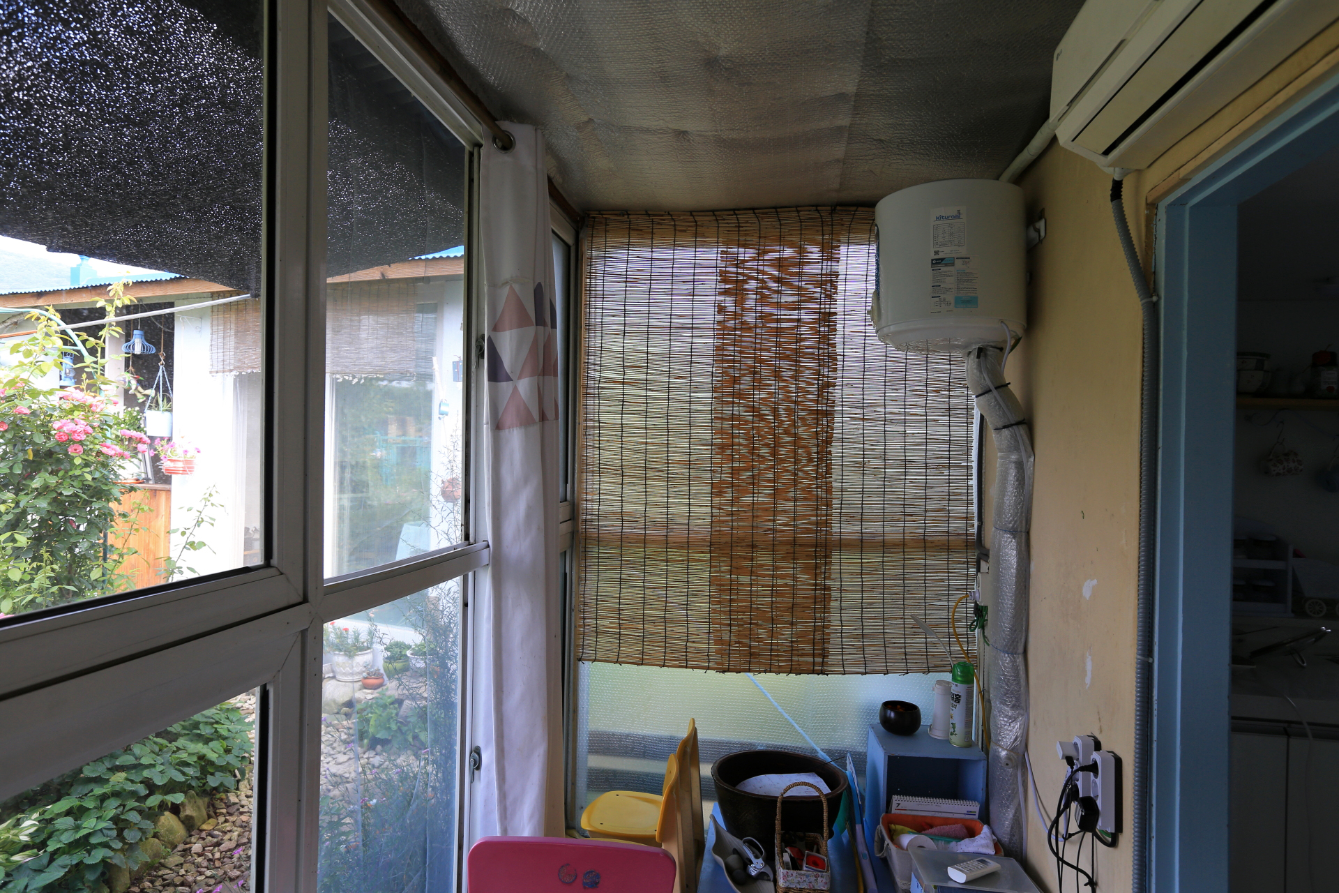 에어컨을 설치하며 구 온실문 부분의 중간 칸막이 커튼으로 사용하기 위하여 주방문 커튼을 떼어다 사용했던 것을 원래의 위치인 주방문에 다시 설치하였다. 커튼이 에어컨을 가동할 때 불필요한 공간까지 냉방을 해야 하는 낭비를 막아주는 효과가 있다.