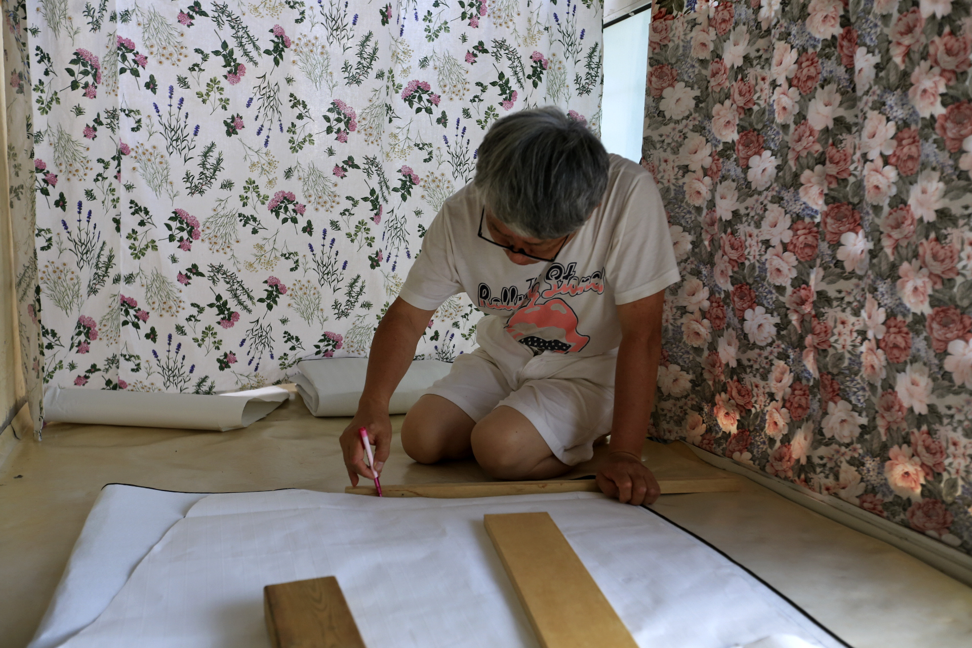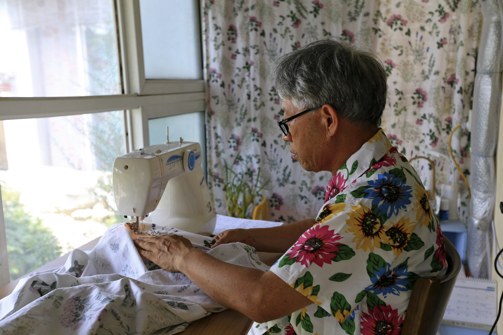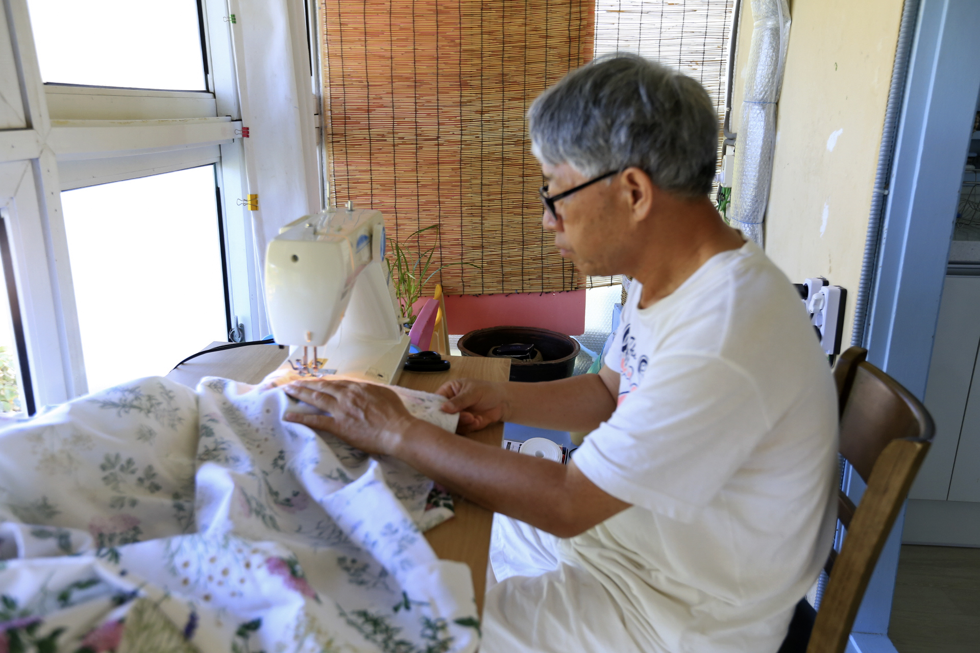 어제 임시로 커튼을 달고 보니 너무 단순하다. 주방쪽 데크를 ㄷ자로 3면에 같은 무늬의 원단으로 만들었다. 원단의 수량을 산출 할 때 아내는 두 가지 이상의 무늬를 생각한 모양인데 나는 단순한 것이 좋다며 한 가지 무늬로만 하자고 하였었다. 다행인 것은 구입한 원단이 데크 전체에 커튼을 설치할 분량이 아니라는 것이다. 구 온실 부분은 기존에 데크에 설치했던 커튼 등을 재활용하기로 하였던 것이다. 커튼 한 폭 만이라도 다른 무늬로 만들어서 포인트를 주기로 하여 추가로 한 폭짜리 커튼을 만들었다. 임시로 설치한 커튼 전체를 일정한 높이로 표시하여 시침을 해서 오전에 재봉질을 완료하고 진잠에 가서 커튼 바퀴를 구입해 왔다. 커튼을 설치하는 것으로 나흘간의 본채 데크 커튼 만들기를 완료하였다.