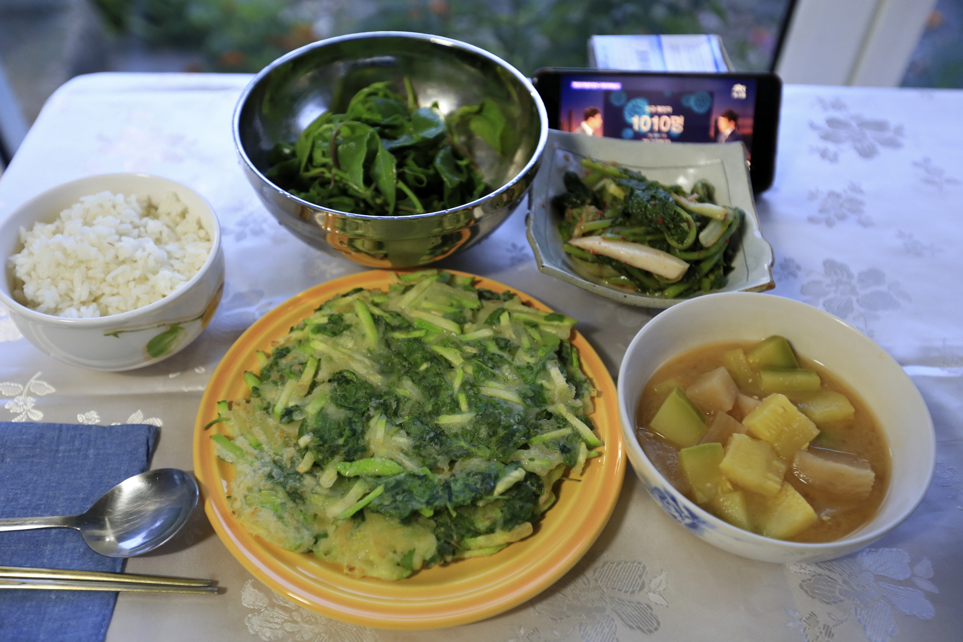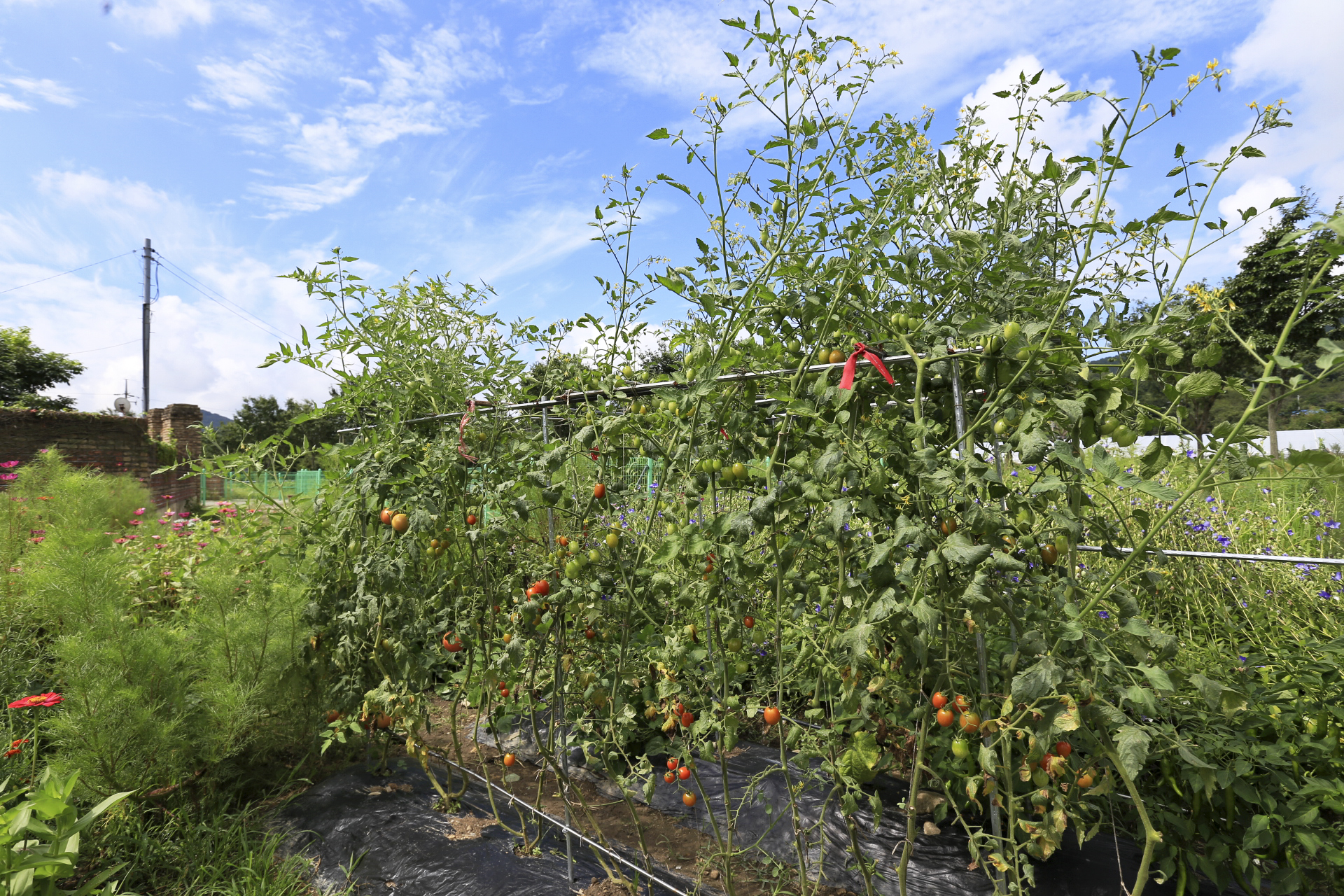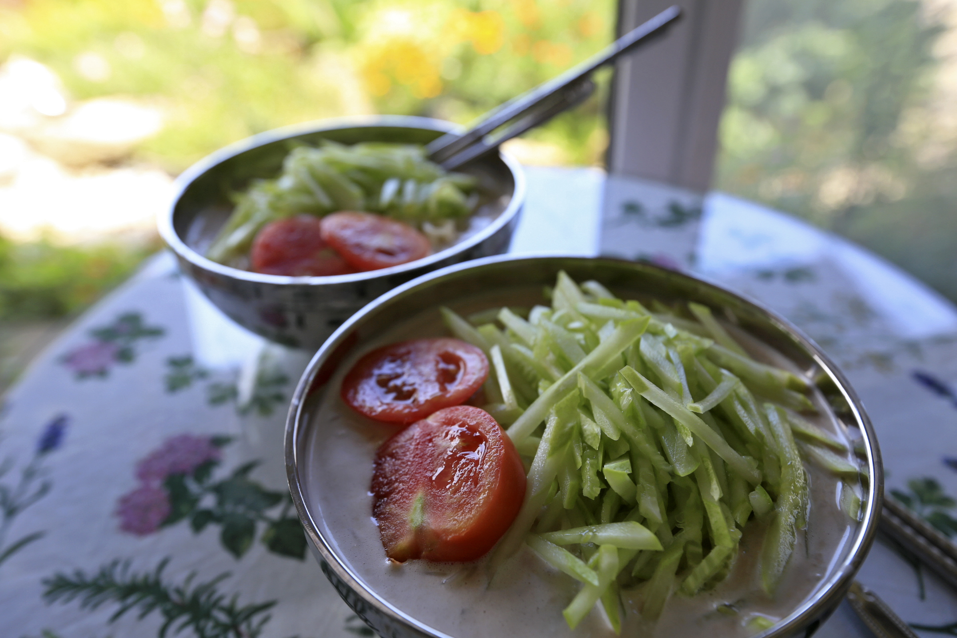 점심으로 텃밭에서 키운 토마토와 오이가 고명으로 얹은 견과류국수를 먹었다.