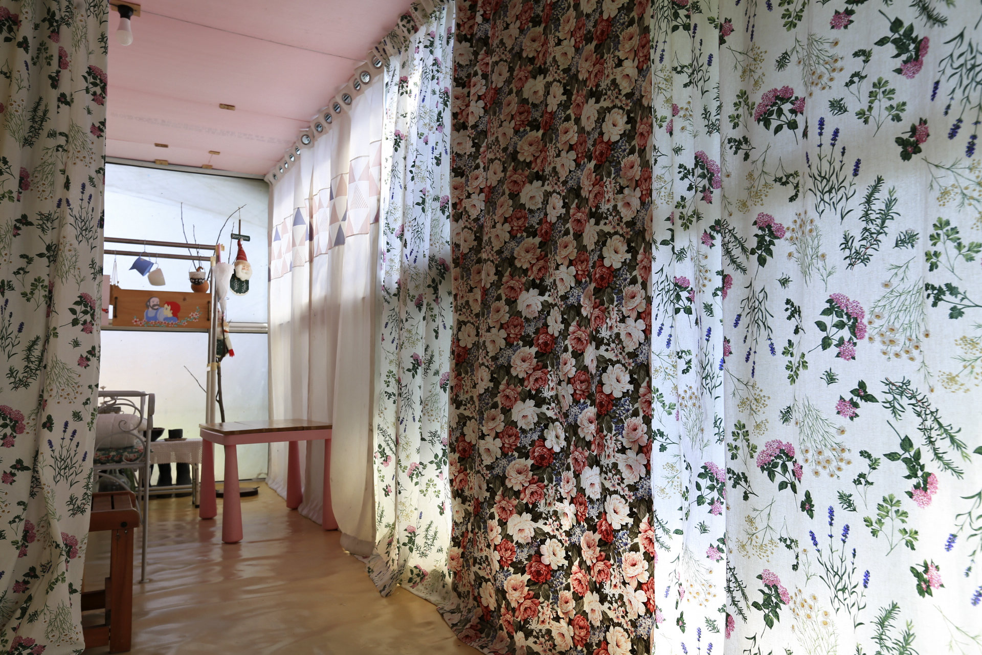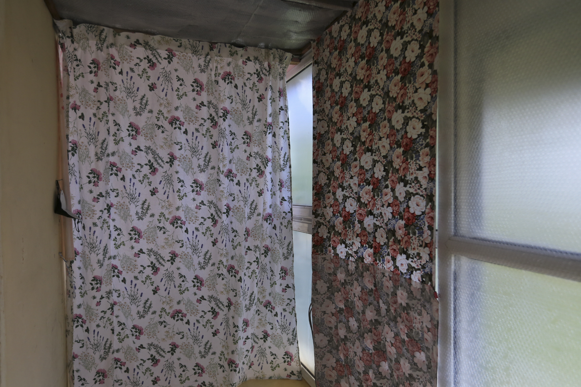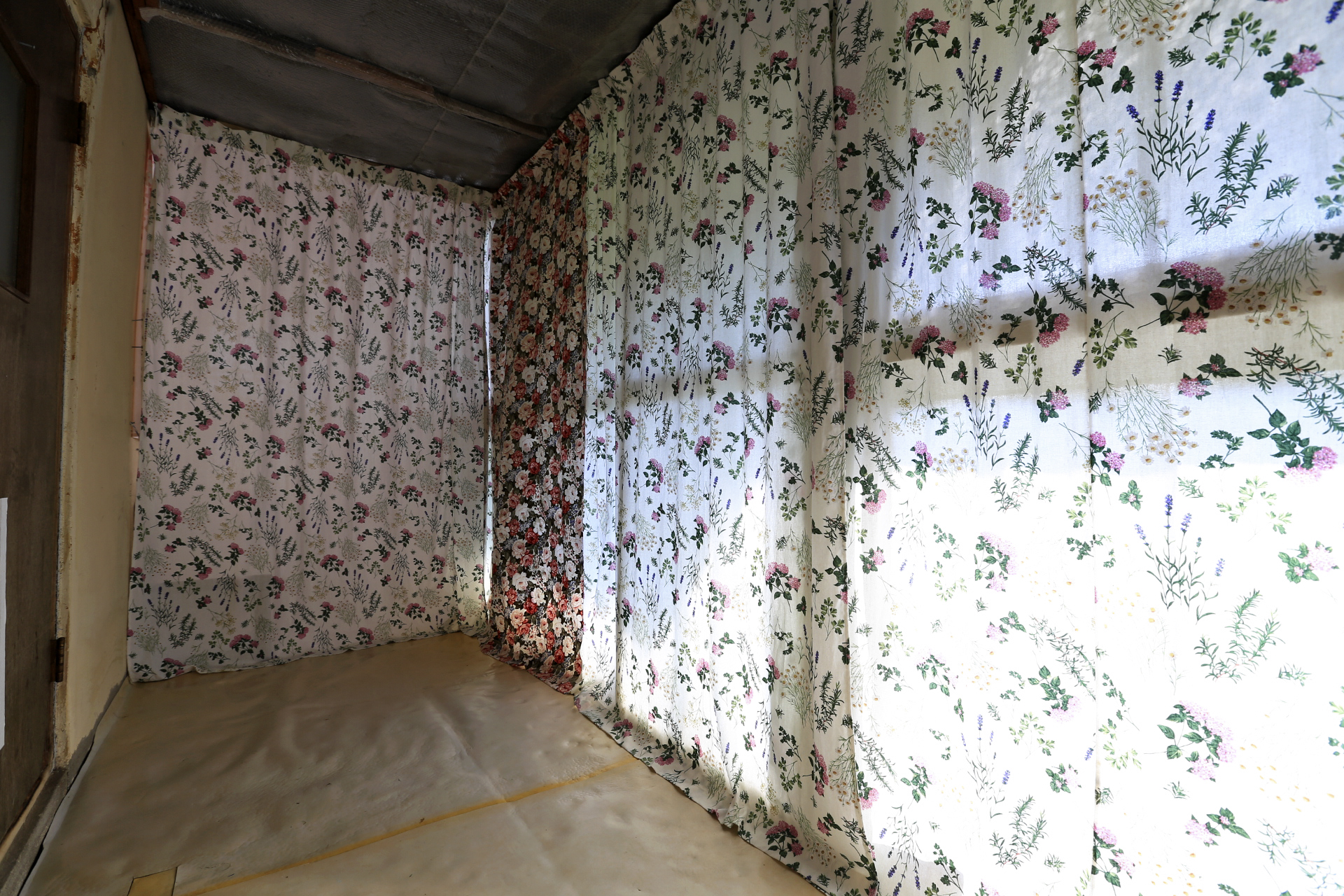 구 온실 부분은 전부터 테크 투명유리창 부분에 사용하던 커튼을 보수한 것과 이번에 구입한 커튼 원단의 잔여부분을 이용하여 만든 커튼을 설치하였다.