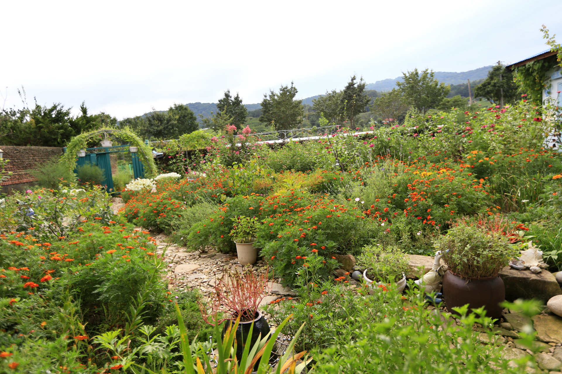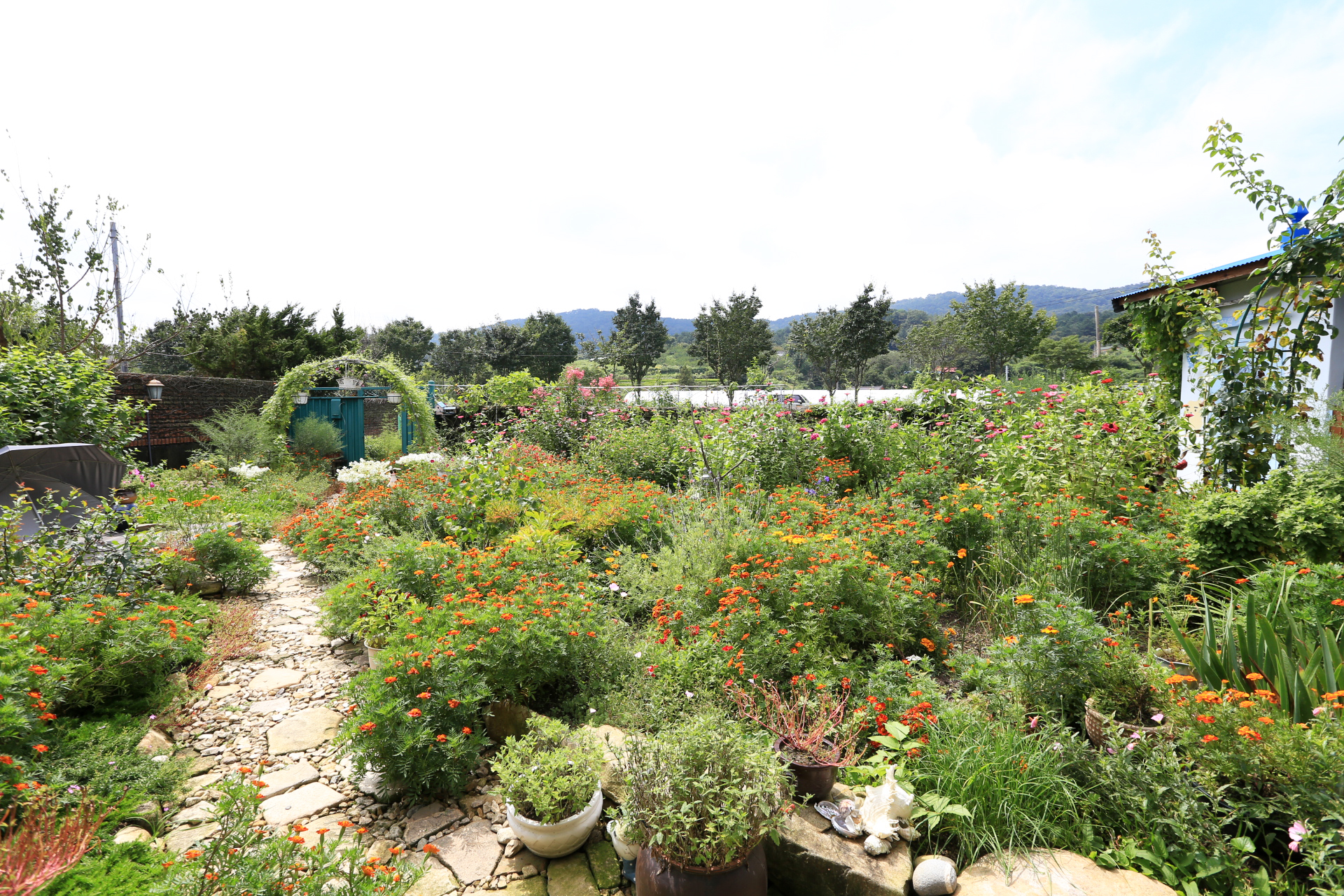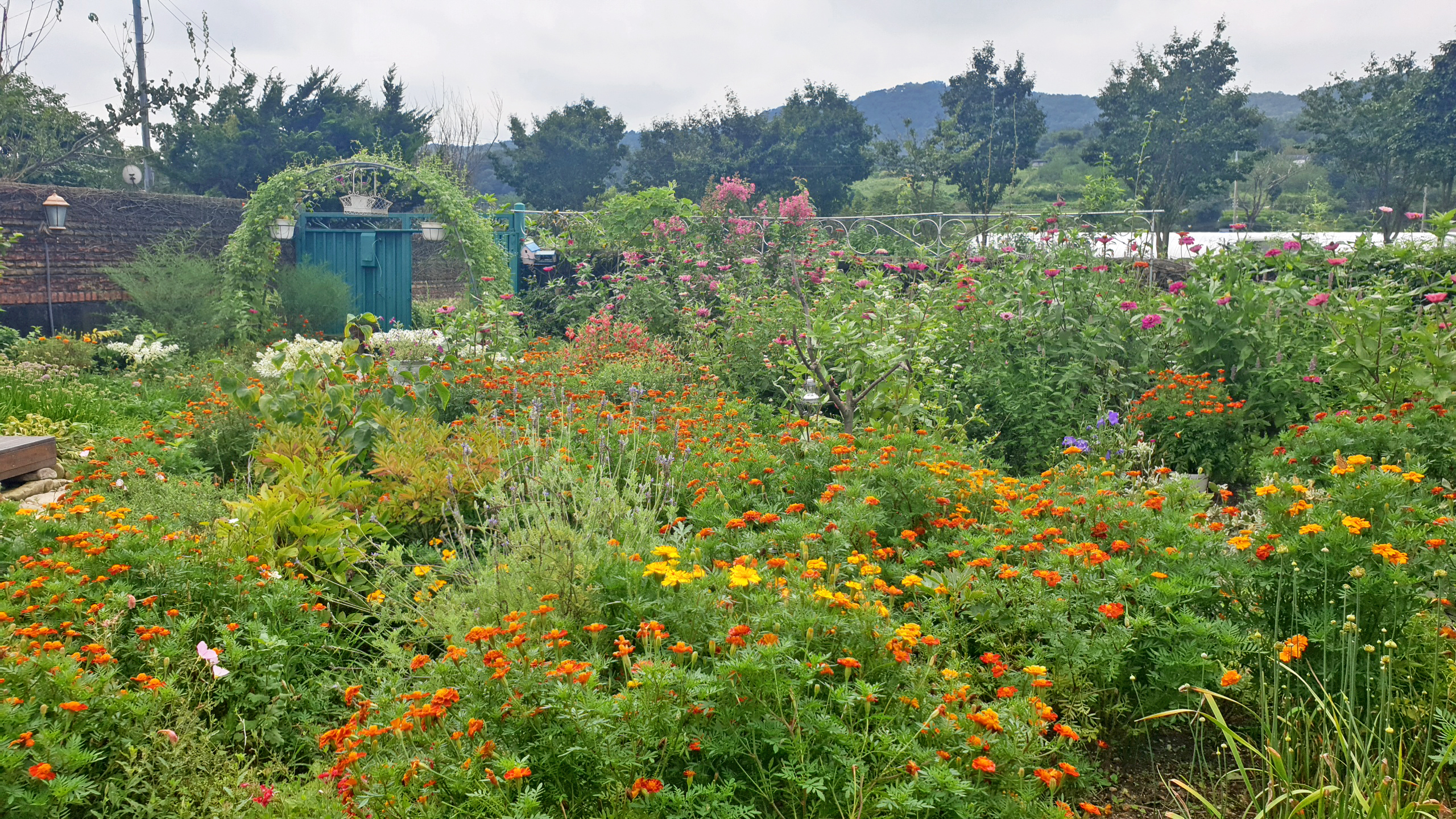 작년에는 메리골드가 너무 빽빽하여 올해는 드문드문 심었다. 초여름까지는 너무 드물게 심지 않았을까 해서 화분에 심은 메리골드를 중간중간에 놓았다. 메리골드가 한창인 요즈음은 화분을 치웠는데도 한 포기가 너무 커져서 빽빽한 느낌이다. 특히 통로에 난 메리골드를 그대로 두었더니 출입이 불편하다. 내년에는 통로에 난 메리골드는 철저히 뽑기로 하였다.