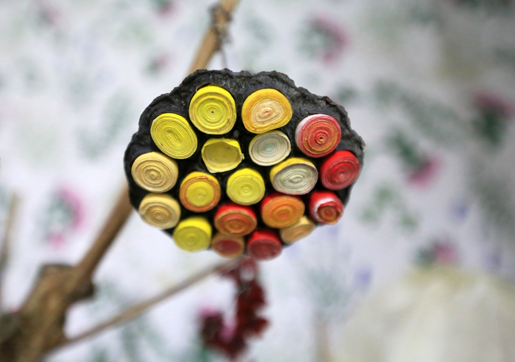 예전에 양평 두물머리에서 주워온 연꽃 씨방에서 씨앗을 빼낸 자리에 딸내미가 색종이를 돌돌 말아서 장식품을 만들었었다. 오래 두었더니 색종이가 바래서 뒤집어서 다시 꽂았단다.