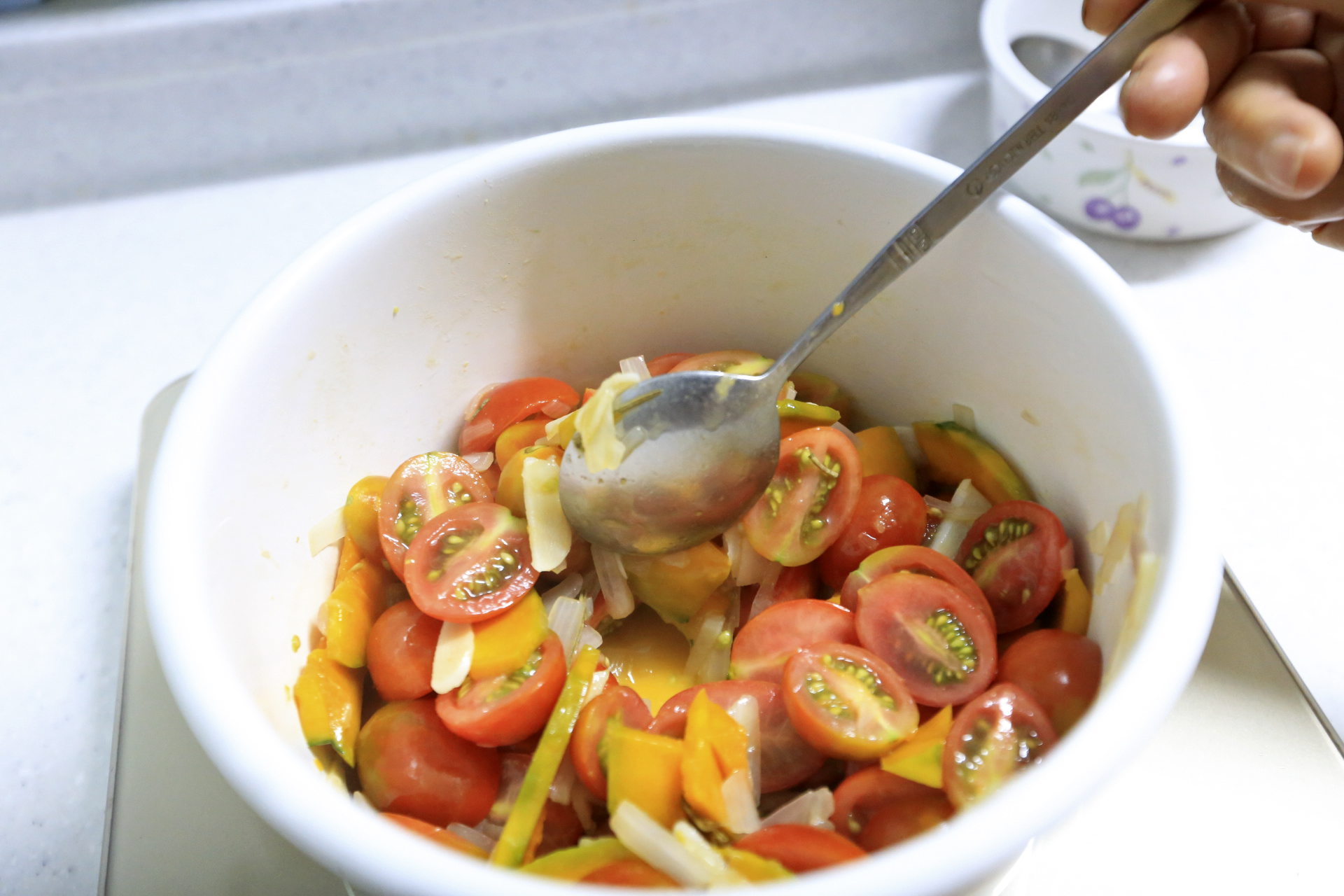 텃밭에서 딴 토마토를 설탕에 졸여서 스파게티소스에 섞어서 만든 스파게티로 전에 먹은 스파게티보다 달짝지근해서 좋다.