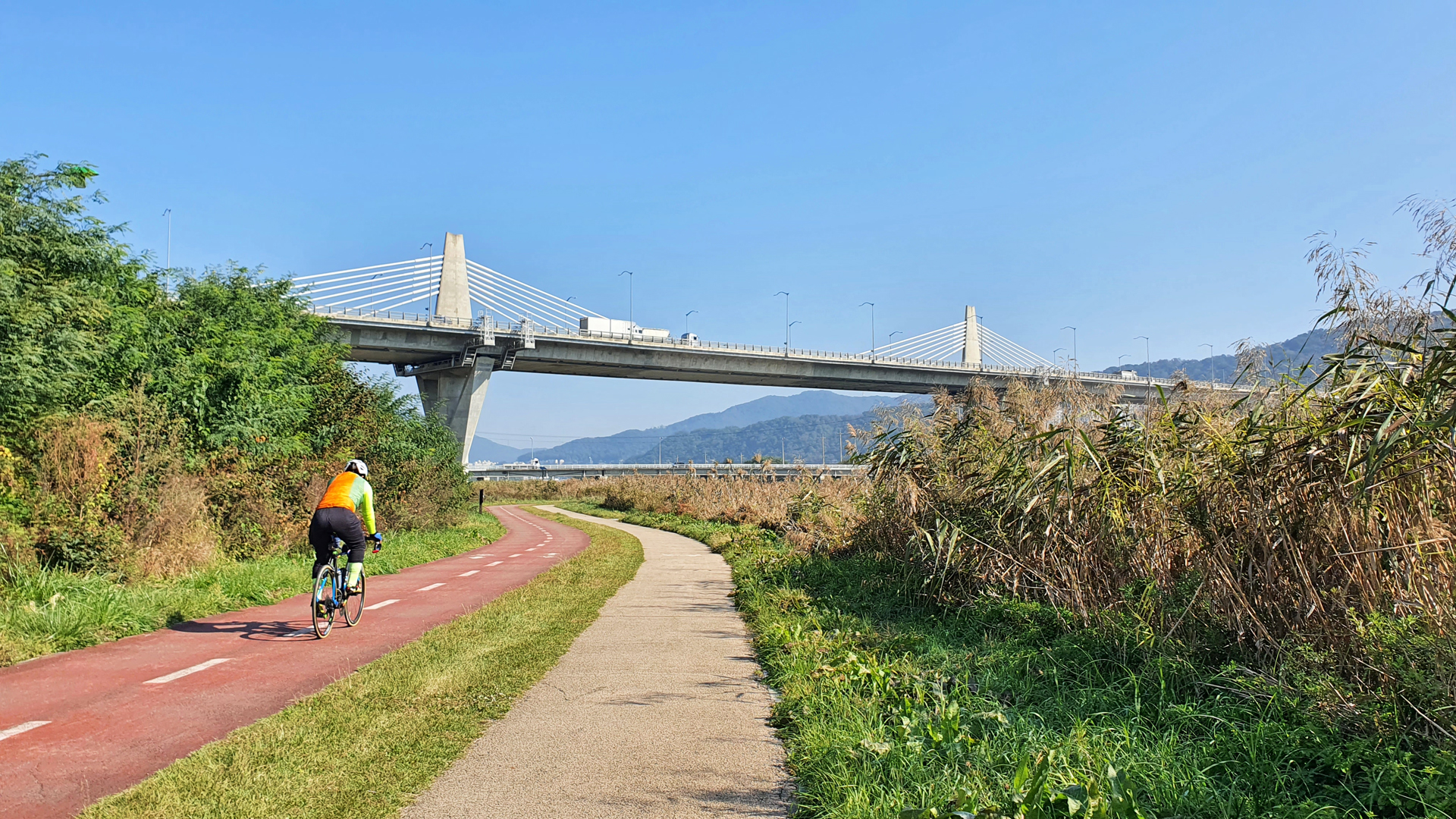 아침에는 썰렁했는데 경안대교에 도착하니 덥다. 다리 아래에서 점퍼를 벗어서 배낭에 넣고 있는데 옆 의자에서 쉬던 분들이 일어나니 자리가 난다. 다른 분이 '회장님! 쉬어가세요.' 라고 하는데 기차 시간 때문에 쉴 새가 없다고 대답하였다. 여행 중에 만난 분들과 대화 할 기회였는데 아쉽다.