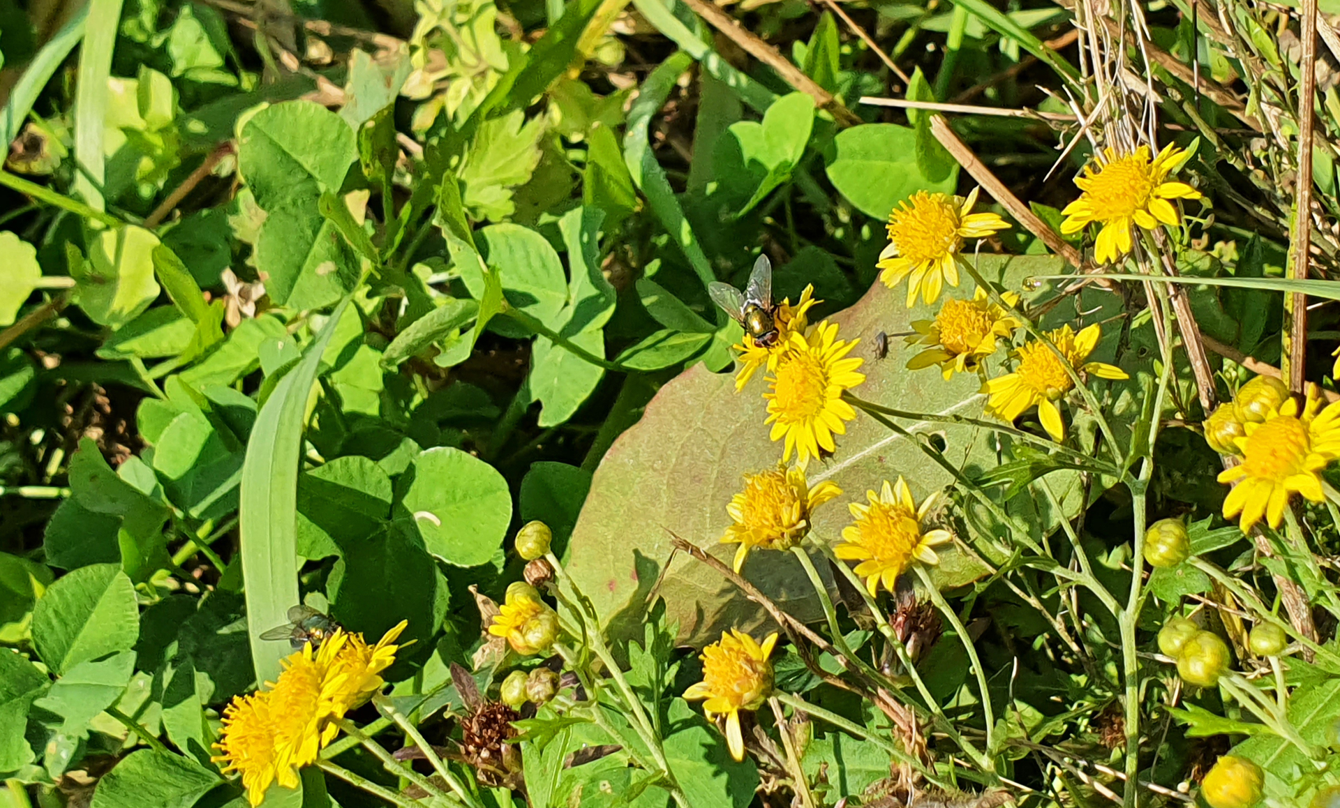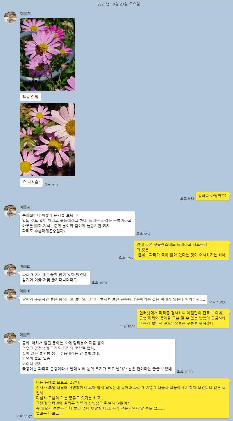 위쪽을 포함하여 세 군데에서 감국 사진을 촬영하였는데 모두 피리인지 등에인지가 앉아 있다. 그렇지 않아도 이 분야에 관심이 많은 친구 이ㅇ희와 카카오톡으로 대화(1023)를 하였는데 친구의 의견처럼 등에쪽으로 기운다.