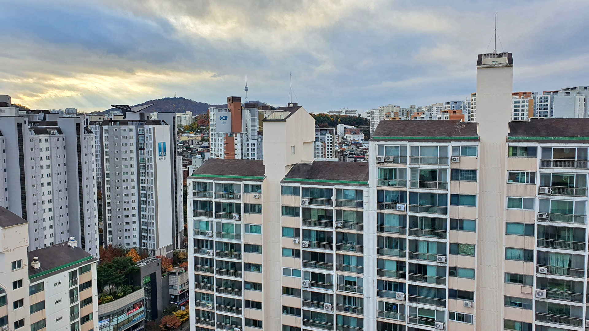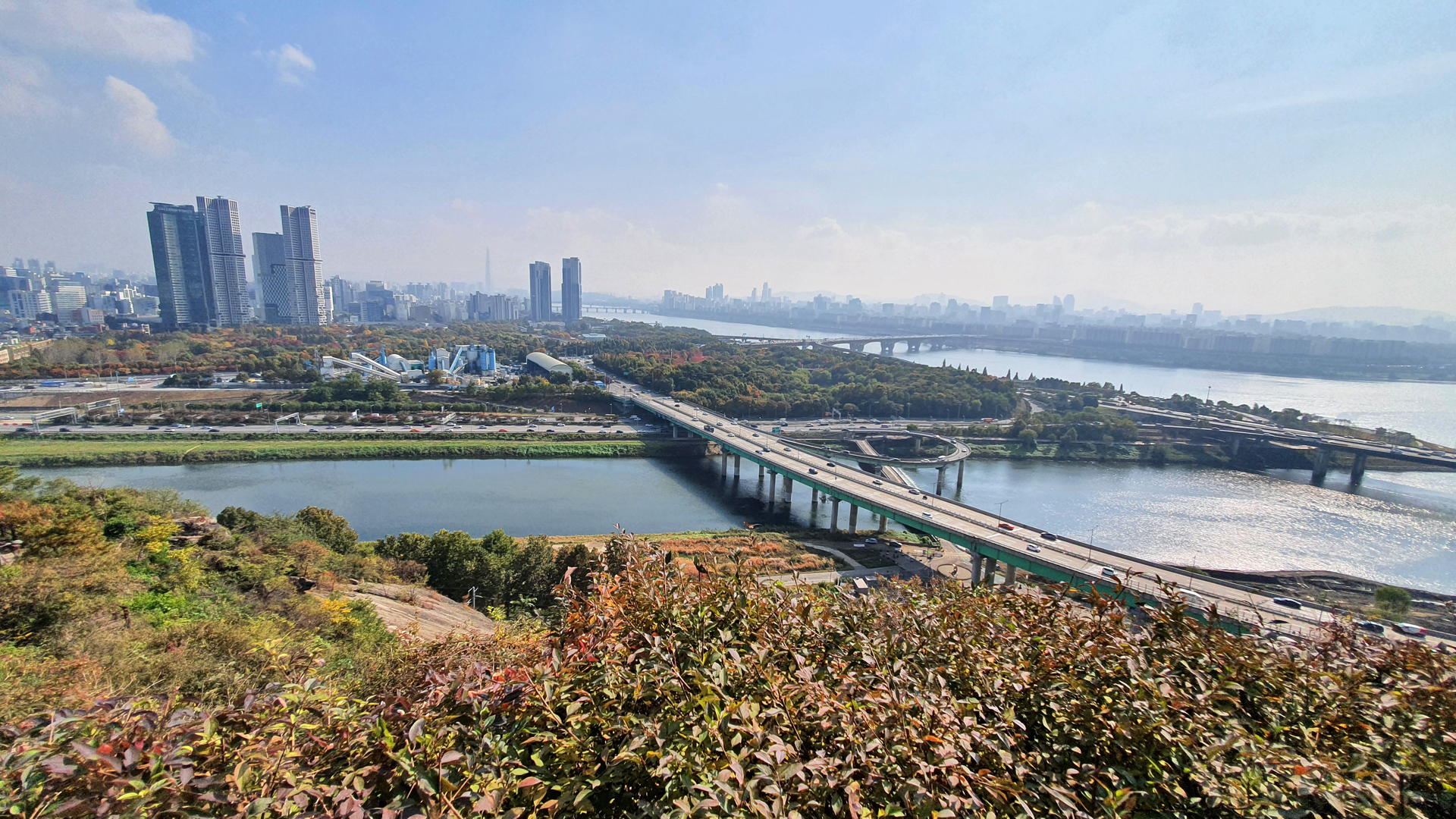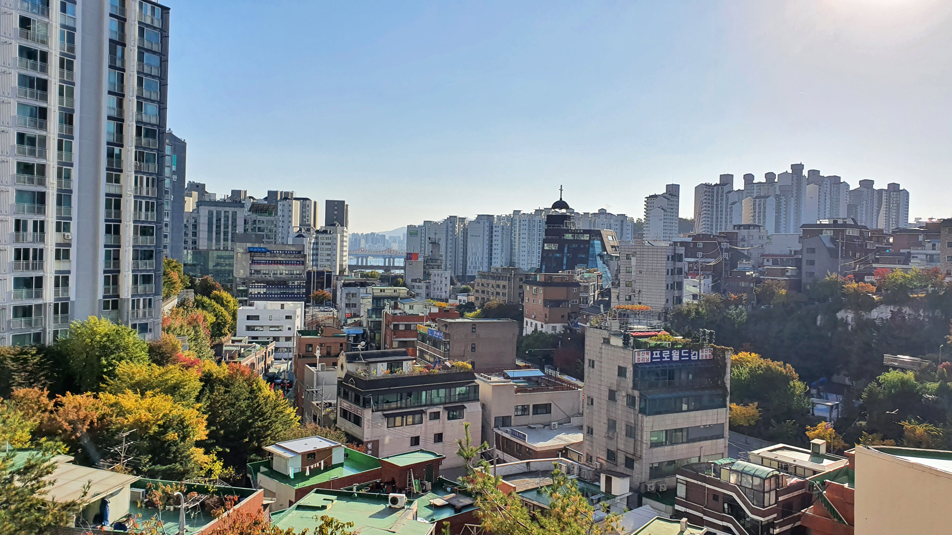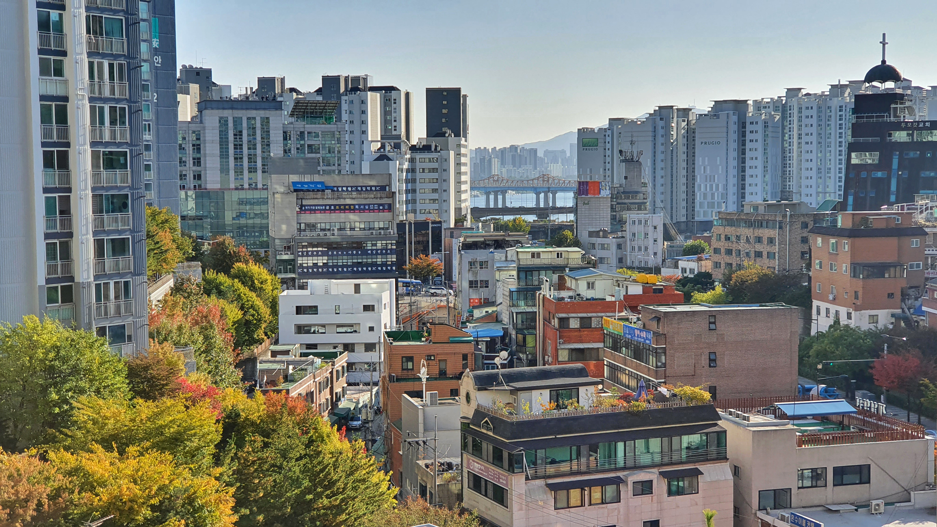 멀리 인왕산 아래 빌딩 사이로 권율도원수 집터에 있는 은행나무가 보인다.