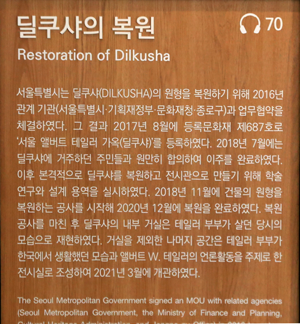딜쿠샤의 주인인 앨버트 W. 테일러가 독립선언서와 관련기사를 미국에 보내서 국외에 알린 인연이 있다. 복원공사를 마치고 올 삼일절(20210301)에 개관했다니 뜻깊은 일이다. 5년 전에 친구 이ㅇ인과 이ㅇ조와 셋이서 방문했을 때(20160614)에는 점유하고 사시는 분들이 있어서 외부는 허술하고 변형이 많이 되었으며, 내부는 사시는 분들의 프라이버시를 존중해야 하니 1층 계단 입구를 들여다보는 정도였다. 이런 상태로라도 건물이 남아있다는 것으로 위안이 되었었다. 두 번째 방문은 큰집 손자와 같이 서울역사박물관에서 개최한 '딜쿠샤와 호박목걸이' 기증유물 기획전(20190303) 관람을 마치고 멀지 않은 곳에 있는 딜쿠샤를 찾아갔다. 이 때에는 복원공사가 진행 중이라 가설울타리가 설치되어 건물로 접근 할 수는 없었지만 울타리 너머로 복원공사를 위하여 해체된 부분을 엿볼 수 있는 행운을 누렸다.