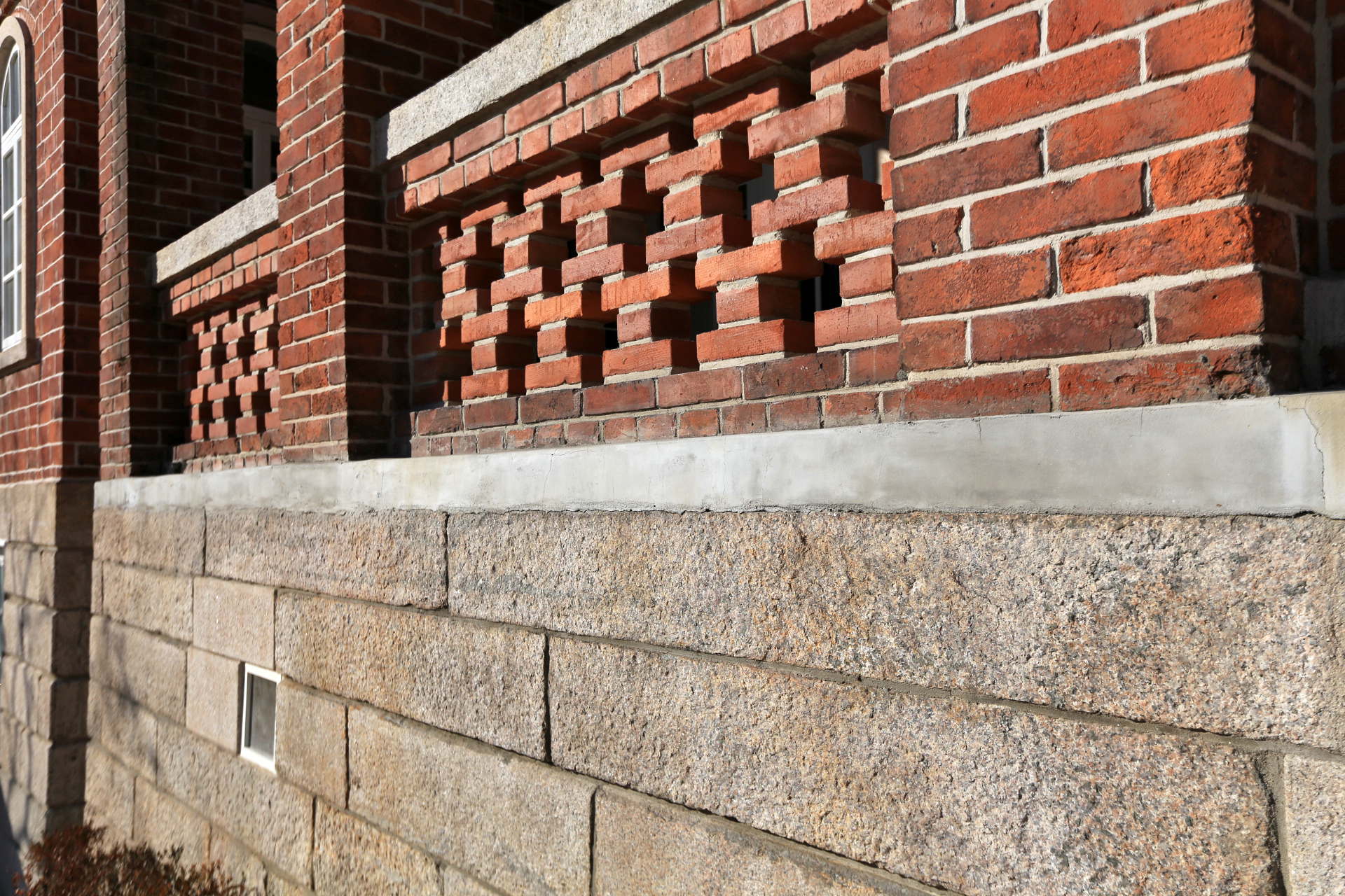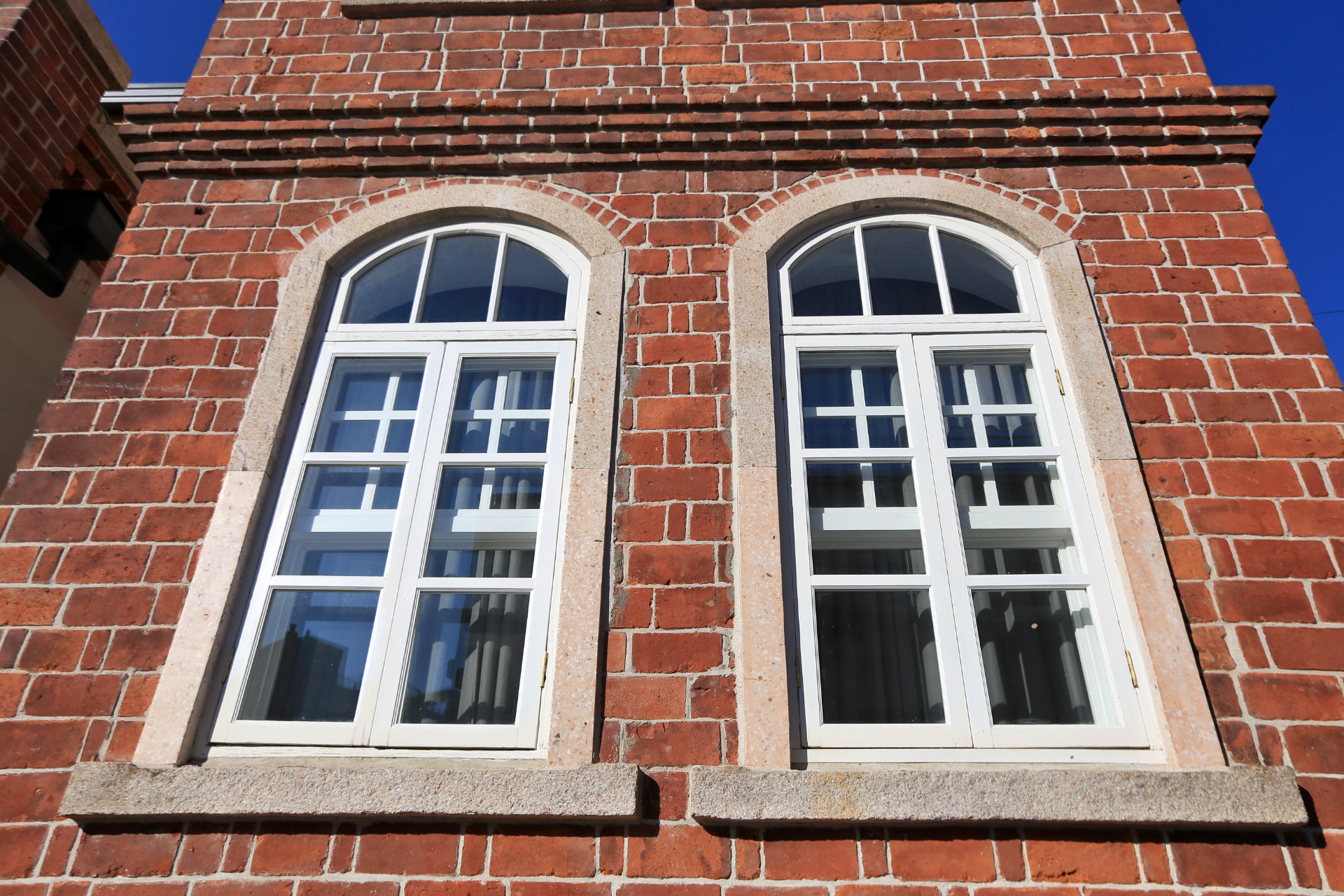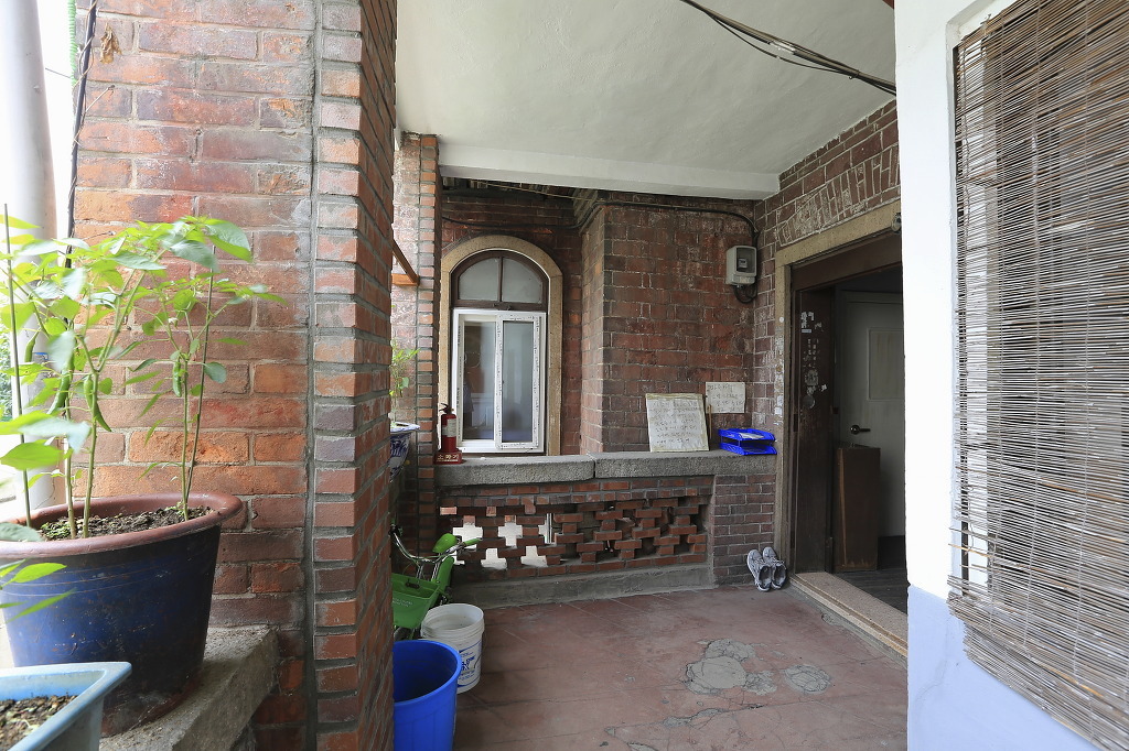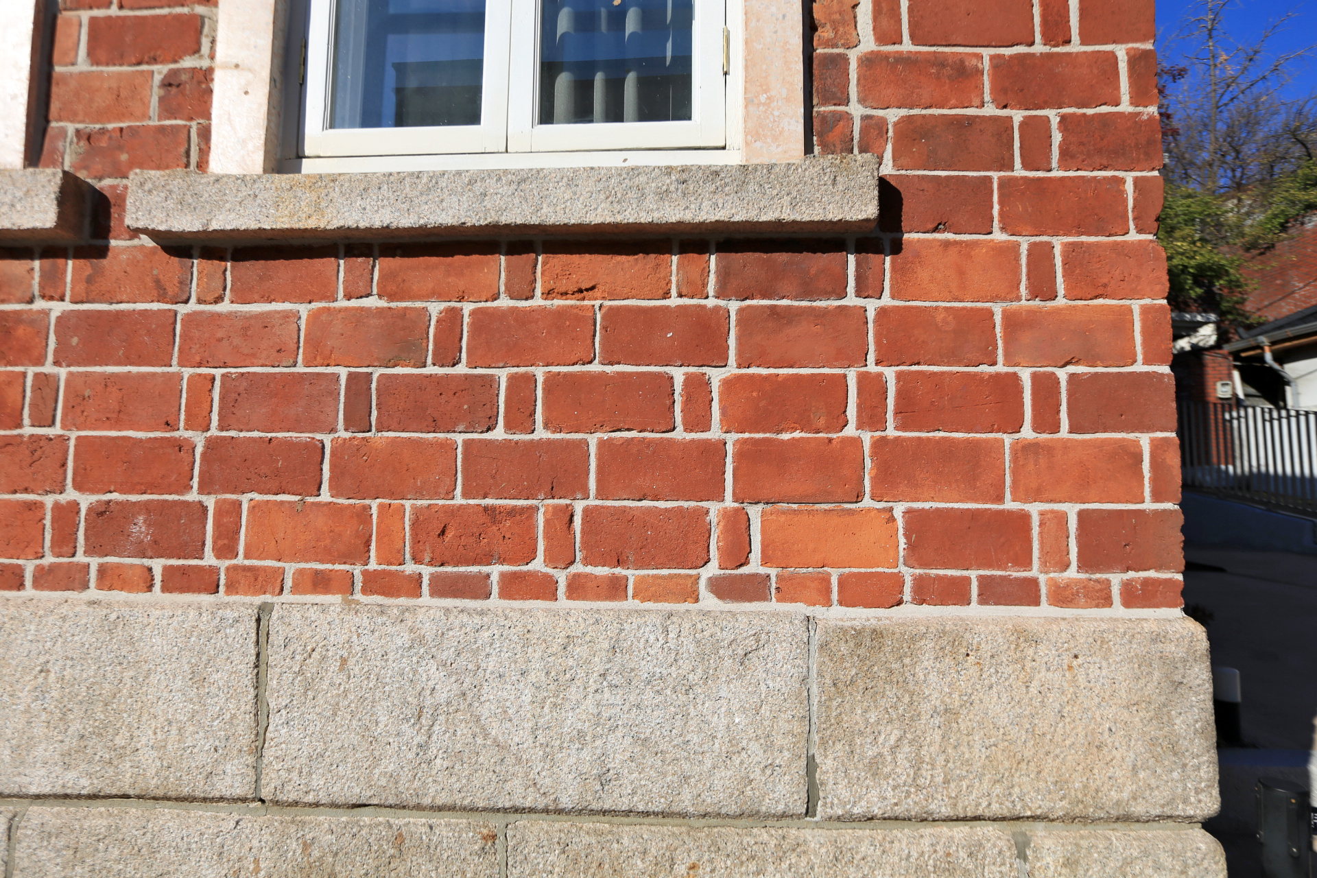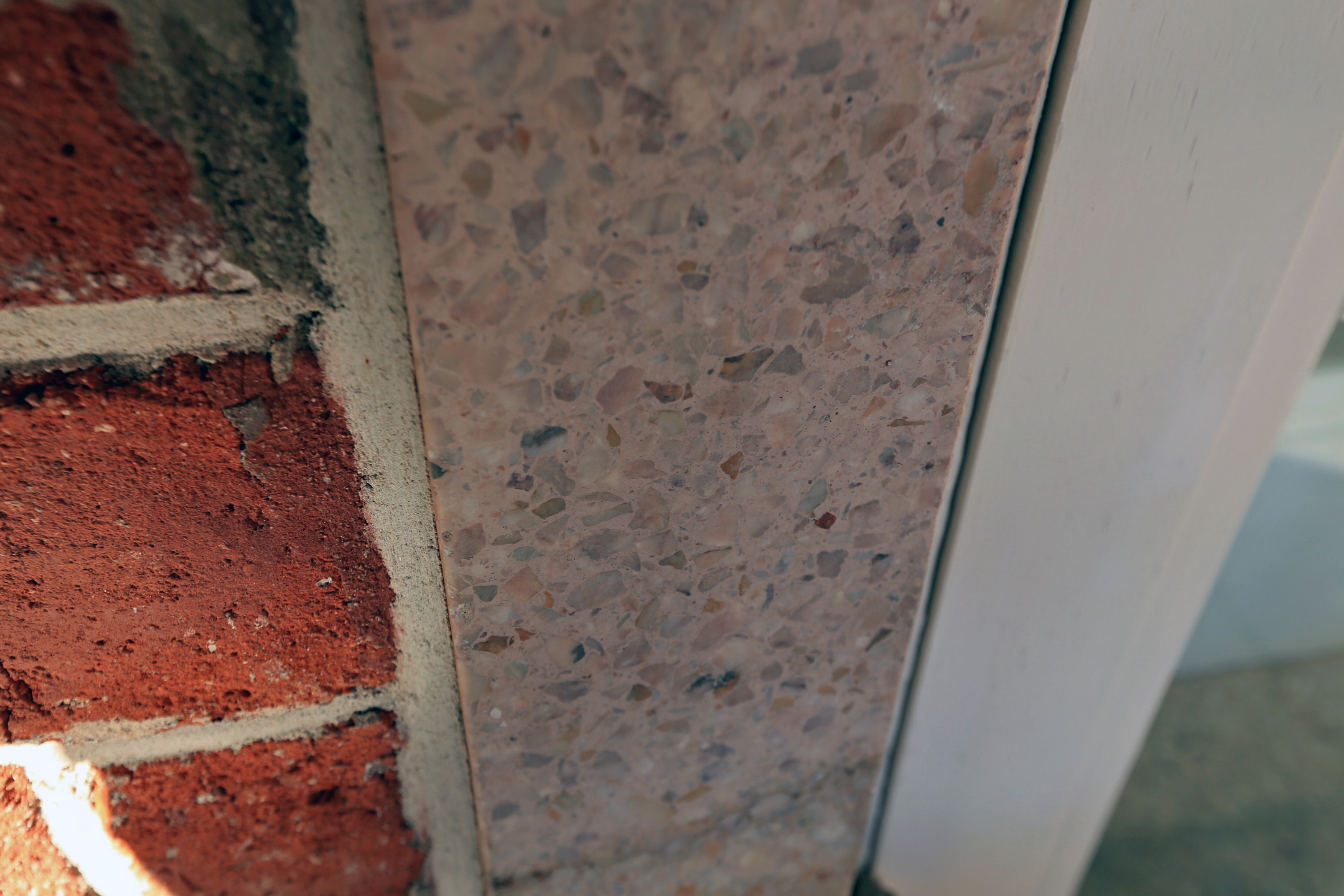 창틀 주변에는 테라죠판을 붙였다. 창틀상부를 오지벽돌 아치쌓기를 한 위에 테라죠판을 붙여서 좀 생소하게 보인다.