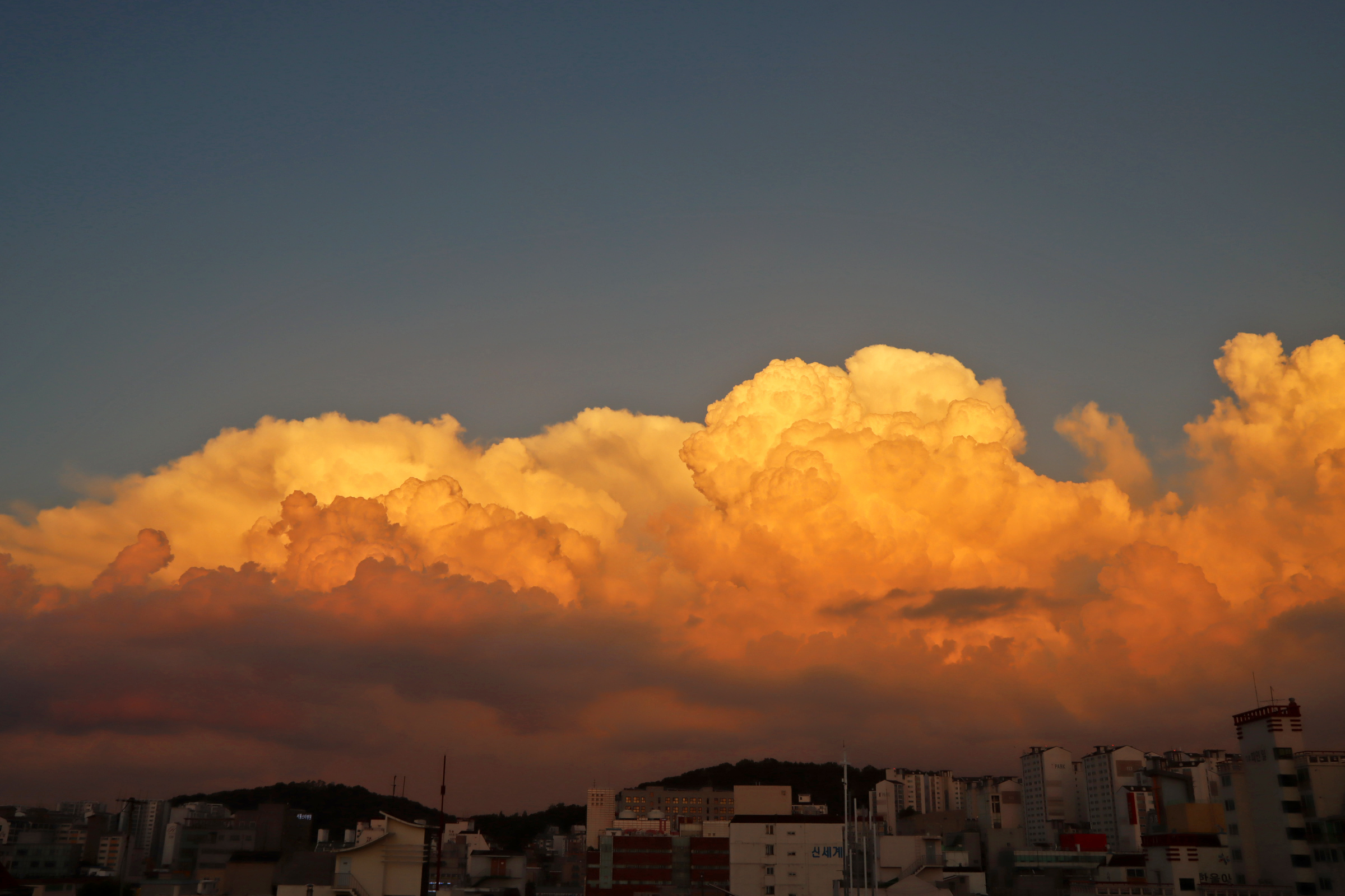무덥던 여름도 기세가 꺾여가는 느낌이다. 덥기는 해도 파란하늘이 가을이 오고 있음을 말해주는 듯하다. 퇴근길에 우장산역에서 초록집으로 걸어오며 보니 저녁노을이 볼만하겠는 생각을 했다. 집에 도착하여 딸에게 오늘 노을이 볼만하겠다고 했더니 그렇지 않아도 신경 쓰고 있다고 한다. 나이 들며 감성이 무뎌지는지 명색이 별보는 것이 취미라고 하면서도 언제 보았는지 까마득한 느낌이다. 달과 별과 노을의 멋진 모습 정도는 보며 살아야 할 텐데 이마져 귀찮아서 딸에게 사진 찍어 보라고 이르는 처지가 되었다. 오늘은 모처럼 옥상에 올라가 보았다. 먼저 옥상에 올라 온 딸은 타임랩스와 사진을 촬영하고 있다. 저녁노을을 보러 왔는데 퇴근할 때와는 달리 서쪽하늘은 밋밋하고, 동쪽하늘은 붉게 물들어 가는 뭉개구름이 볼만하다.