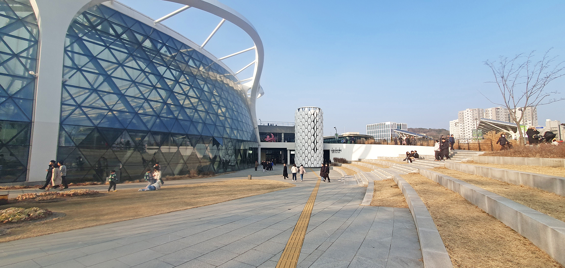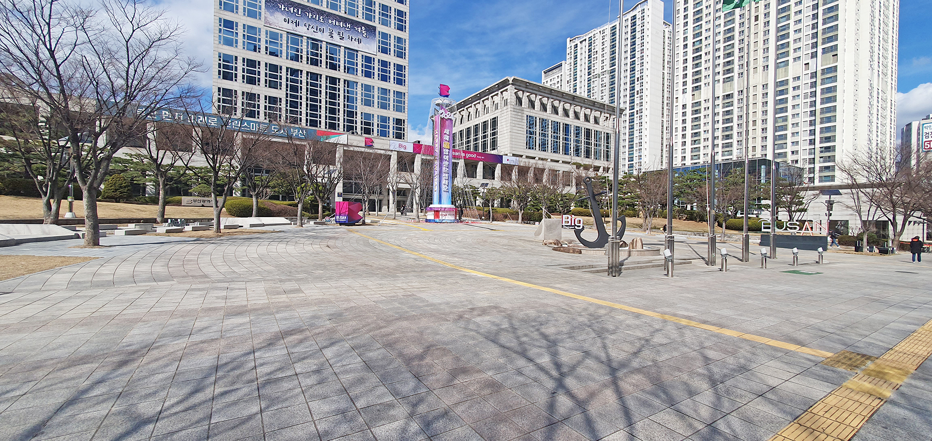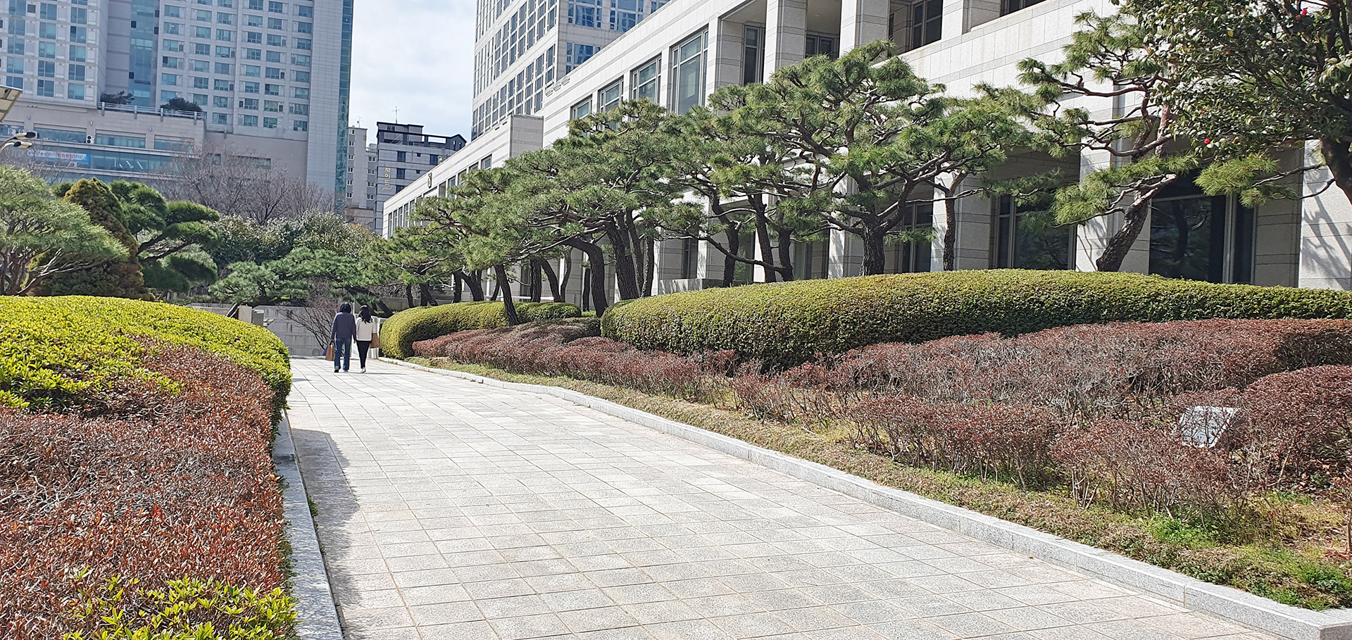 일부러 시간 내서 가보고 싶었지만 겨울철이라 해가 일찍 진다. 연산역 부근의 숙소에서 직선거리로 1km 떨어진 거리에 있지만 저녁밥을 먹고나면 어두워진다. 먼발치에서라도 보려고 점심 먹고 쉬는 시간에 옥상에 올라 가보았다. 옥상에서는 경치가 내다보이지 않기에 24층 휴게실 유리창 너머로 법원단지 부근이 보인다. 거제역과 금정산도 보이는데 정작 보고 싶은 거제1동행정복지센터는 건물에 가려서 보이지 않는다.