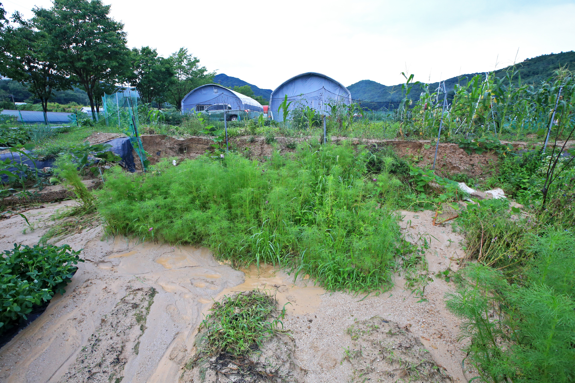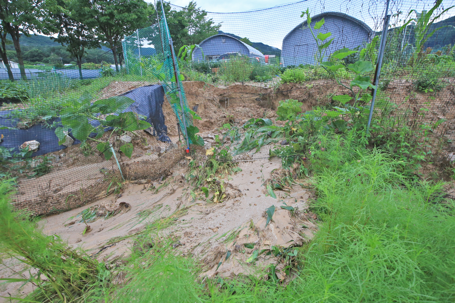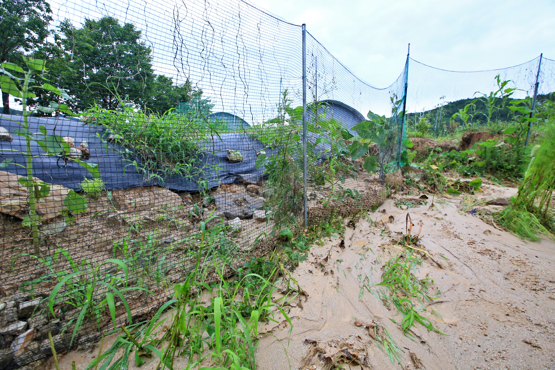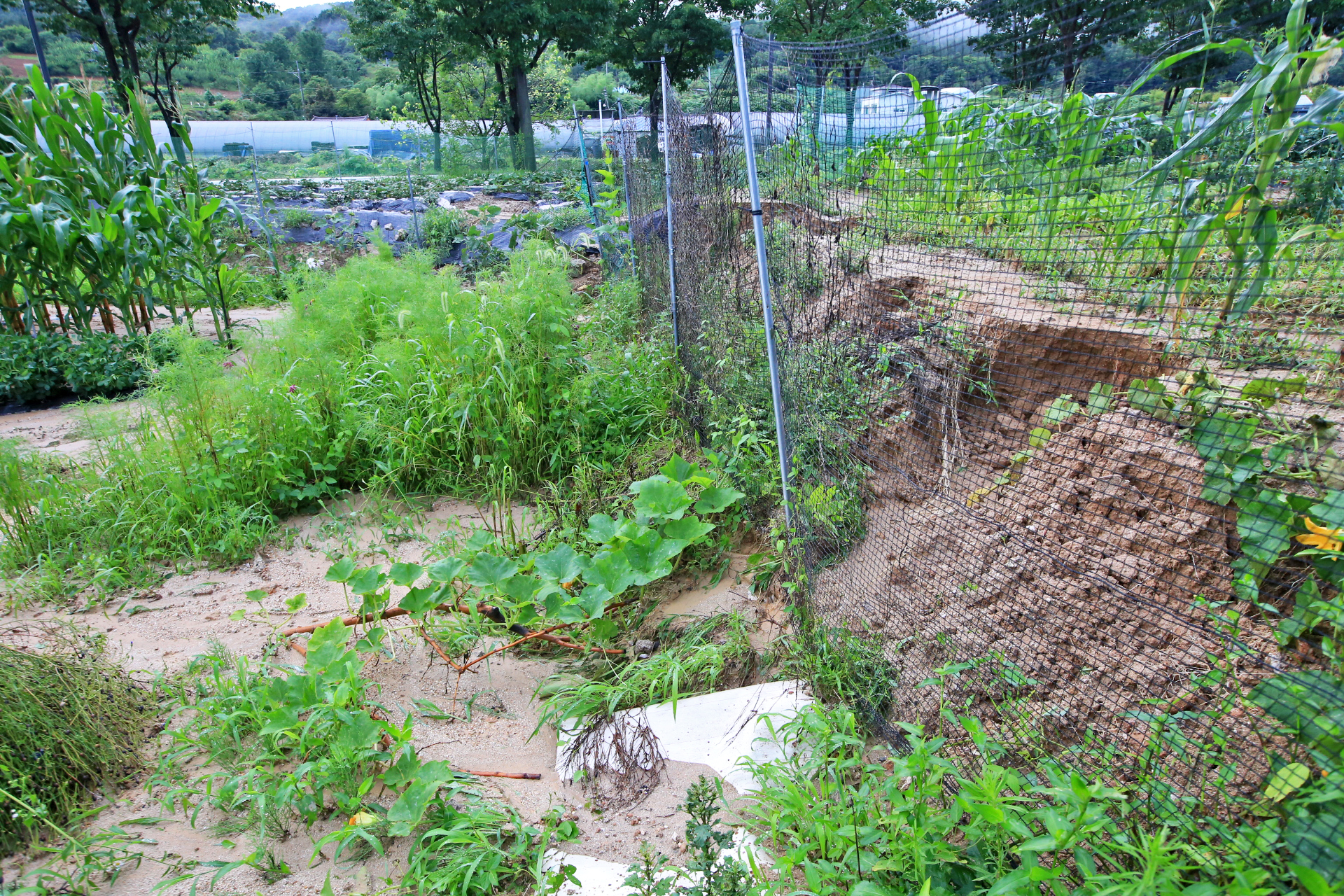 상류 쪽의 밭둑과 배수로가 터지며 앞밭 통로가 침수되어 진흙이 쌓였다.