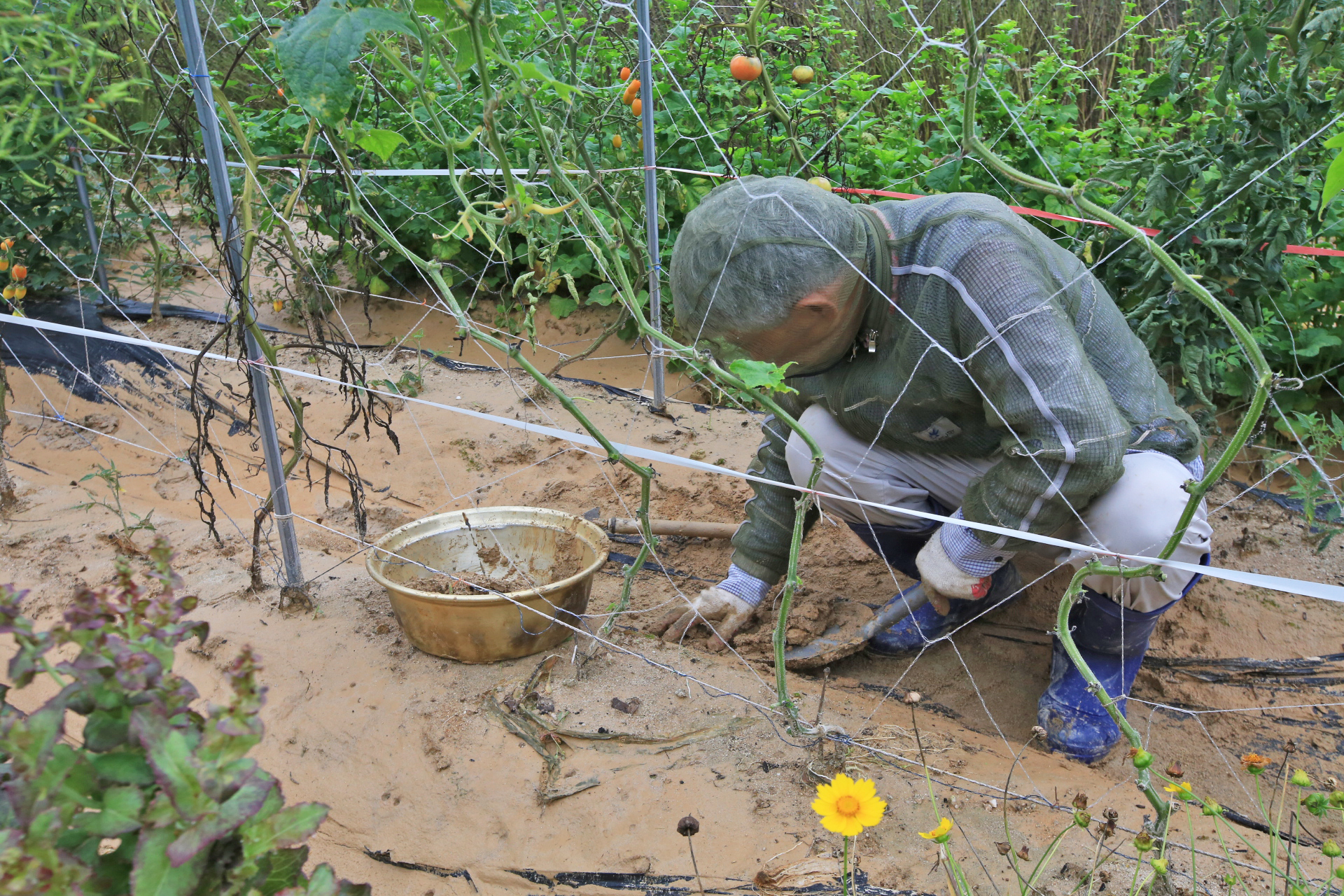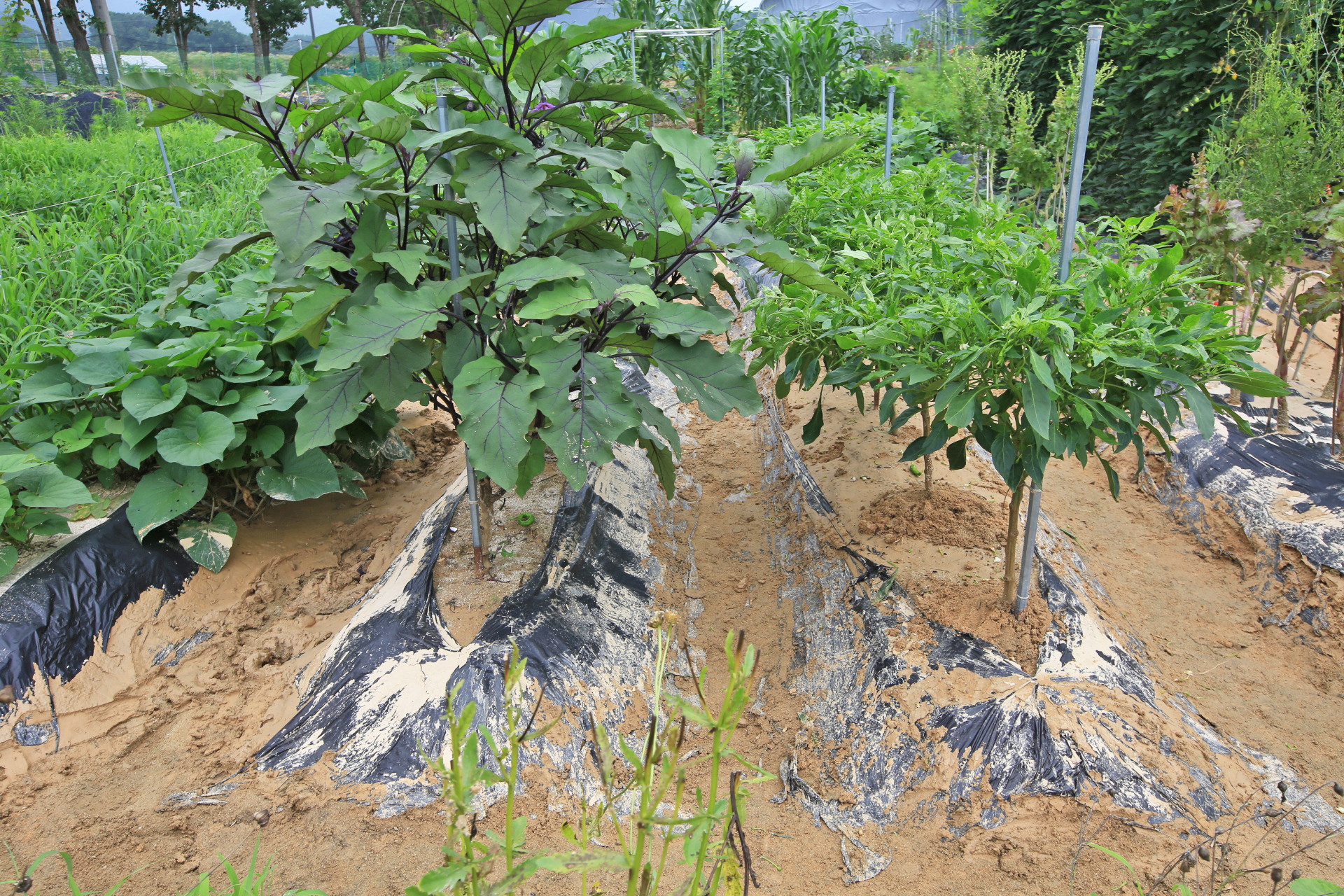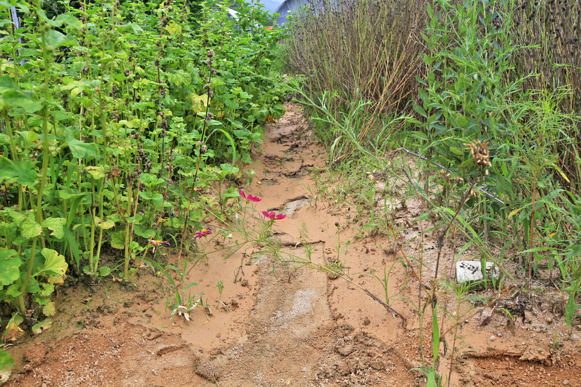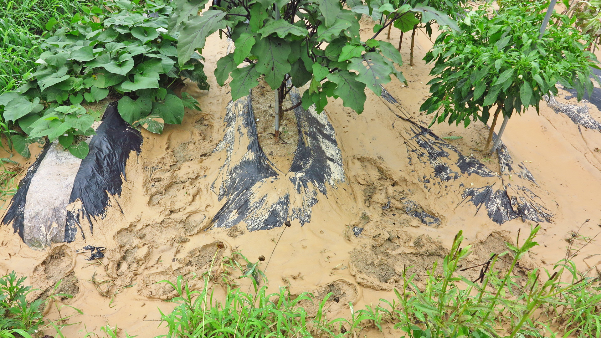 멀칭비닐이 지장을 준다. 그렇지만 어렵더라도 진흙을 제거하지 않는다면 나중에 멀칭비닐을 제거하는데 많은 어려움이 있지 않을까? 고랑에 진흙 뿐 만아니라 흙이 이랑 높이까지 쌓인 상류 쪽은 어차피 농작물을 수확한 이후에나 멀칭비닐 제거가 가능할 테니 걱정스럽다.